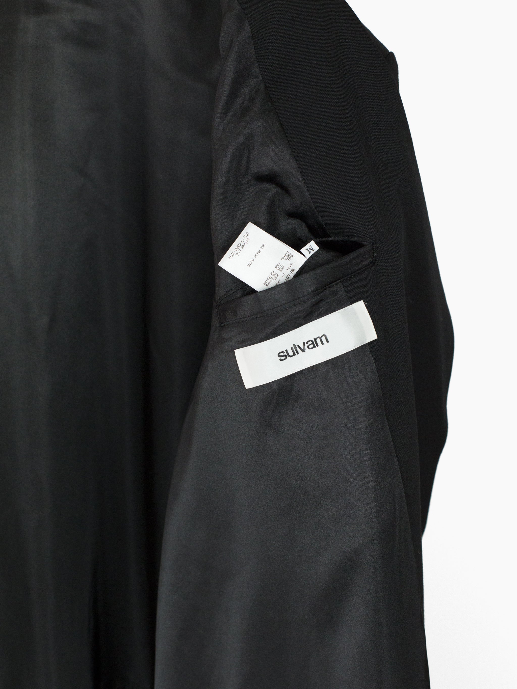 Center button front closure, notch lapel, faux 'flap' pocket construction, asymmetrical darted construction, functional button cuffs, segmented poly/lace full lining and two interior welted chest pockets.
