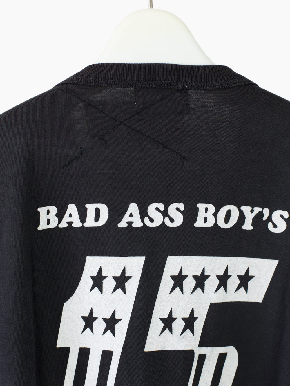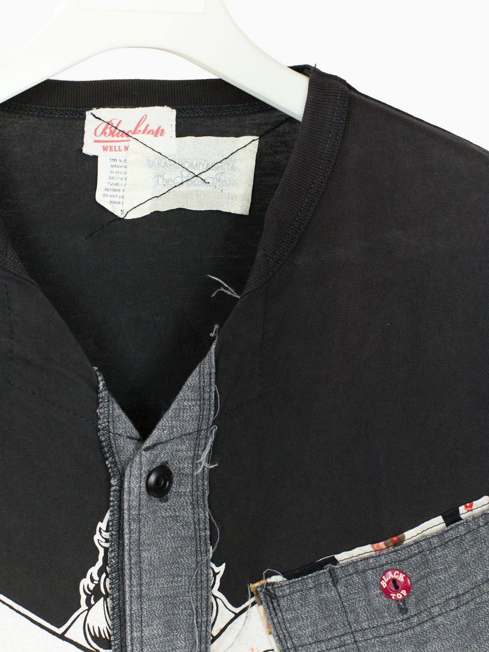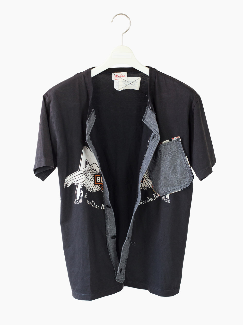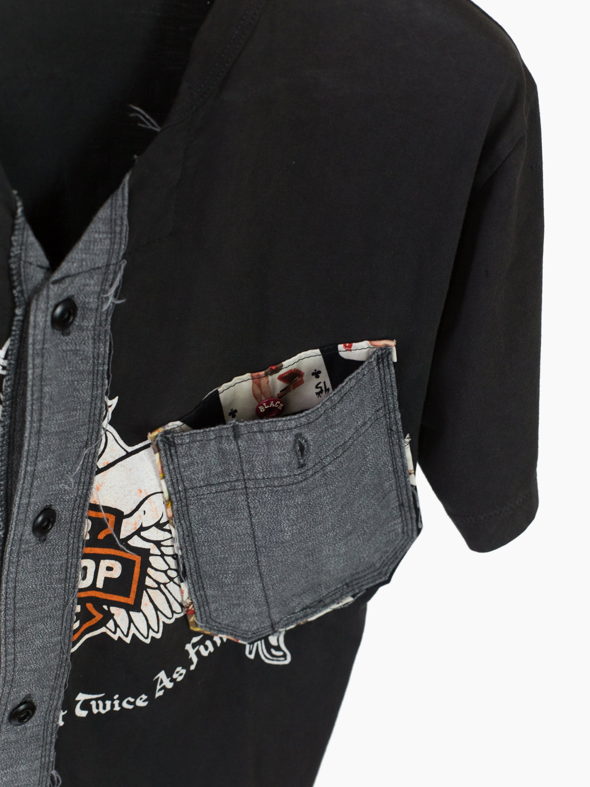 Hand reworked tee, with added placket and collar reconfiguration to give the look of a baseball shirt. Bottom/hem remains connected, retaining the fit and drape of a t-shirt around the waist. Canted asymmetrical chest pocket is sewn atop a deadstock decorative graphic panel printed with playing cards, visible as a thin border or more clearly when pocket is opened. Graphic plays on the Harley Davidson logo and motorcycle aesthetic with a decidedly Japanese twist, with a statemented tagline adorning the back that blends caricaturistic machismo and subtle suggestiveness.