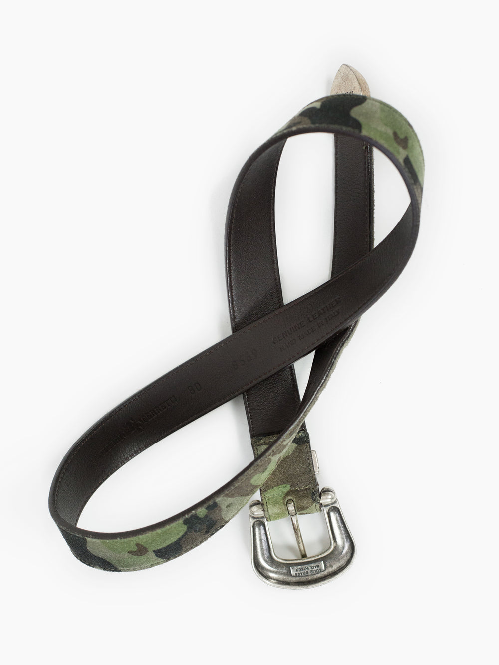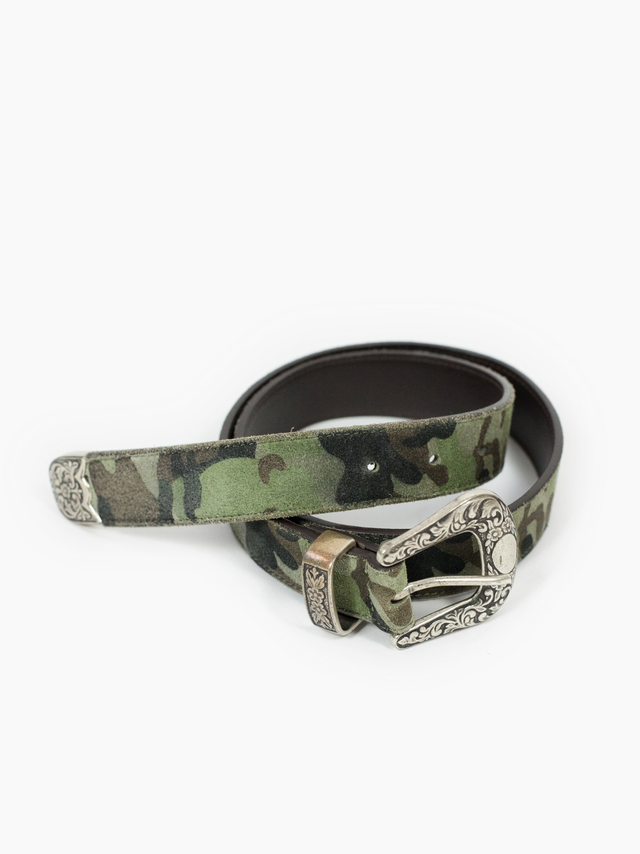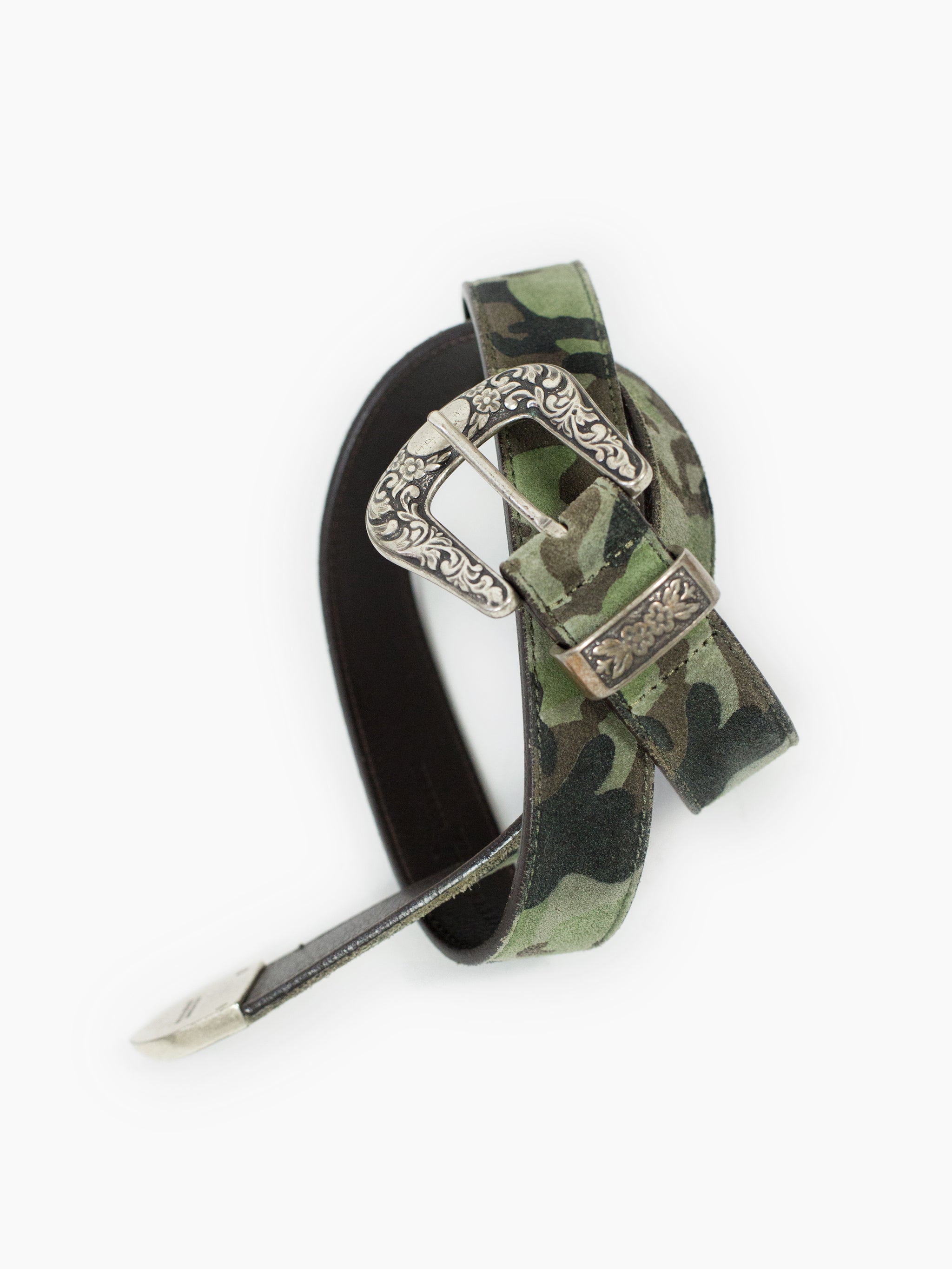 Textured camo suede belt with brown leather lining. Cast brass buckle and tip with aged filigree-style ornamentation.