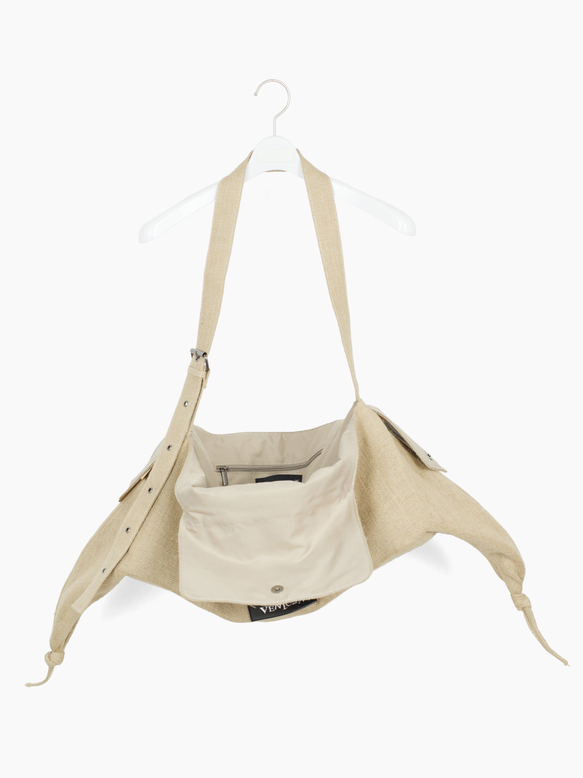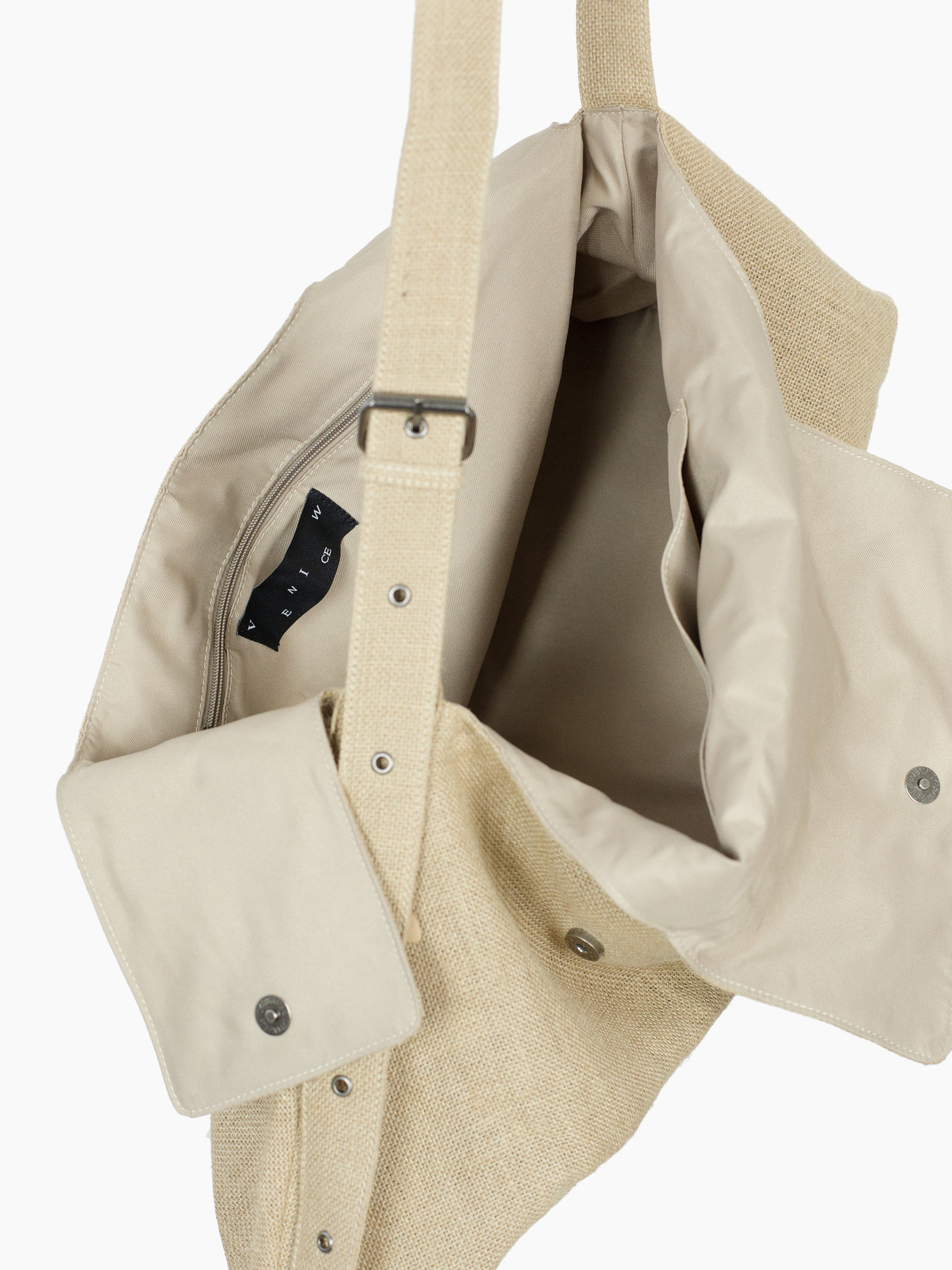 Large flap-top bag with adjustable carry strap in heavy textured natural jute. Magnetic snap closures on each of the 3 flaps. Nylon lined interior with one zippered and one patch pocket.
