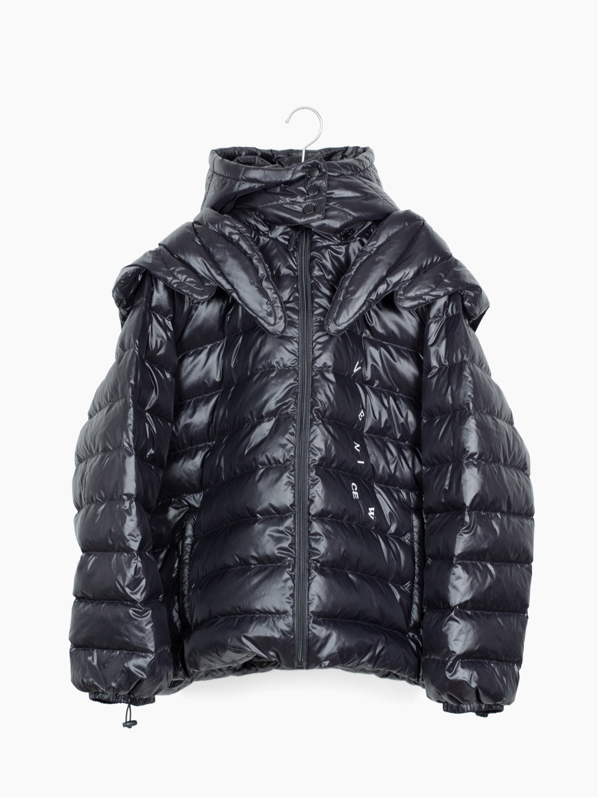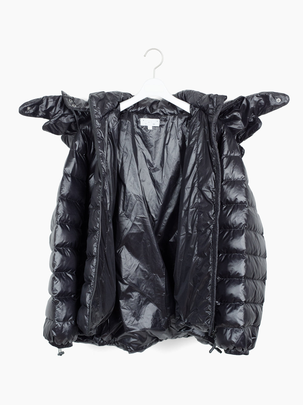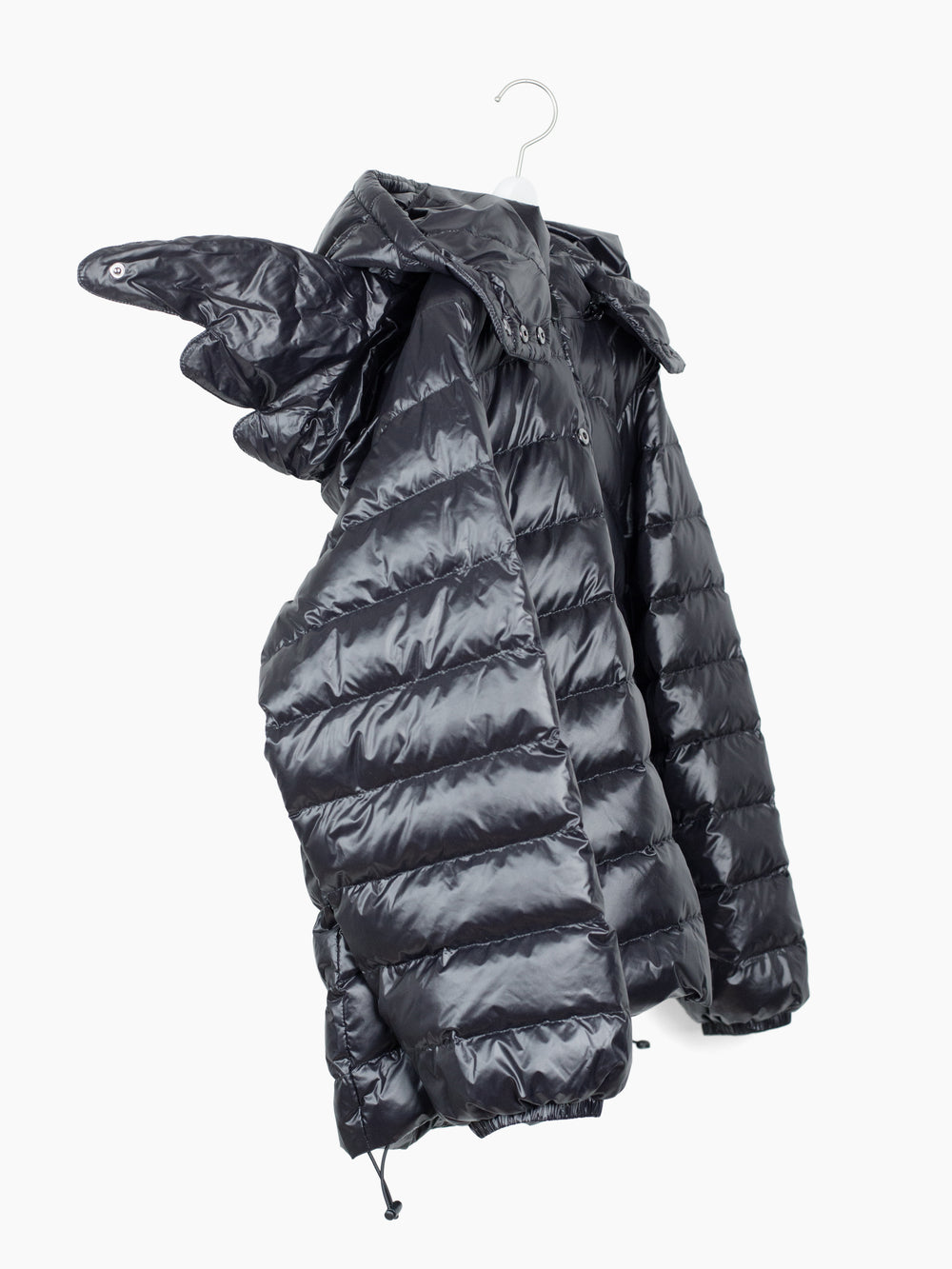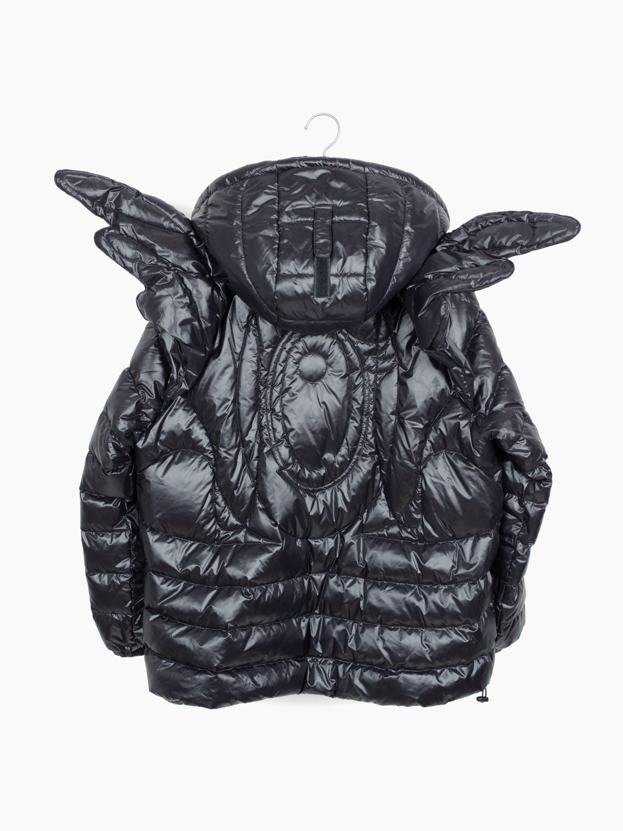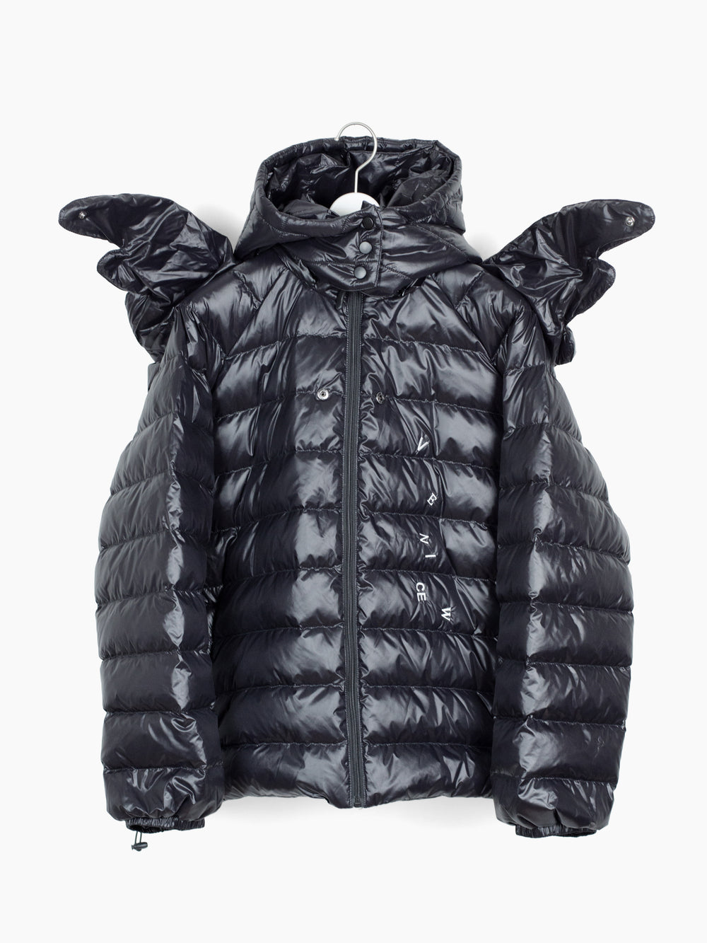Wire-integrated adjustable wings equipped with snaps to secure at mid chest when not unfurled. Zip-off puffer hood. Decorative egg-universe baffle stitching at back.