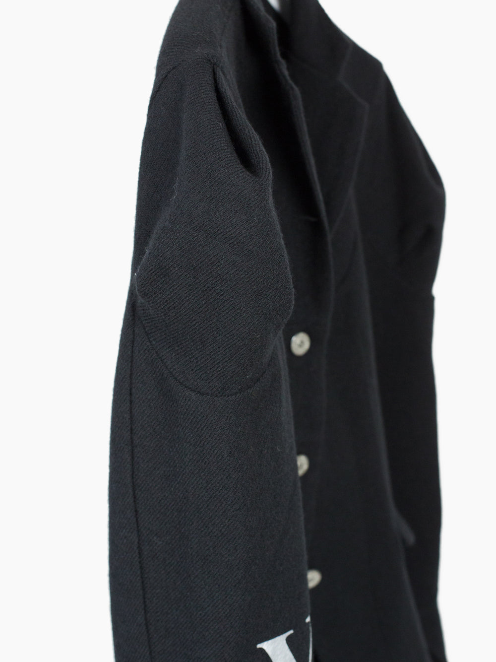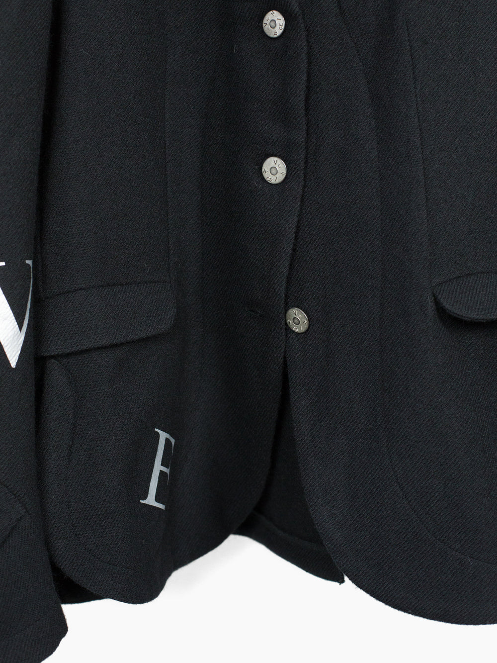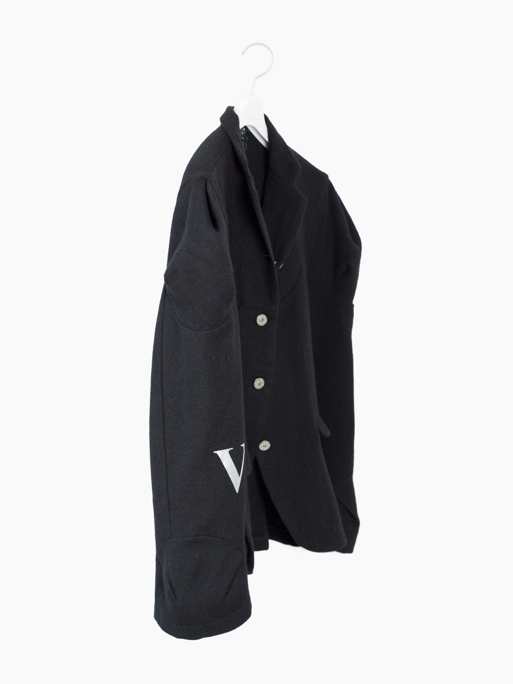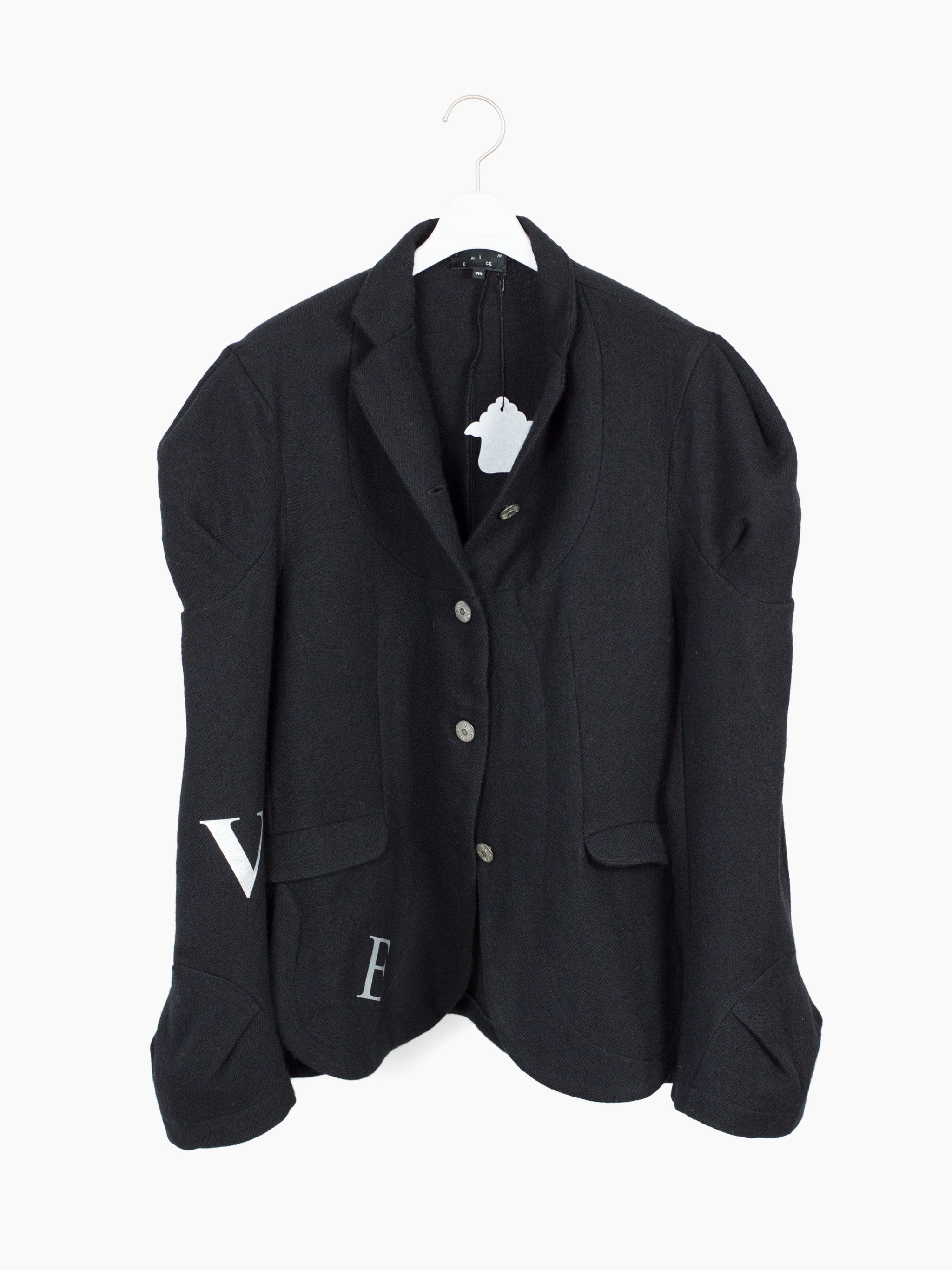 100% merino wool flannel twill unconstructed suit jacket with agendered, pleated 3D shaping panels at shoulder and cuffs. 4 metal shank button front creates convertible lapel/collar. Rounded edges and style lines bring a modern playfulness to a storied traditional garment form. Printed 'V,' 'e,' pair with matching teddy trousers to spell out 'VeniceM' as though the word has been blown apart.