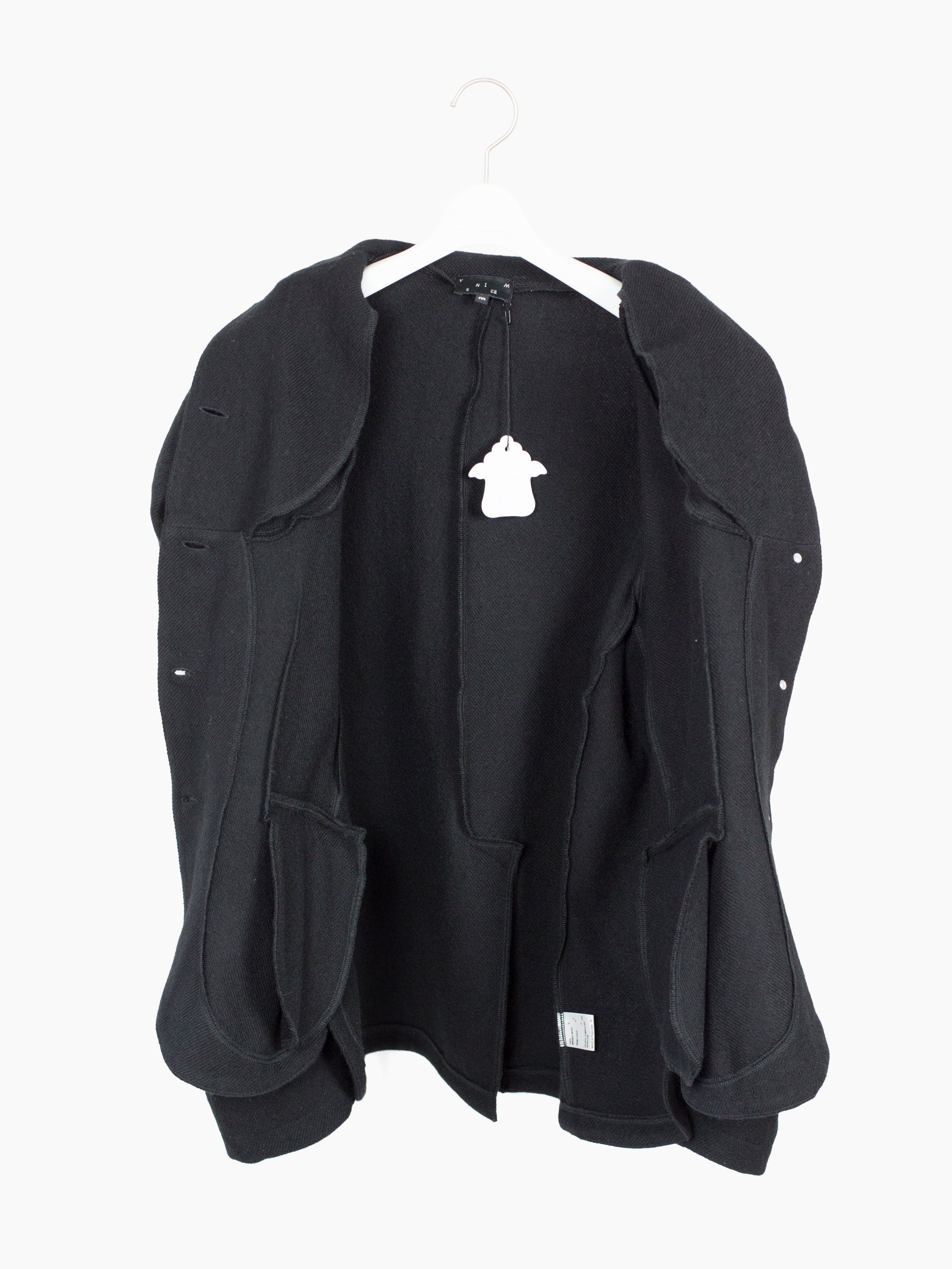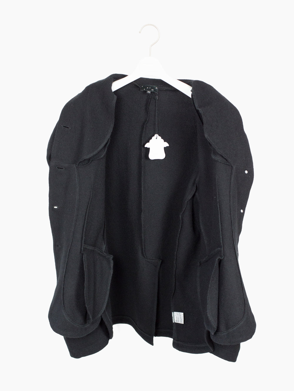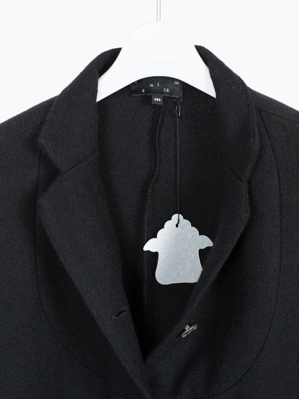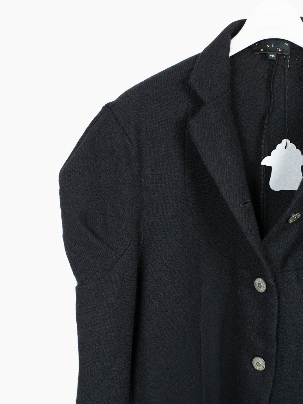 100% merino wool flannel twill unconstructed suit jacket with agendered, pleated 3D shaping panels at shoulder and cuffs. 4 metal shank button front creates convertible lapel/collar. Rounded edges and style lines bring a modern playfulness to a storied traditional garment form. Printed 'V,' 'e,' pair with matching teddy trousers to spell out 'VeniceM' as though the word has been blown apart.