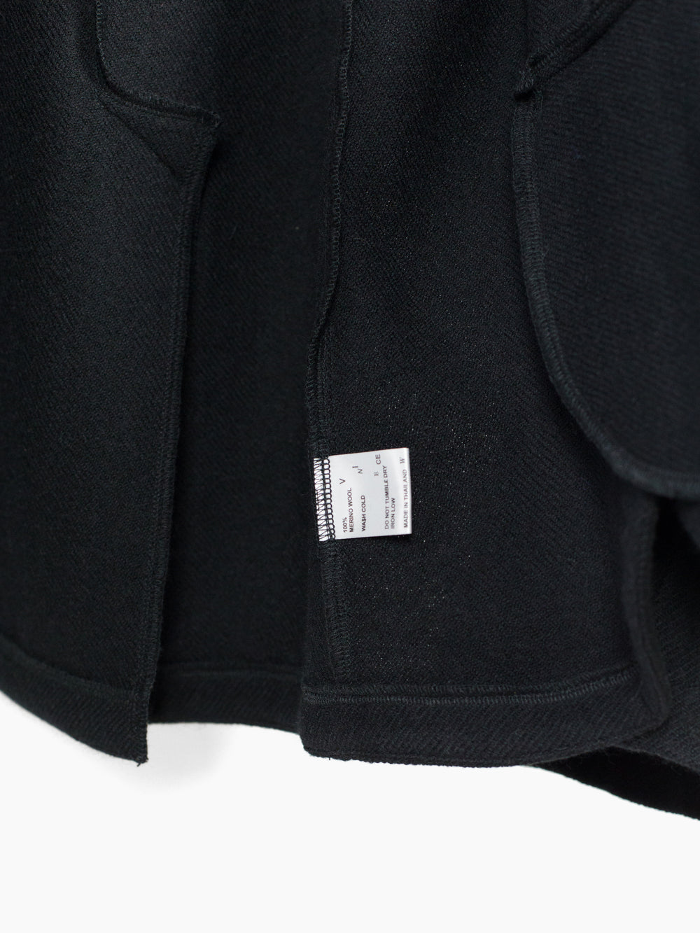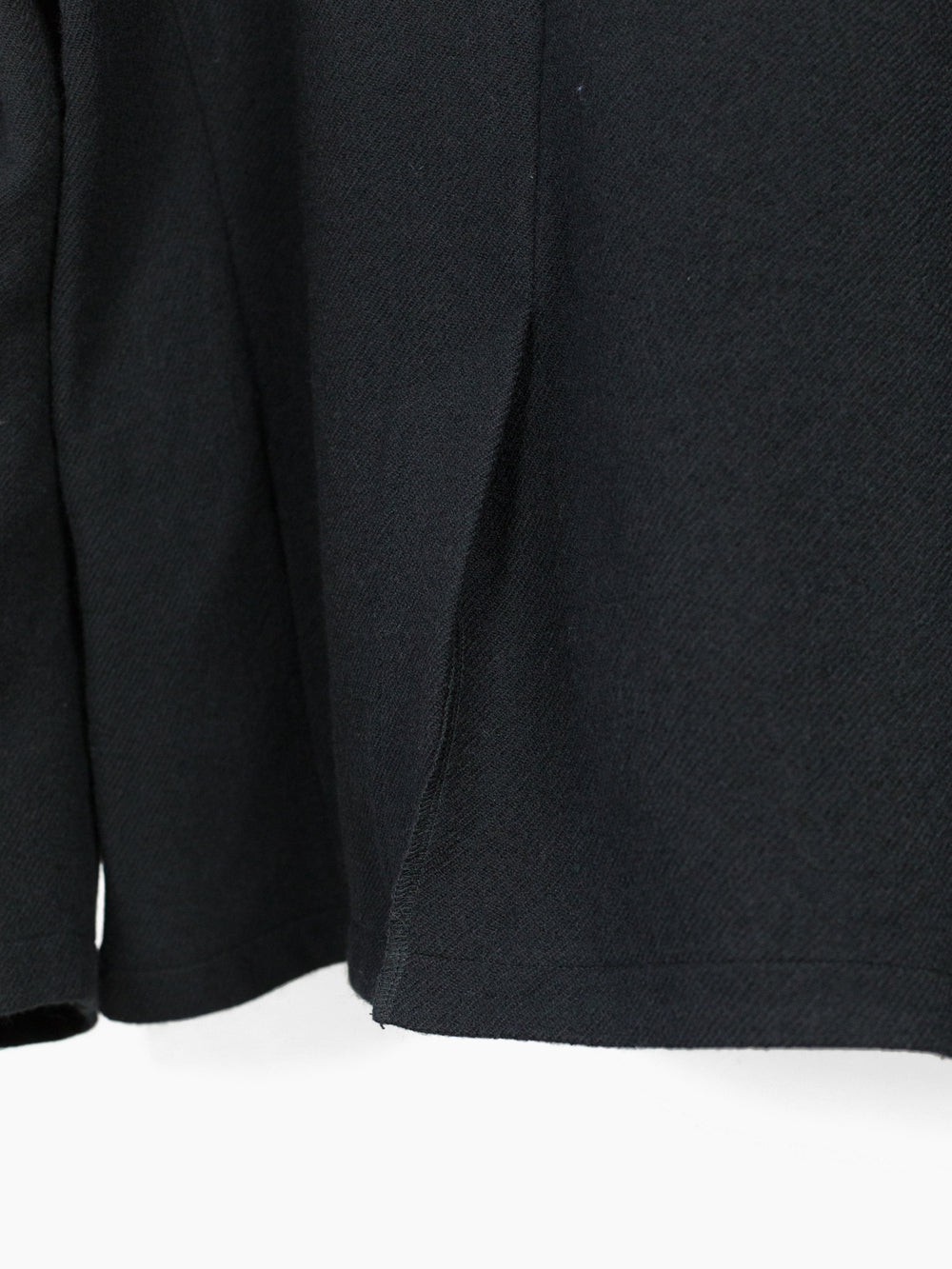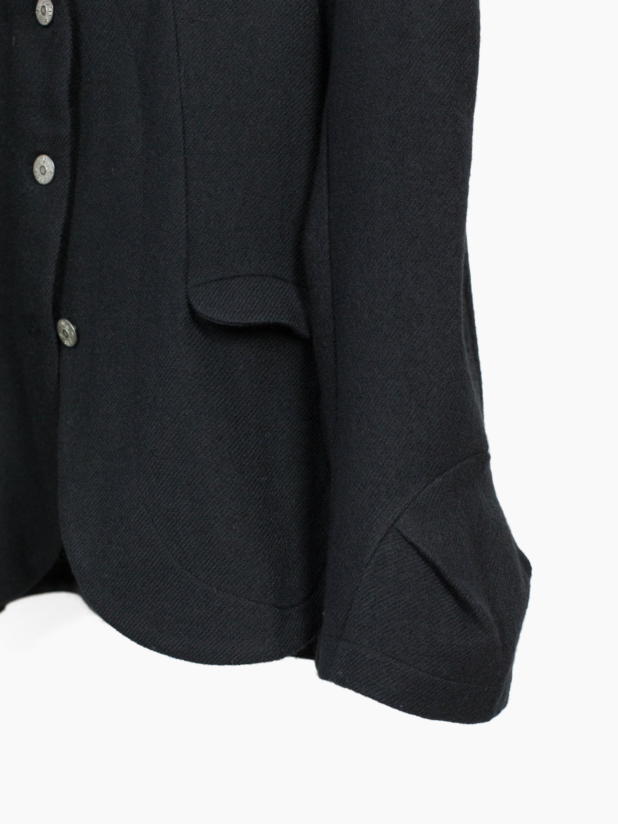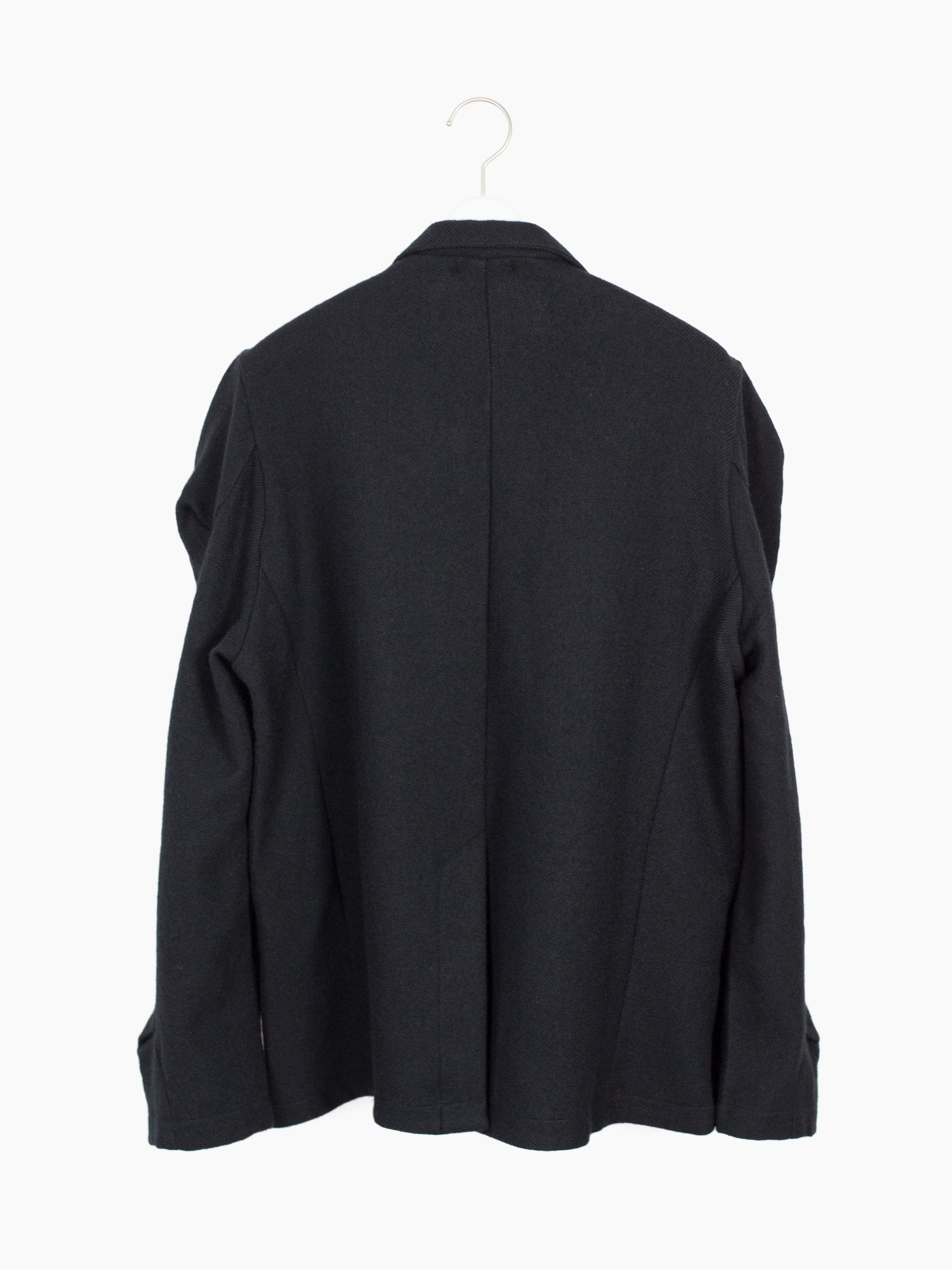 100% merino wool flannel twill unconstructed suit jacket with agendered, pleated 3D shaping panels at shoulder and cuffs. 4 metal shank button front creates convertible lapel/collar. Rounded edges and style lines bring a modern playfulness to a storied traditional garment form. Printed 'V,' 'e,' pair with matching teddy trousers to spell out 'VeniceM' as though the word has been blown apart.