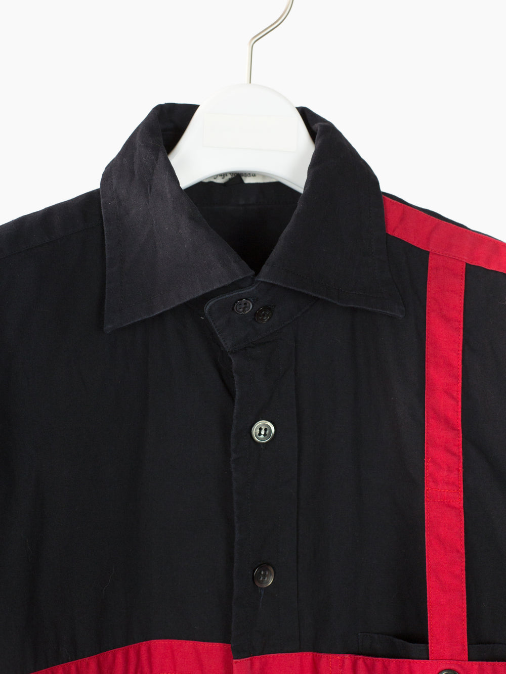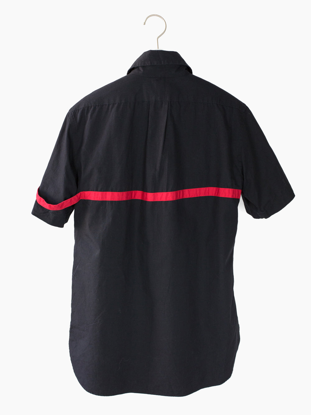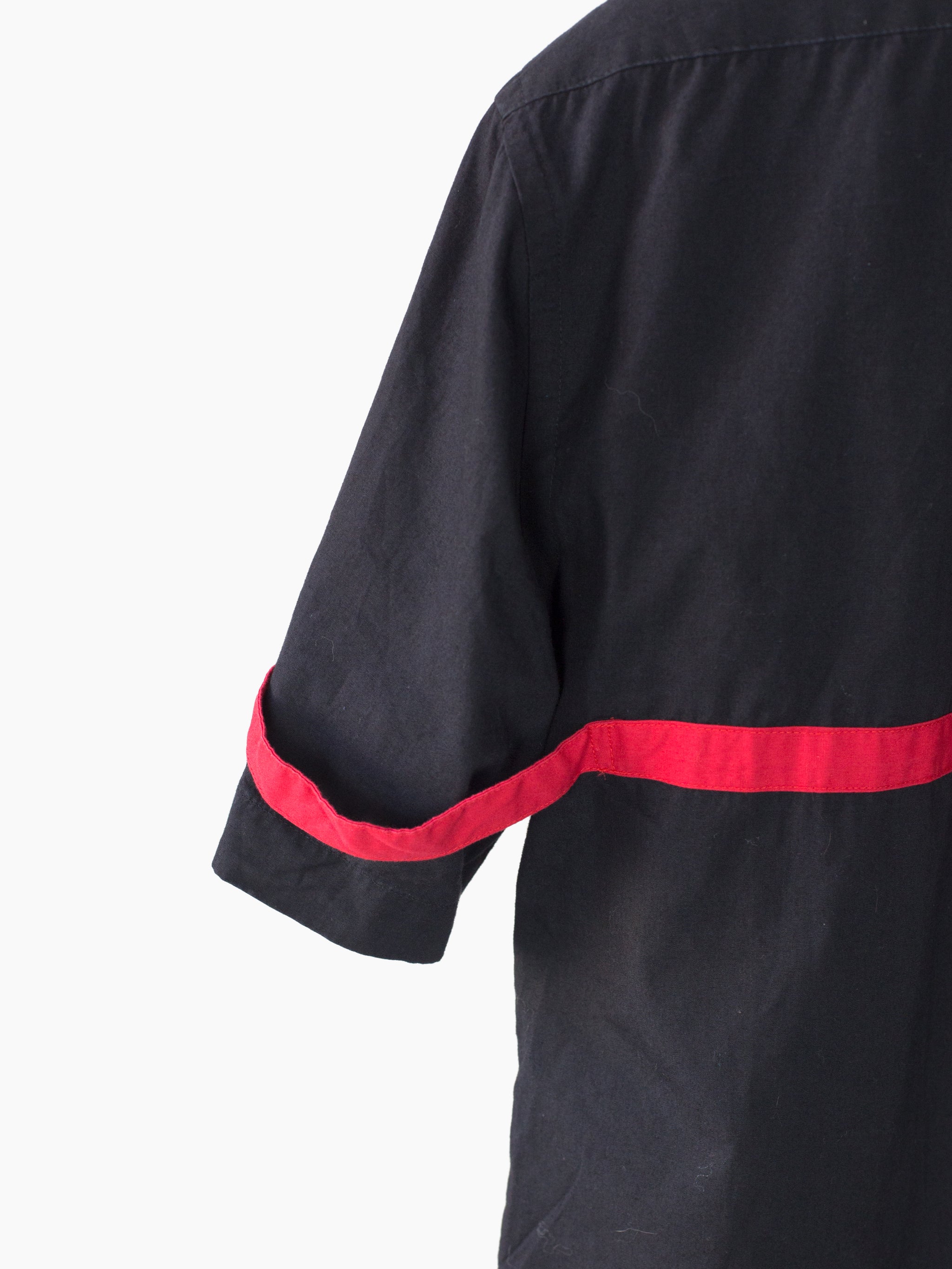 Short sleeve button-up shirt with decorative red bondage cage harness applique. The red strap detaches from the body around the chest pocket and arms to create a floating layered effect, with a d-ring clasp and a hook at the hem and arm for various styling possibilities. Asymmetrical collar closure with two offset buttons creates a subtle off-kilter atmosphere.