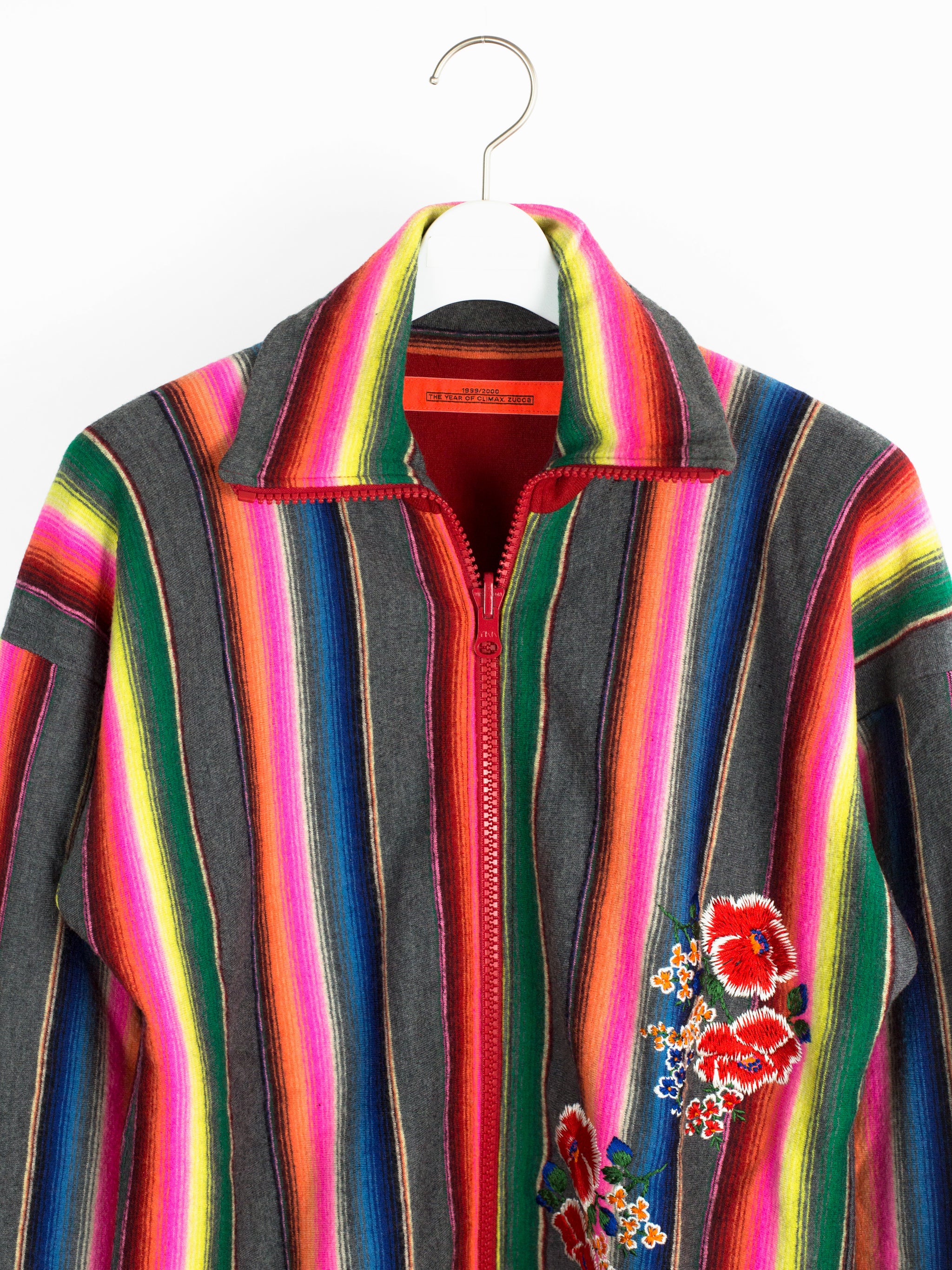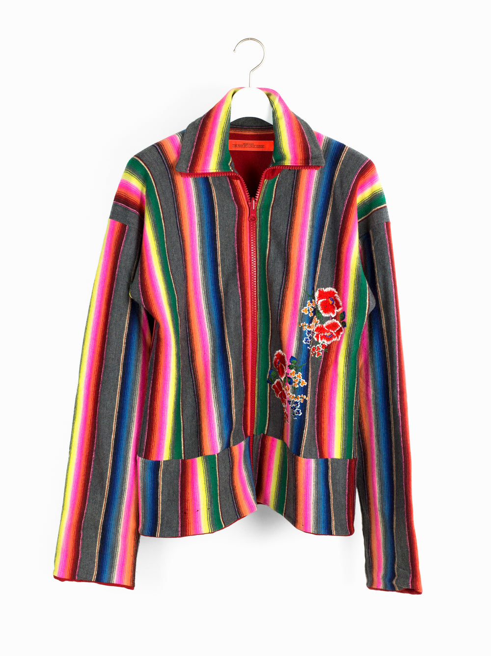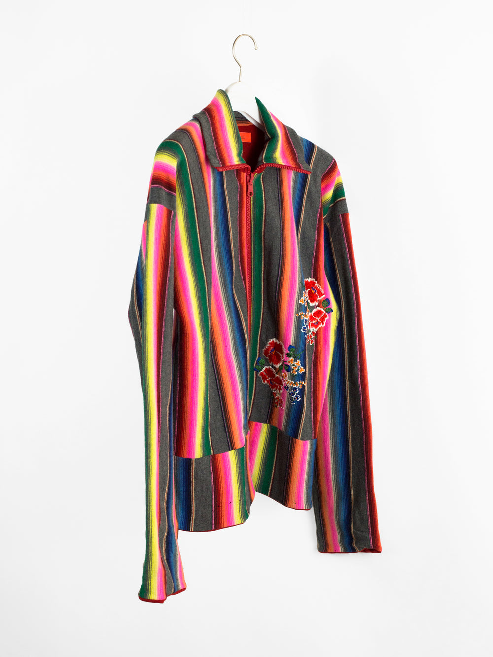 Reversible zip sweater from Japanese label Zucca. This piece from 1999 features a linear multicolor design reminiscent of Gerhard Richter paintings and a statement floral embroidery at the wearer's front left. Fully reversible, the opposite face is plain red with small drop waist pockets.