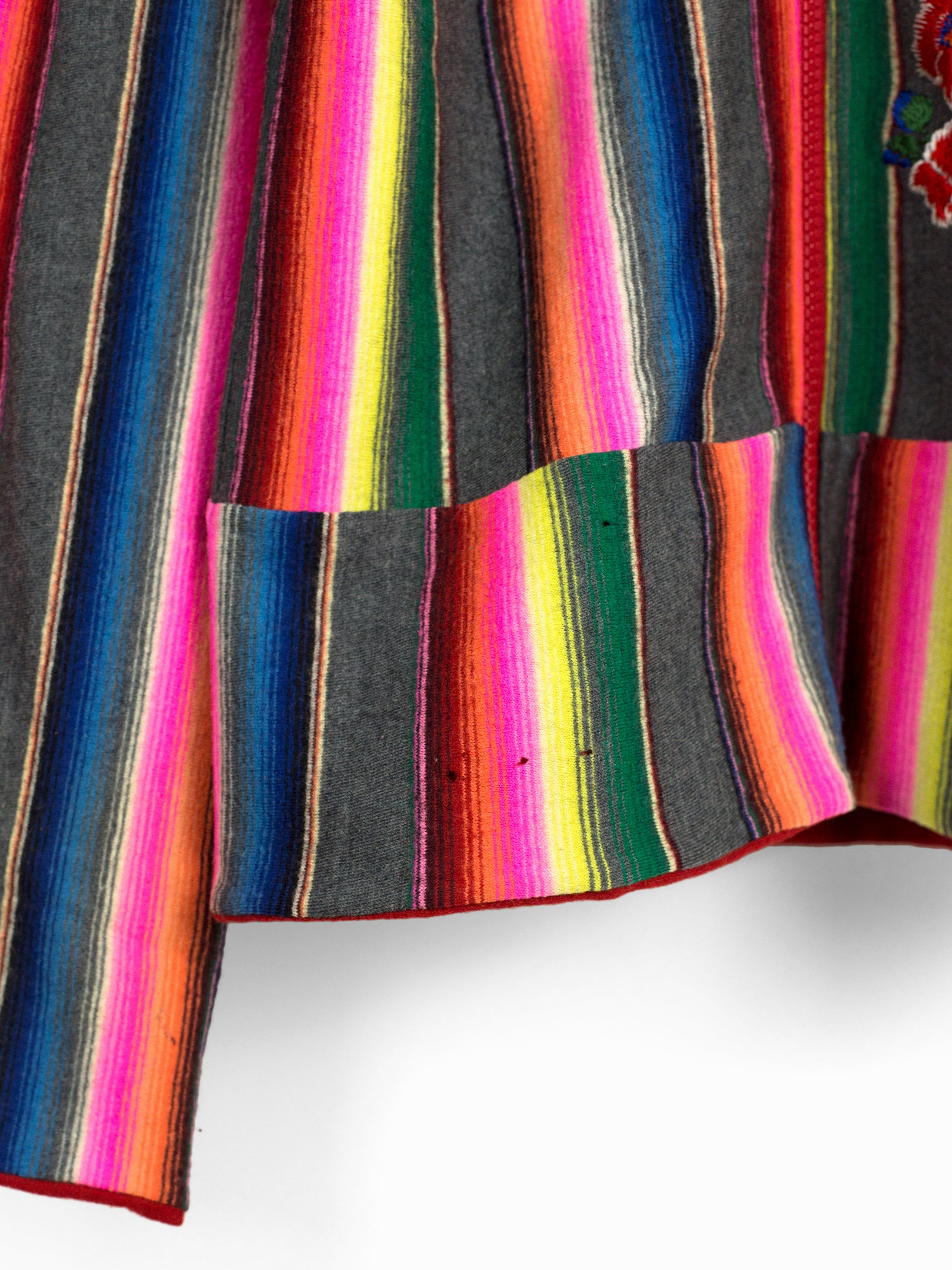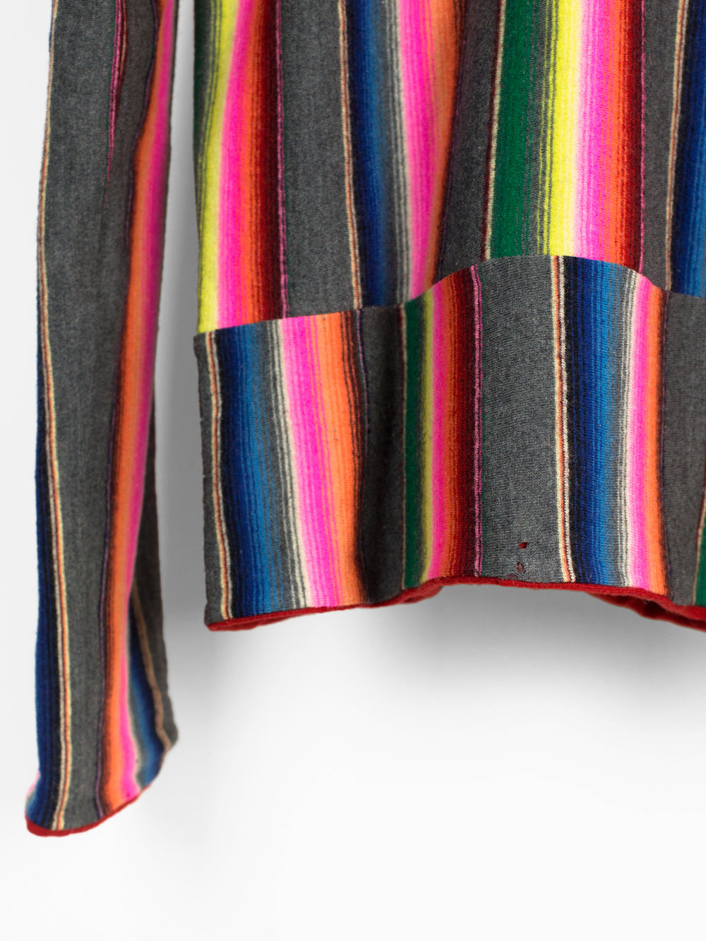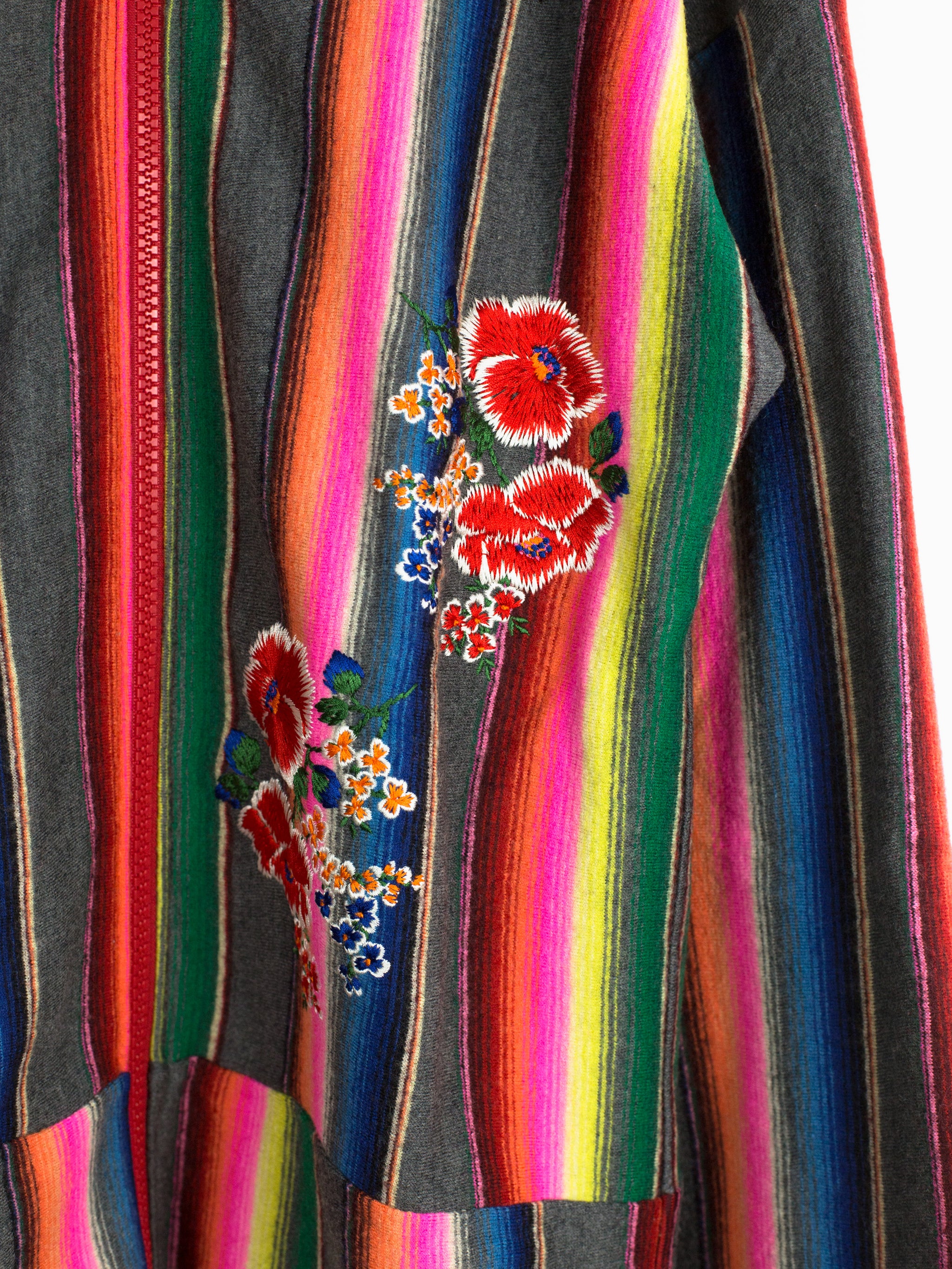 Reversible zip sweater from Japanese label Zucca. This piece from 1999 features a linear multicolor design reminiscent of Gerhard Richter paintings and a statement floral embroidery at the wearer's front left. Fully reversible, the opposite face is plain red with small drop waist pockets.
