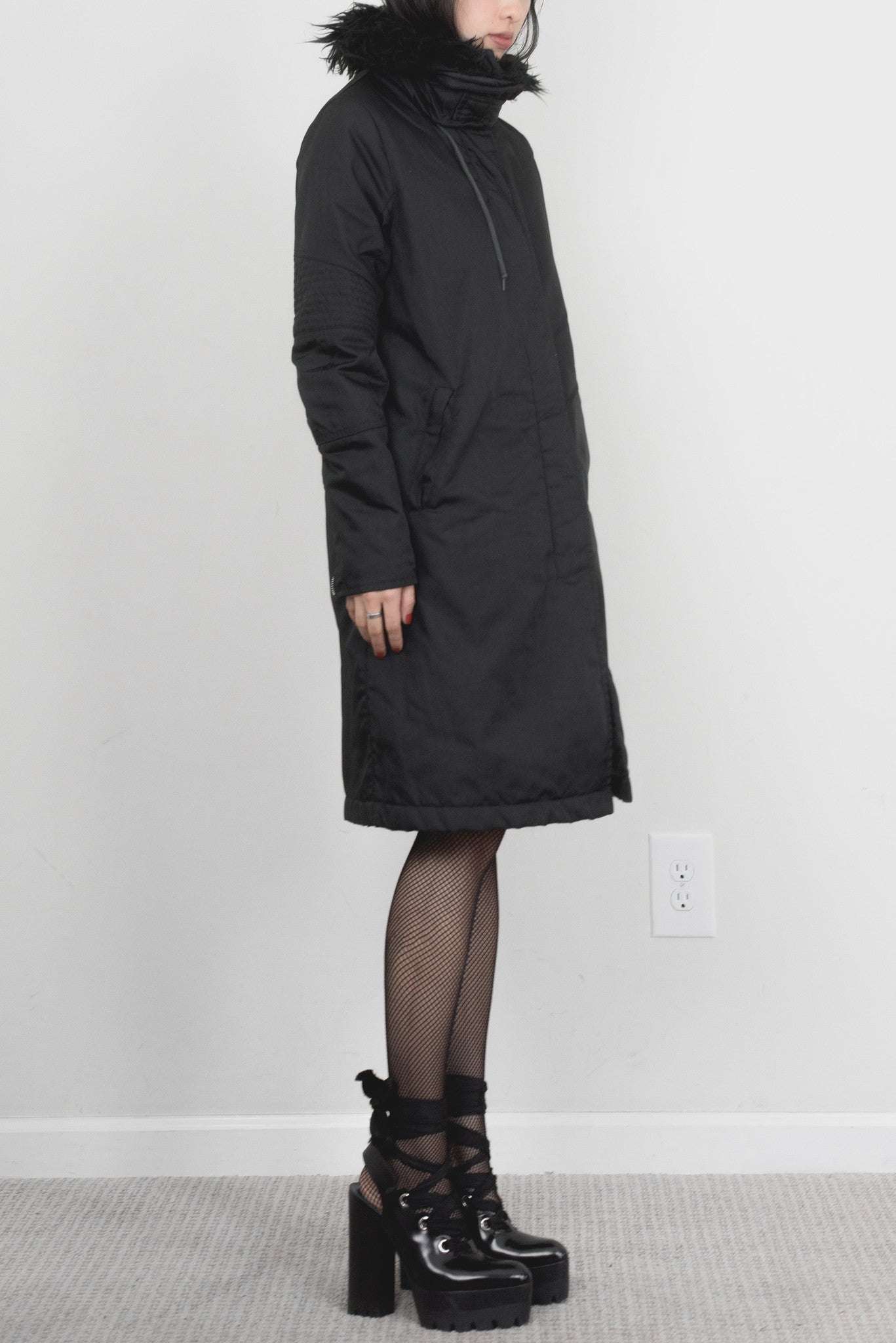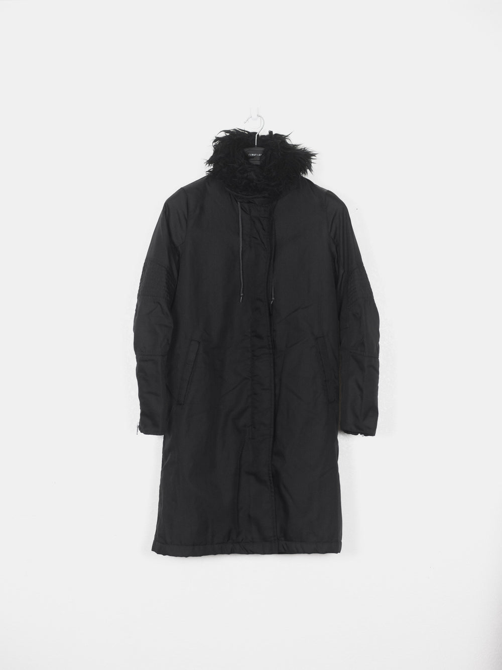 Features a wire-adjustable collar, removable faux fur, bondage carry straps, interior thigh straps, and biker detailing, and interior chest pocket. It is lightly insulated but since this is a women's cut, there is less bulk, especially in the sleeves, which hug the arms tighter than on a men's version. Fits a men's XS-S or women's S-M