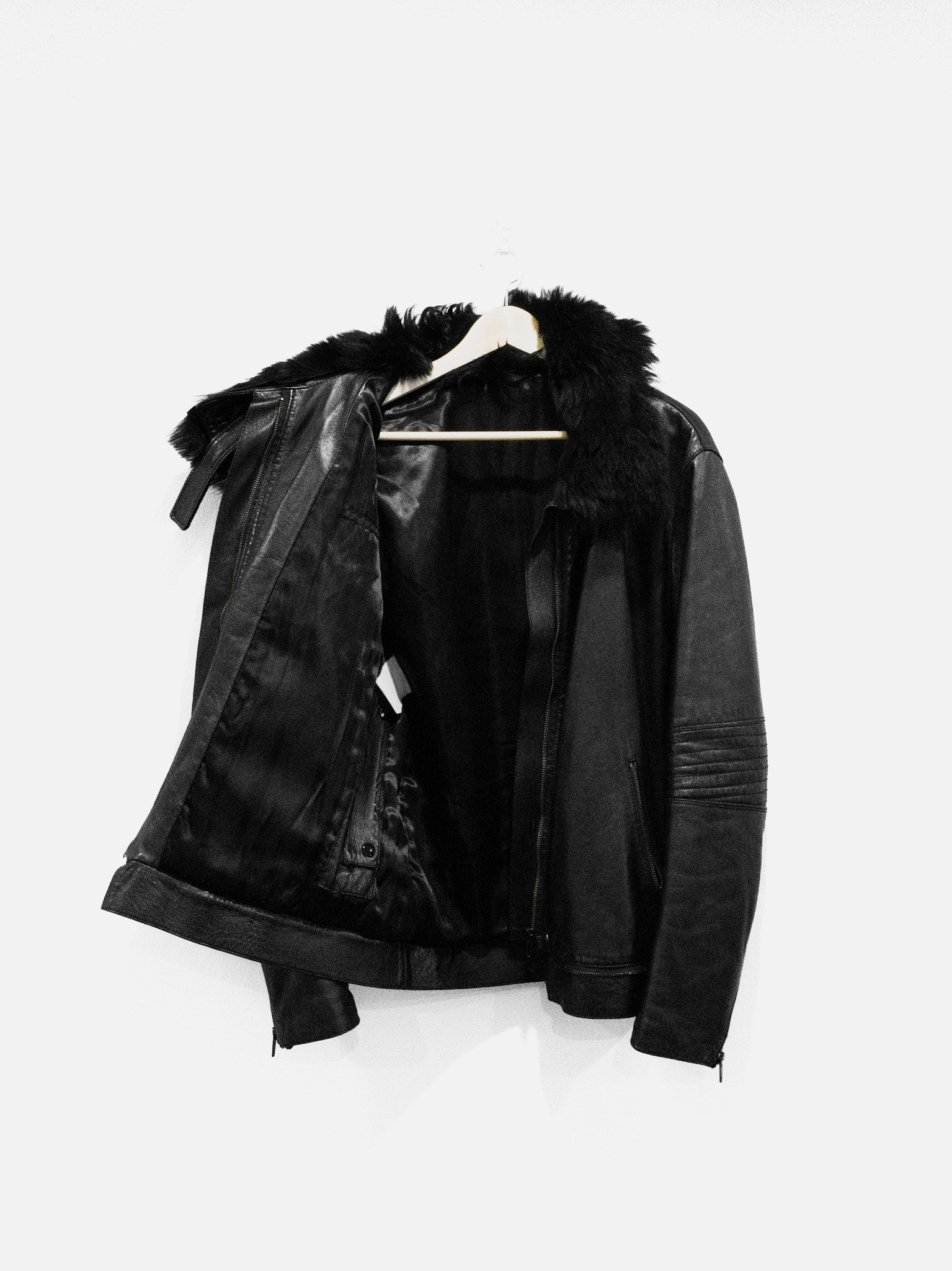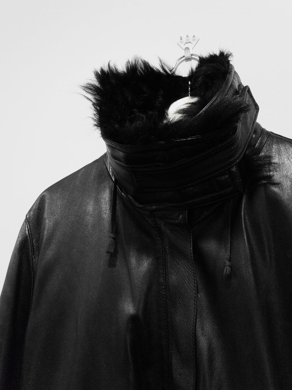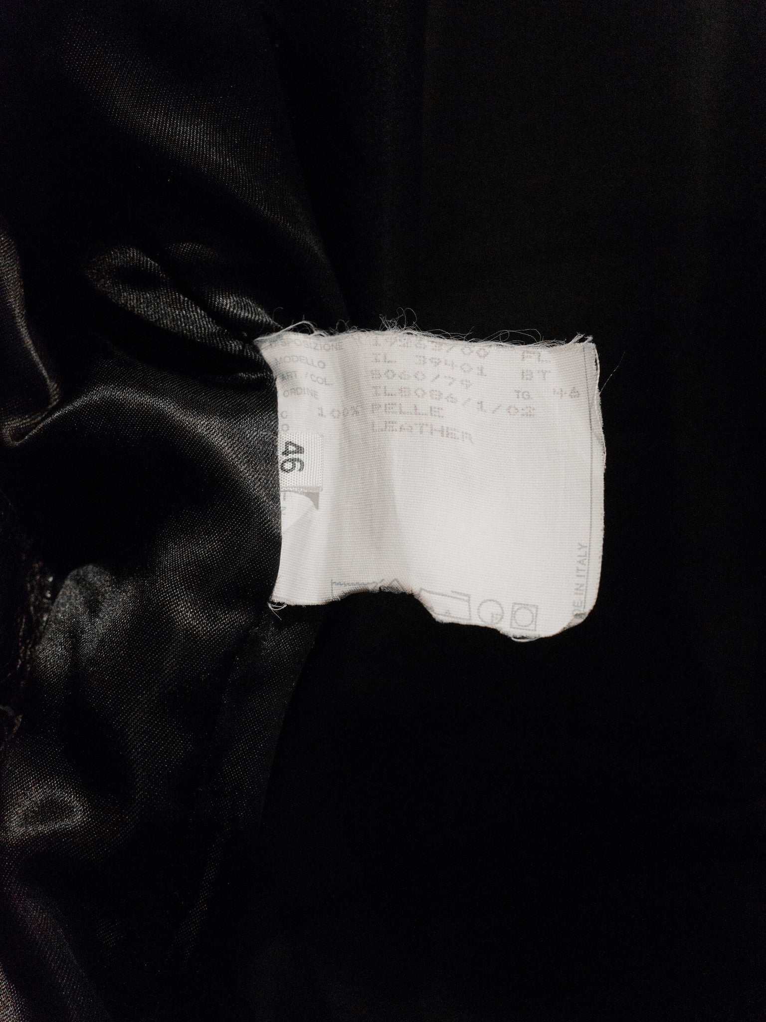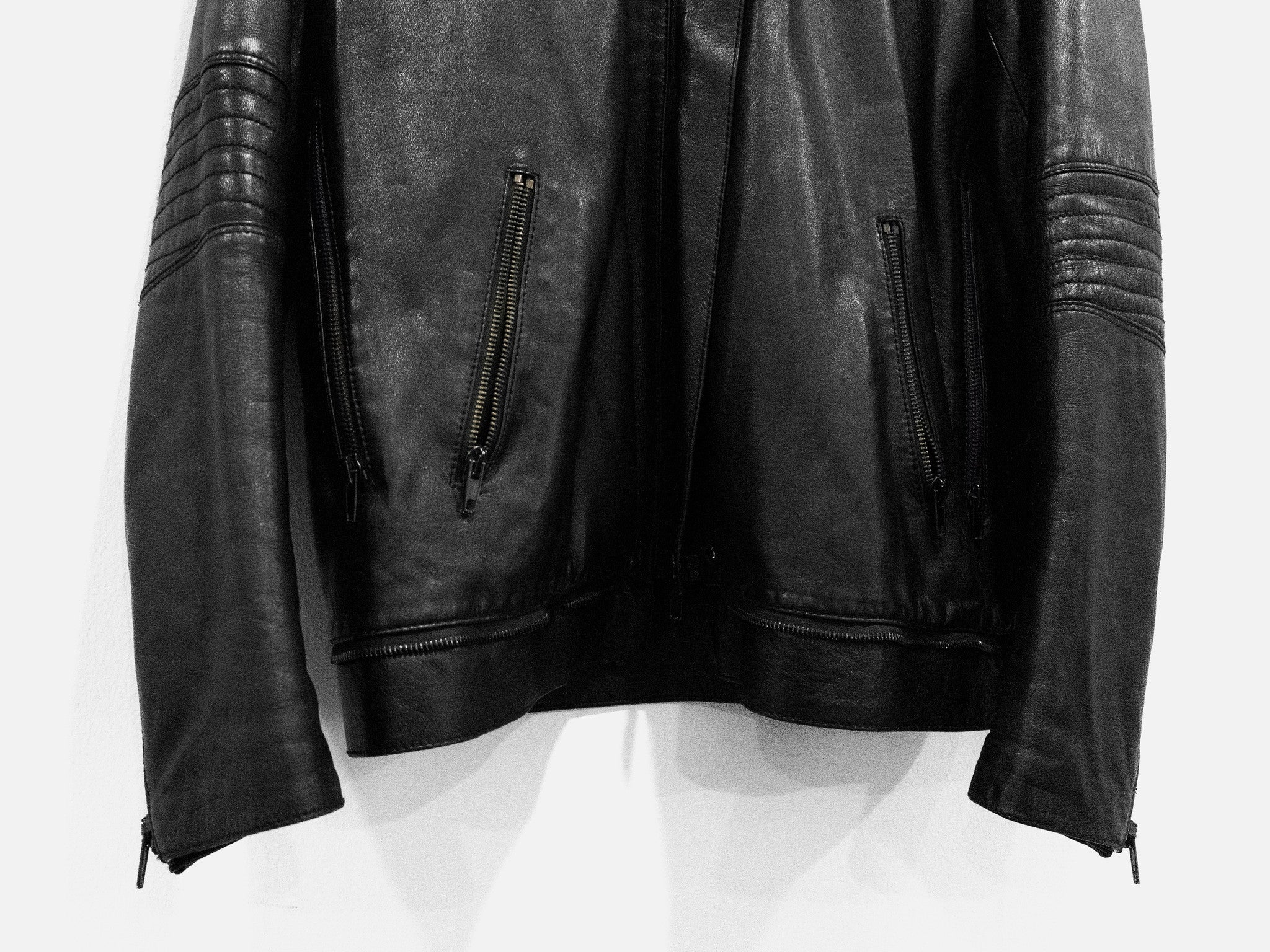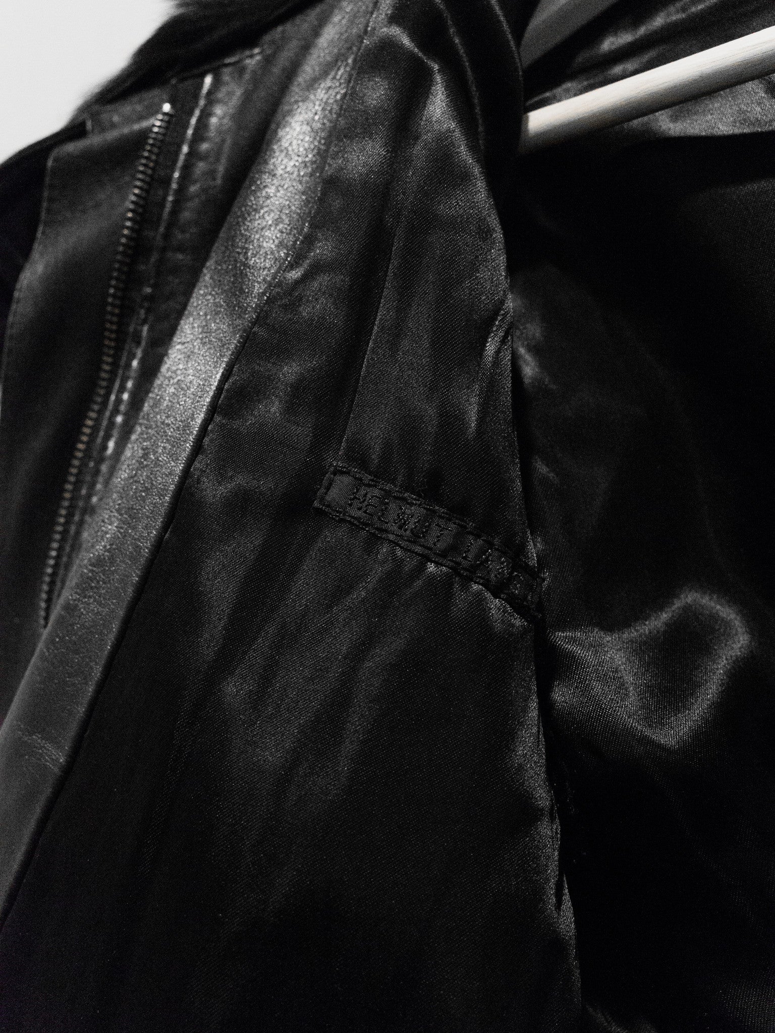 An amazing black leather iteration of Helmut’s iconic AW99 Astro Biker. In an incredibly supple black lamb that glistens in the light, this particular one is cut with a slimmer profile and sharper sleeves than the bulkier moleskin/ballistic ones. Still filled with a thin layer of insulation for warmth, this is a piece that will serve its wearer with grace for years. Finished with gunmetal MRS zipper teeth and enamel coated black zips. This is THE ultimate black leather jacket.