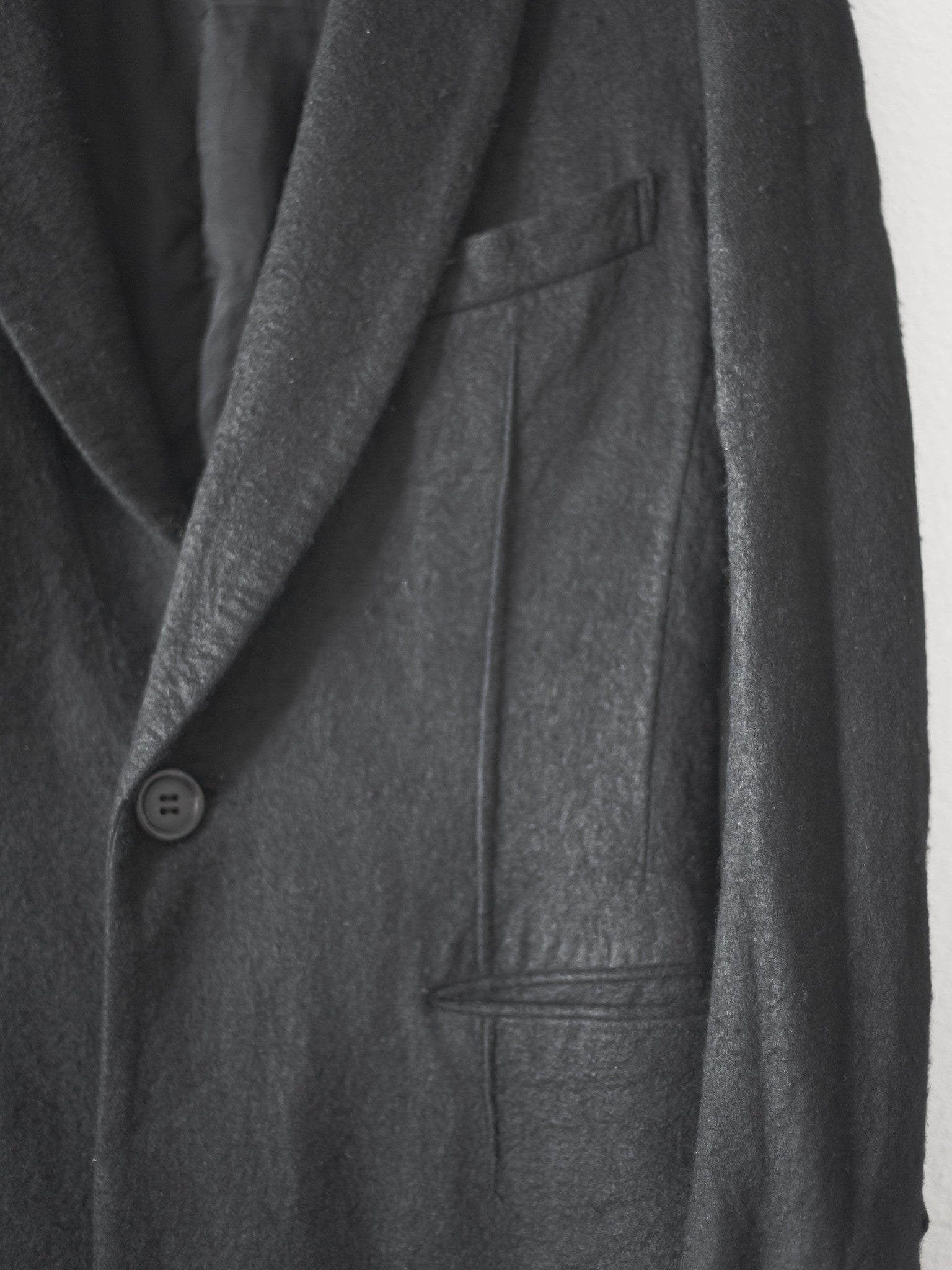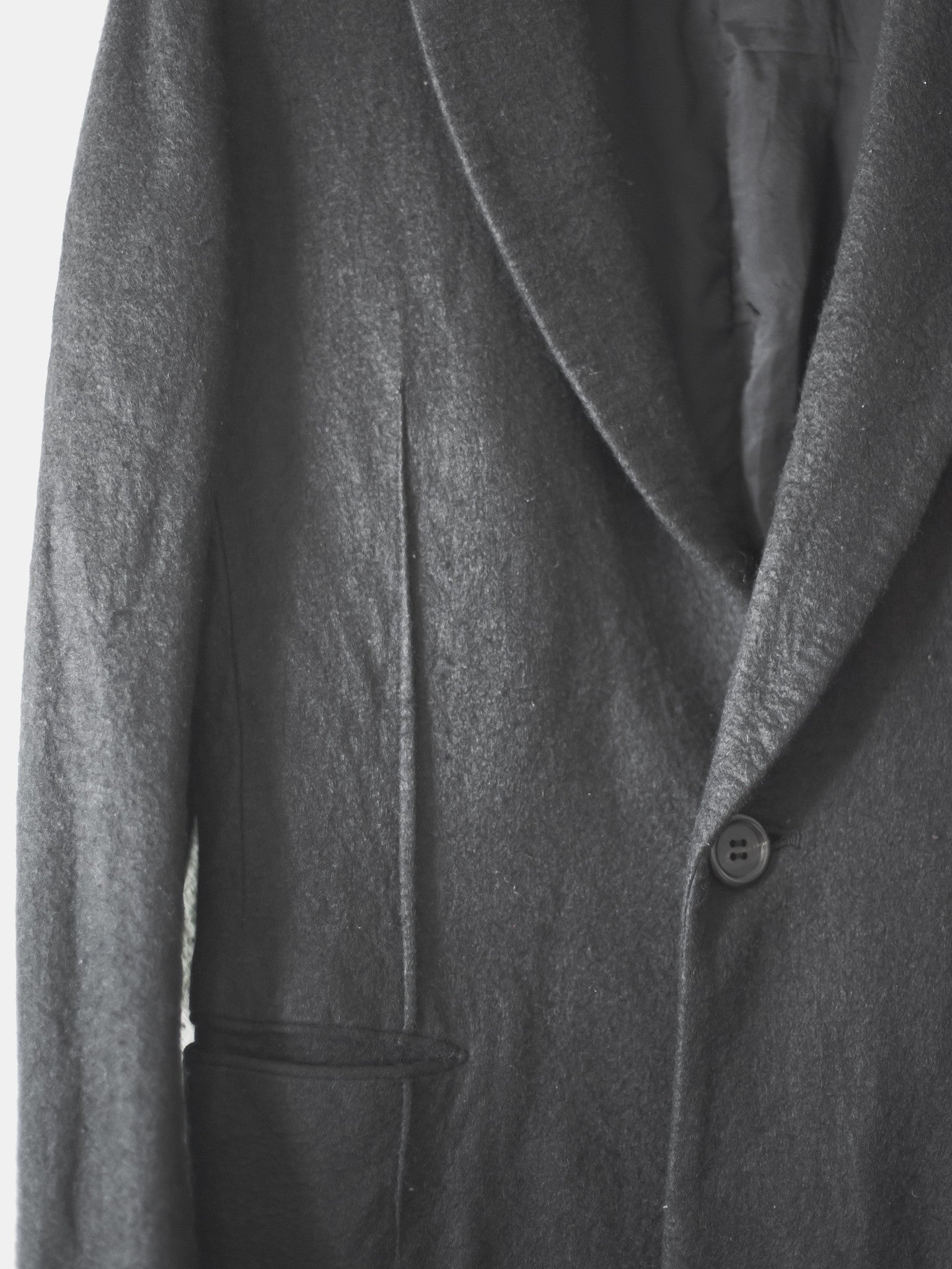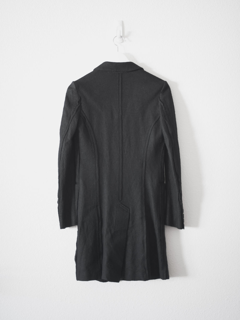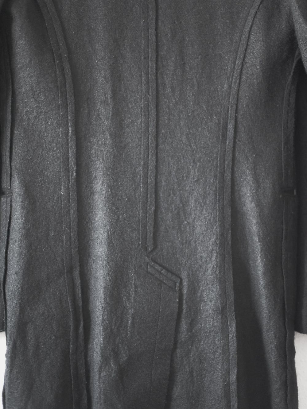Rare chester coat from 05AW "Arts & Crafts", featuring the season's signature lightweight felted wool construction. Details include craft cut back seams, full cupro lining, and three internal chest pockets in addition to three outer pockets. Made in Japan. 8.5/10 condition, some pilling on the felt.