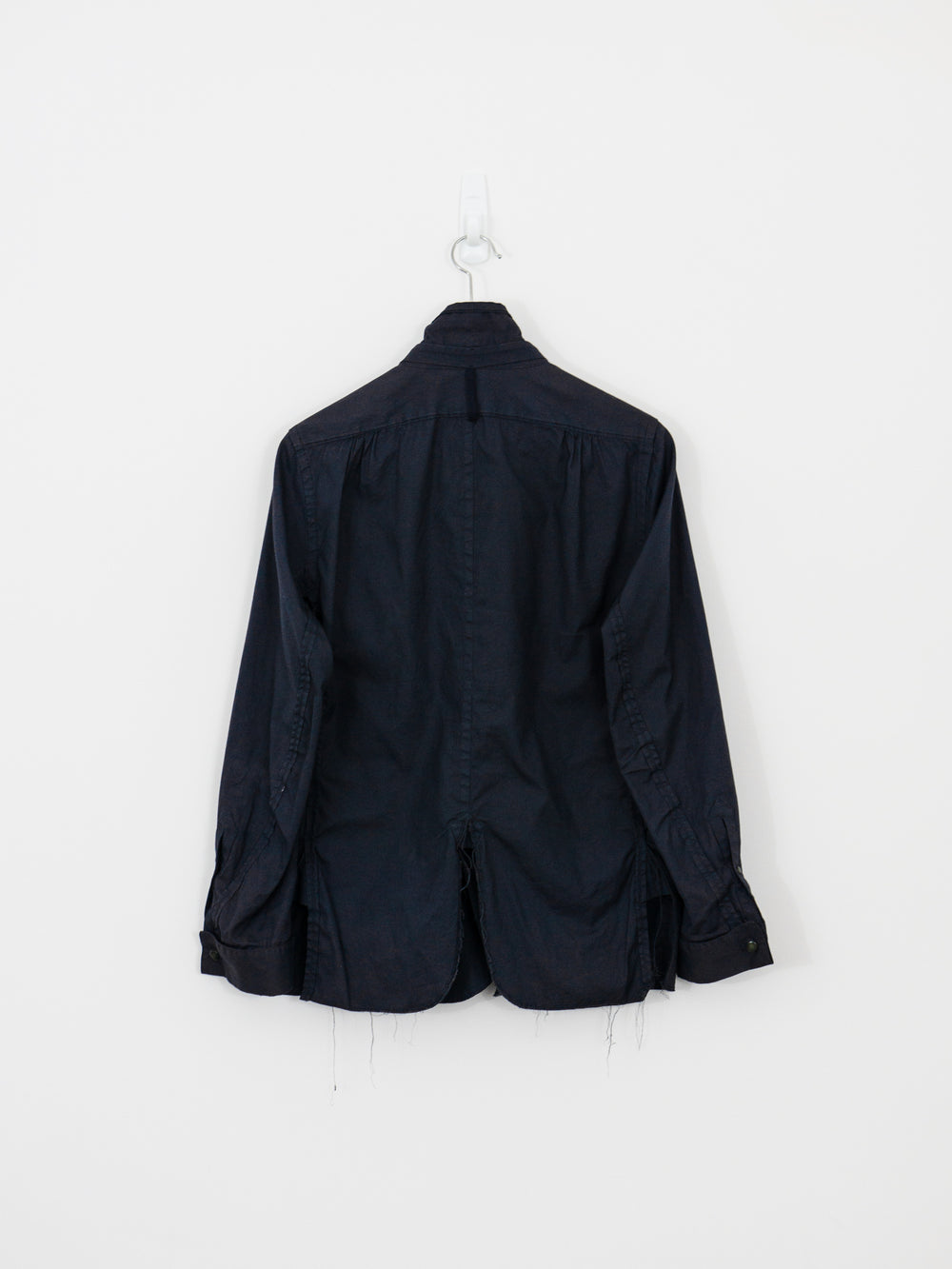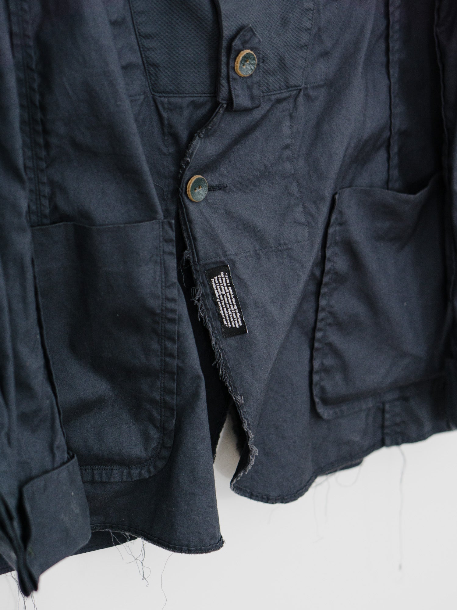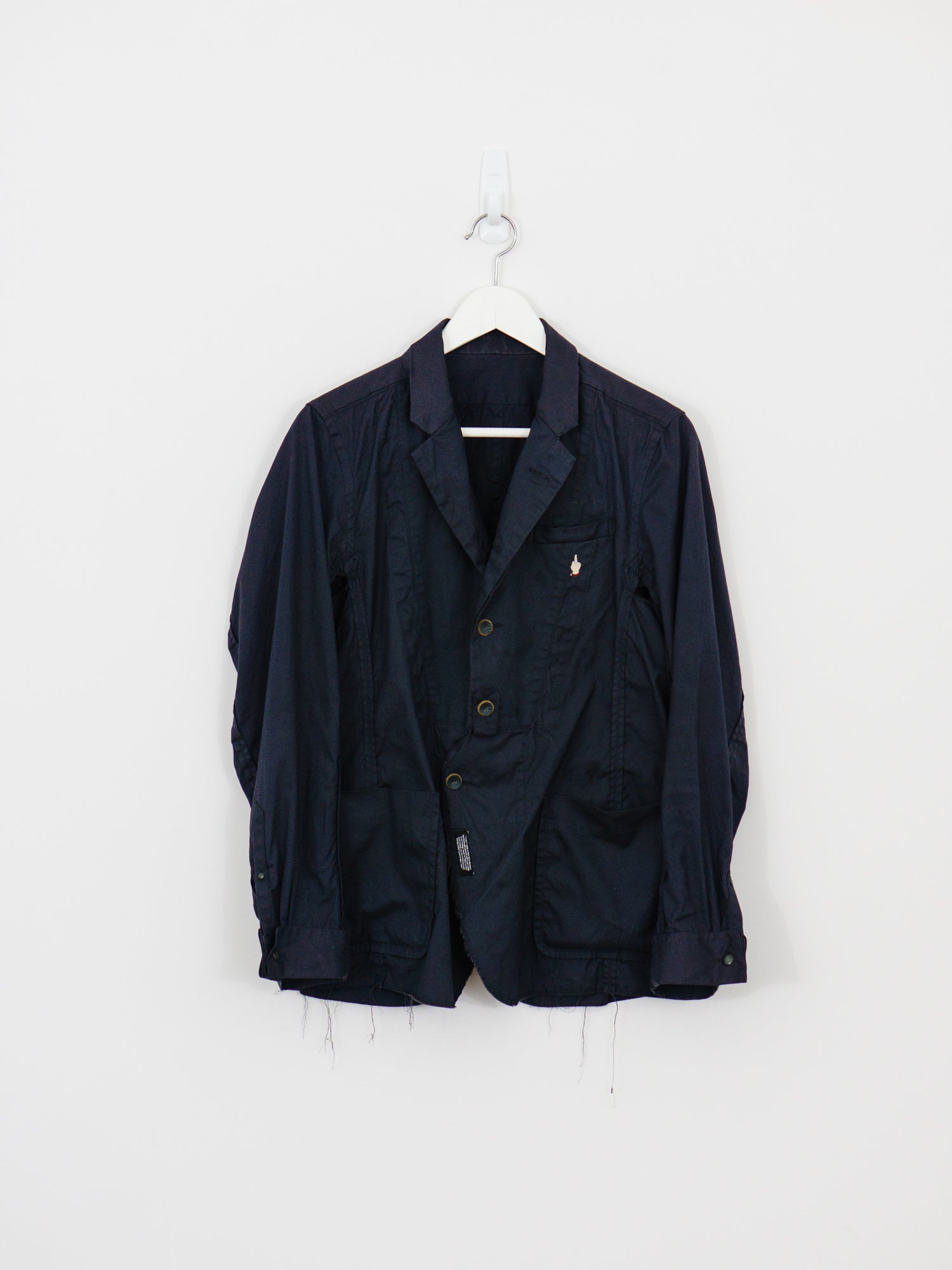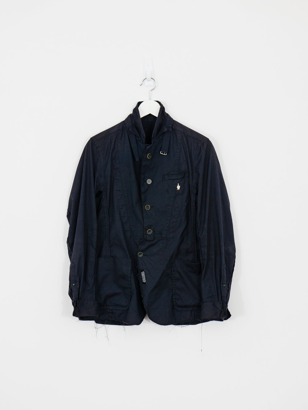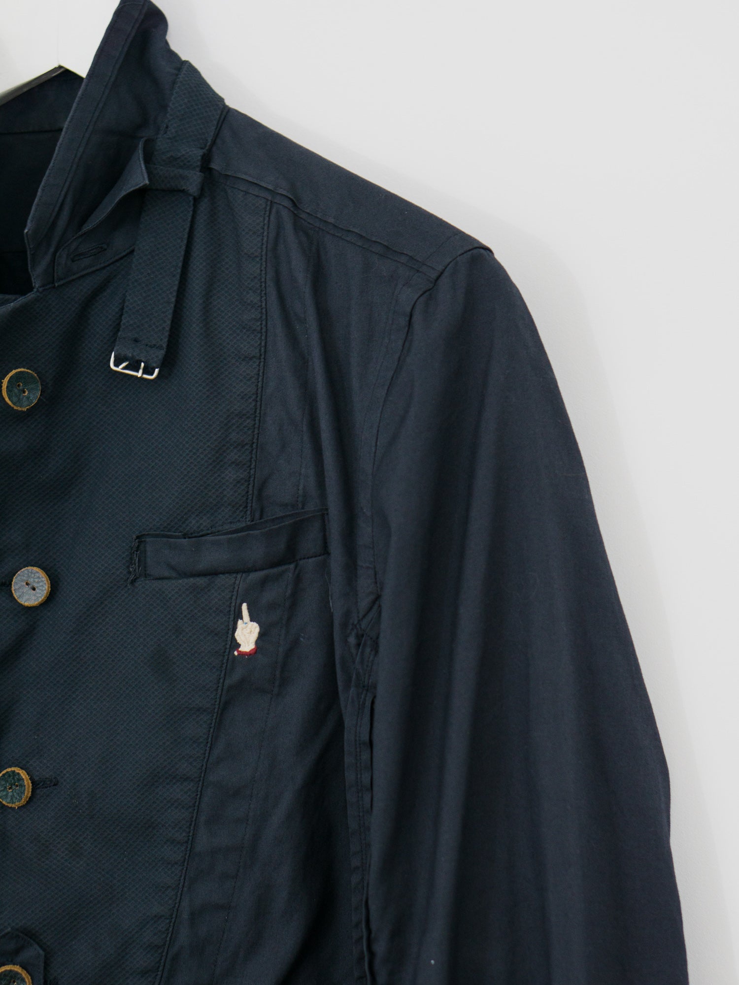 The details are abundant, and diverse. The asymmetrical construction of the placket and panelling, which are coupled with soft cork buttons make the jacket seem futuristic and earthy simultaneously. This is pushed further by the distressed hems, metal applications and colorful synthetic embroidery of a hand proudly presenting a middle finger. Also to be noted is a patch of Talking Heads lyrics below the bottom button, exposed pockets, a collar strap which can be used if worn buttoned up all the way or folded underneath the lapel if worn like a blazer.