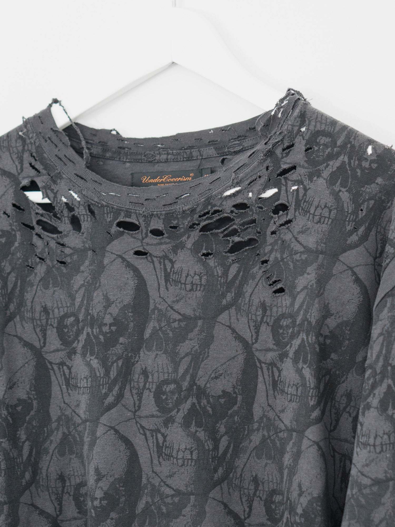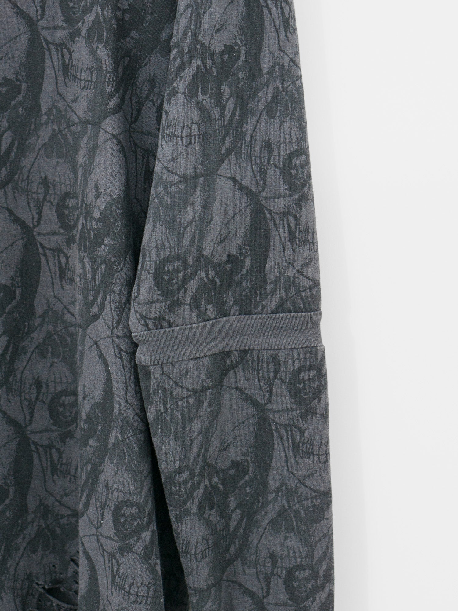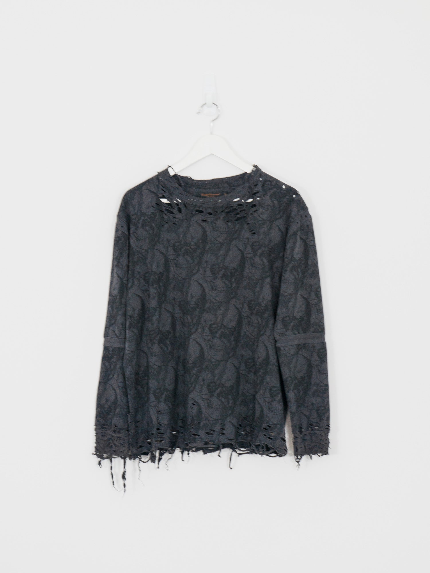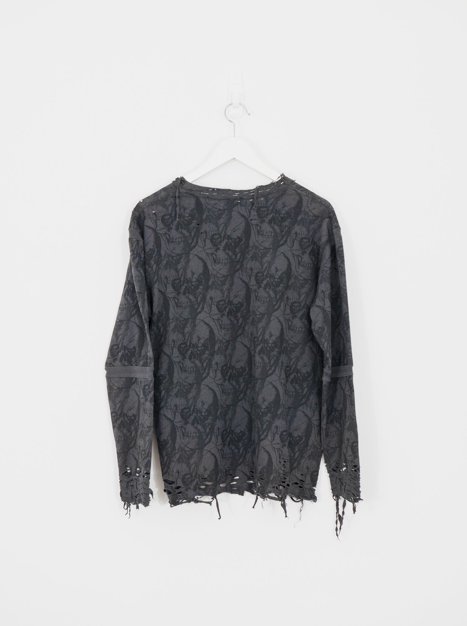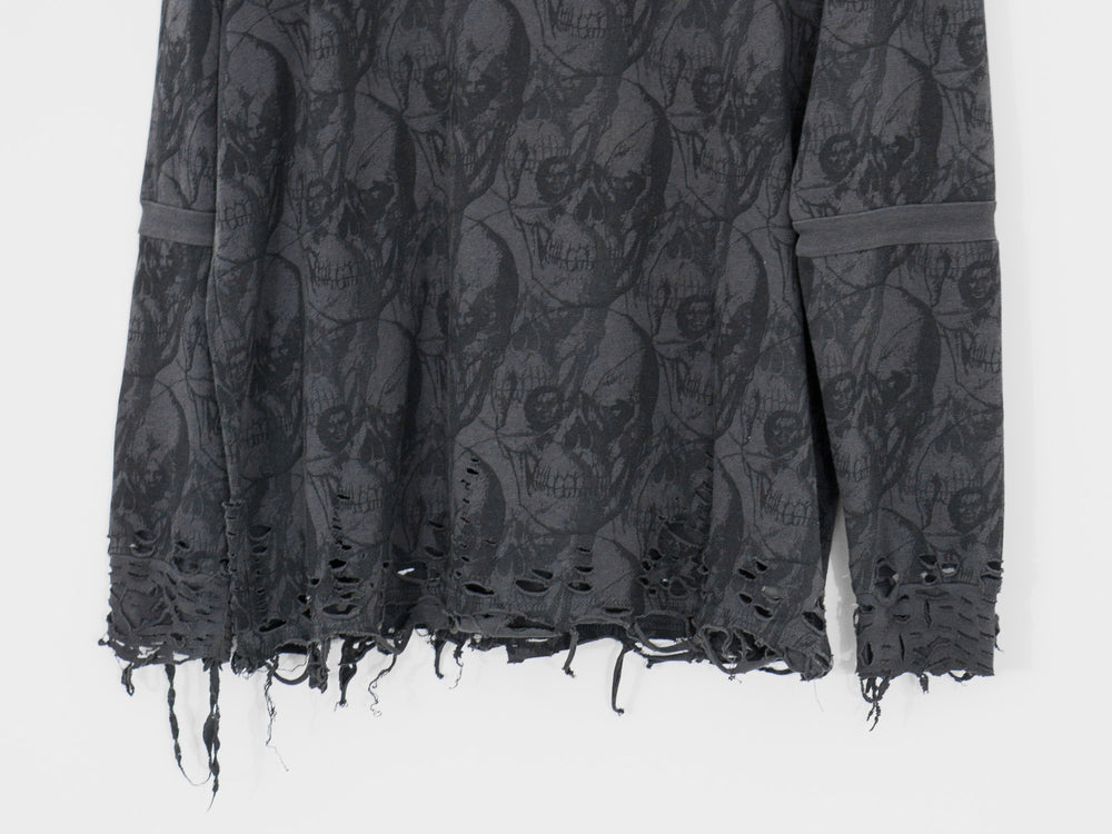There is extensive shredding along the collar, hem, and sleeve hems, a somewhat faded wash of the fabric itself and an all-over pseudo-tribal skull print. The cotton is thin like a tee-shirt, although the cuffs and ribbing on the arms mimic a sweater.