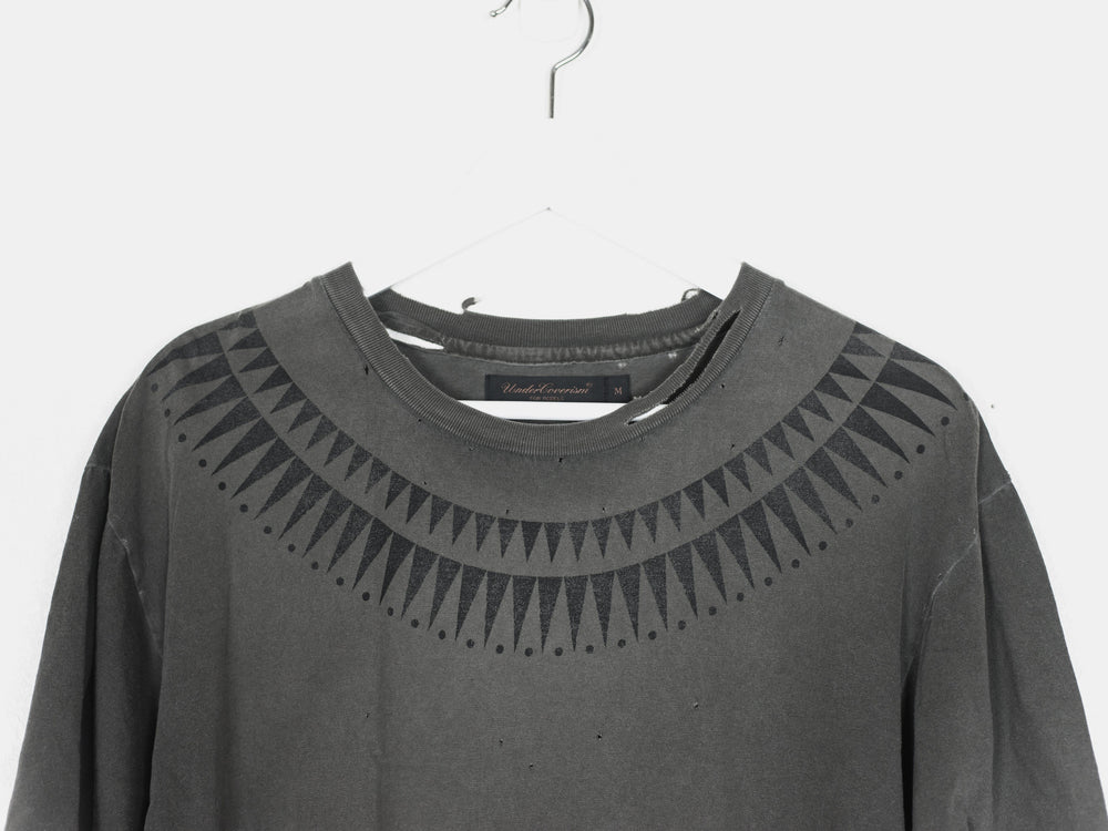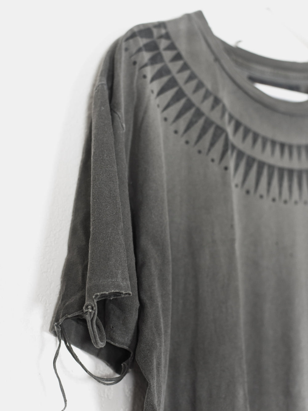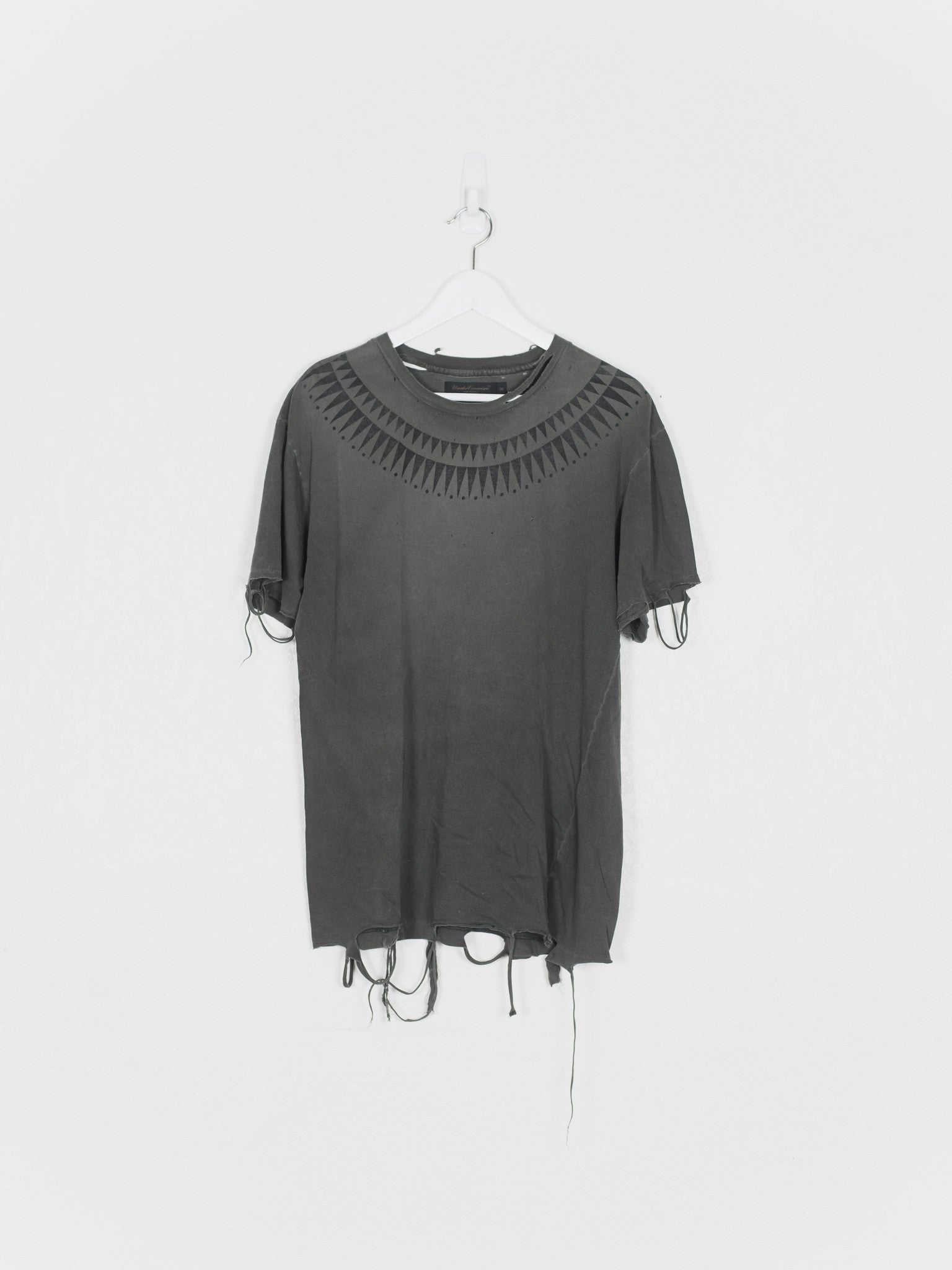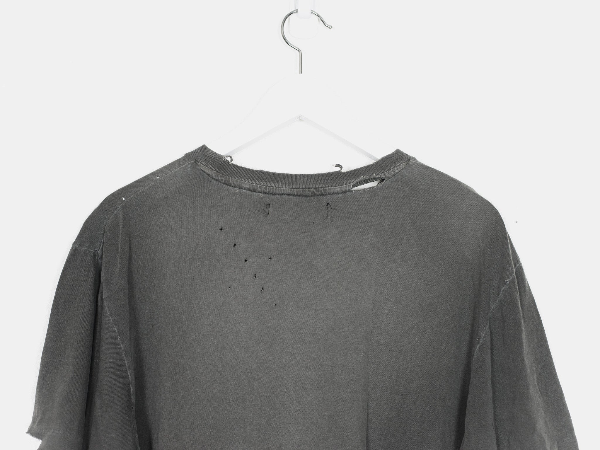Rare and coveted piece in excellent condition. This is the very first Giz tee with meticously distressed hems and perforations. Because the tee came new with faded and destroyed details, the condition is harder to gauge, but judging by the pristine care-tag and fabric it's in 8.5/10 condition - no pilling or wrinkles. Made in Japan.