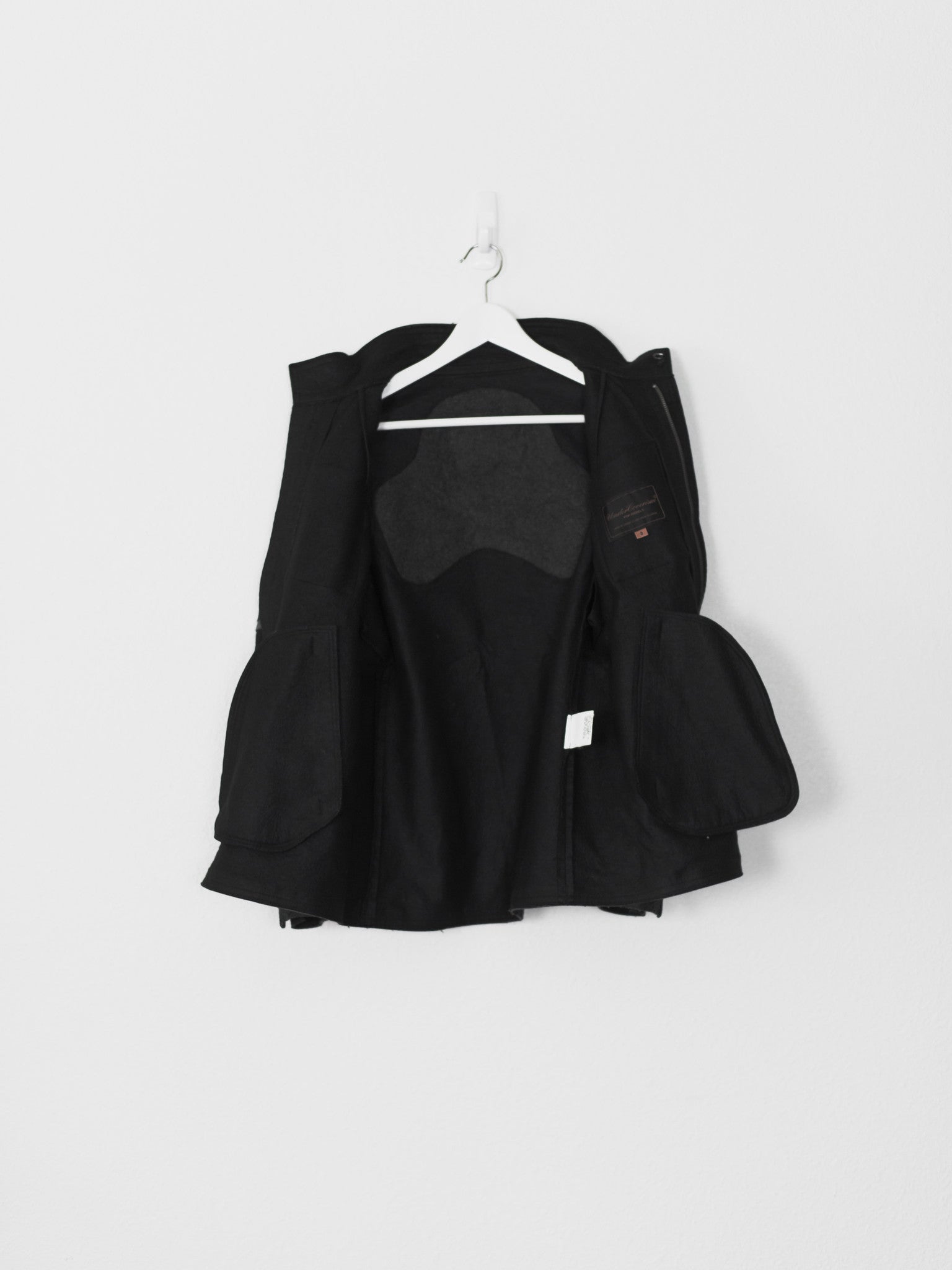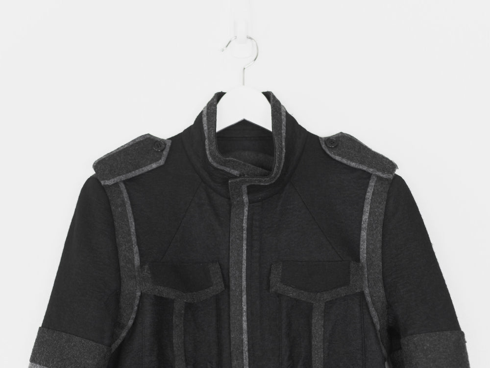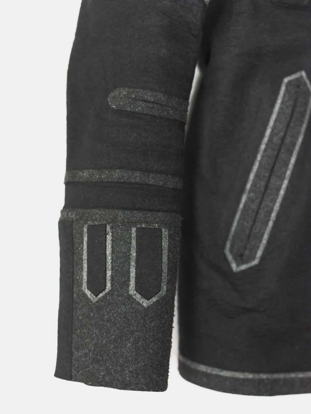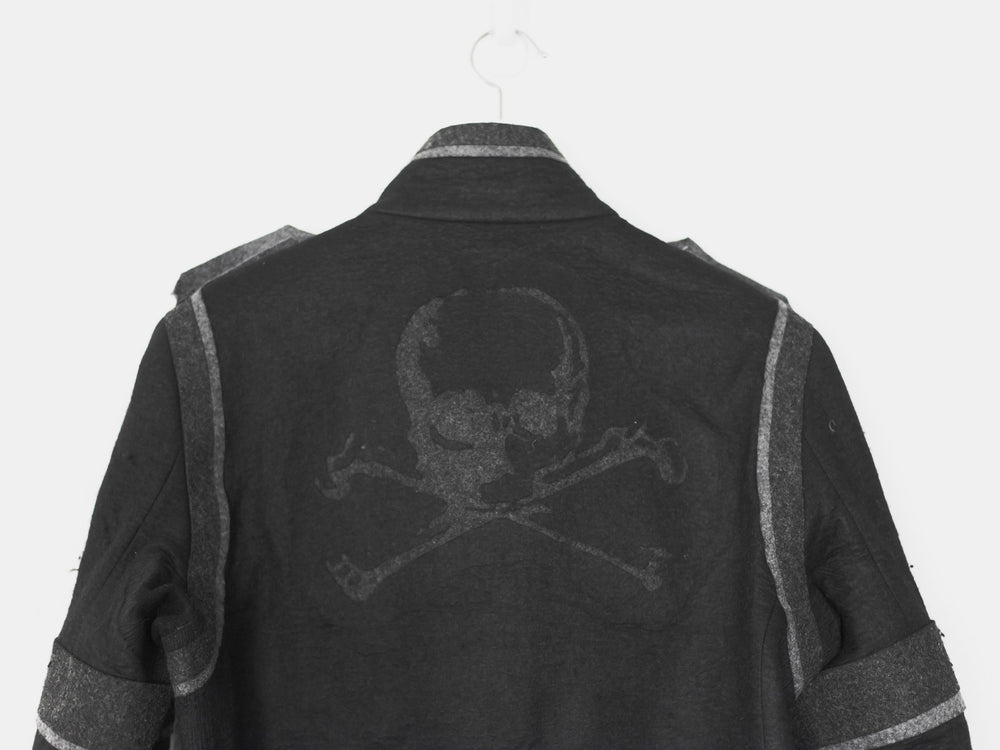 Impossible to find runway jacket and one of the most characteristic pieces of one of Undercover’s best seasons ‘Arts and Crafts’. Composed of charcoal paneled wool felt to reflect the season's theme, the jacket features insane details such as the laser cutout skull and crossbones on the back, contrasting edges, and felt embroidered sleeves. Made in Japan. 8/10 condition, some pilling on the sleeves.