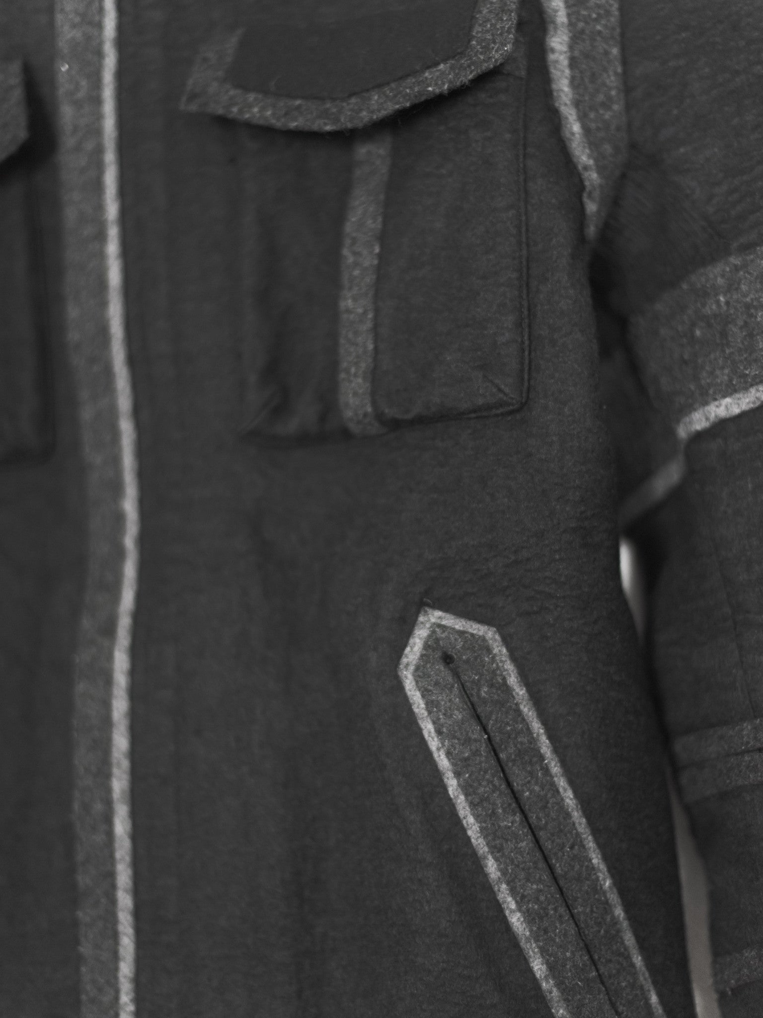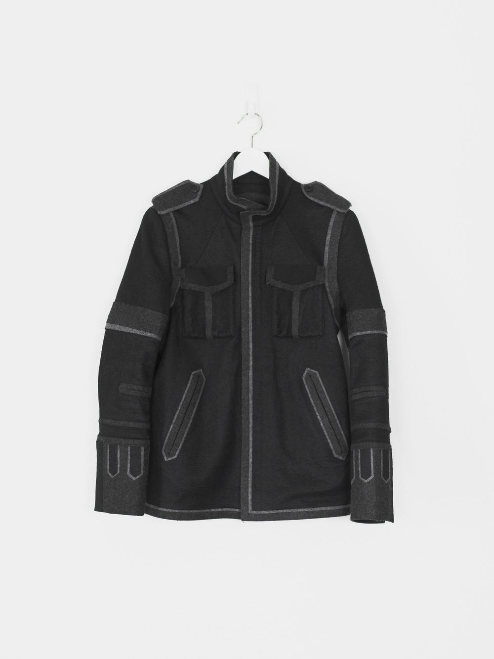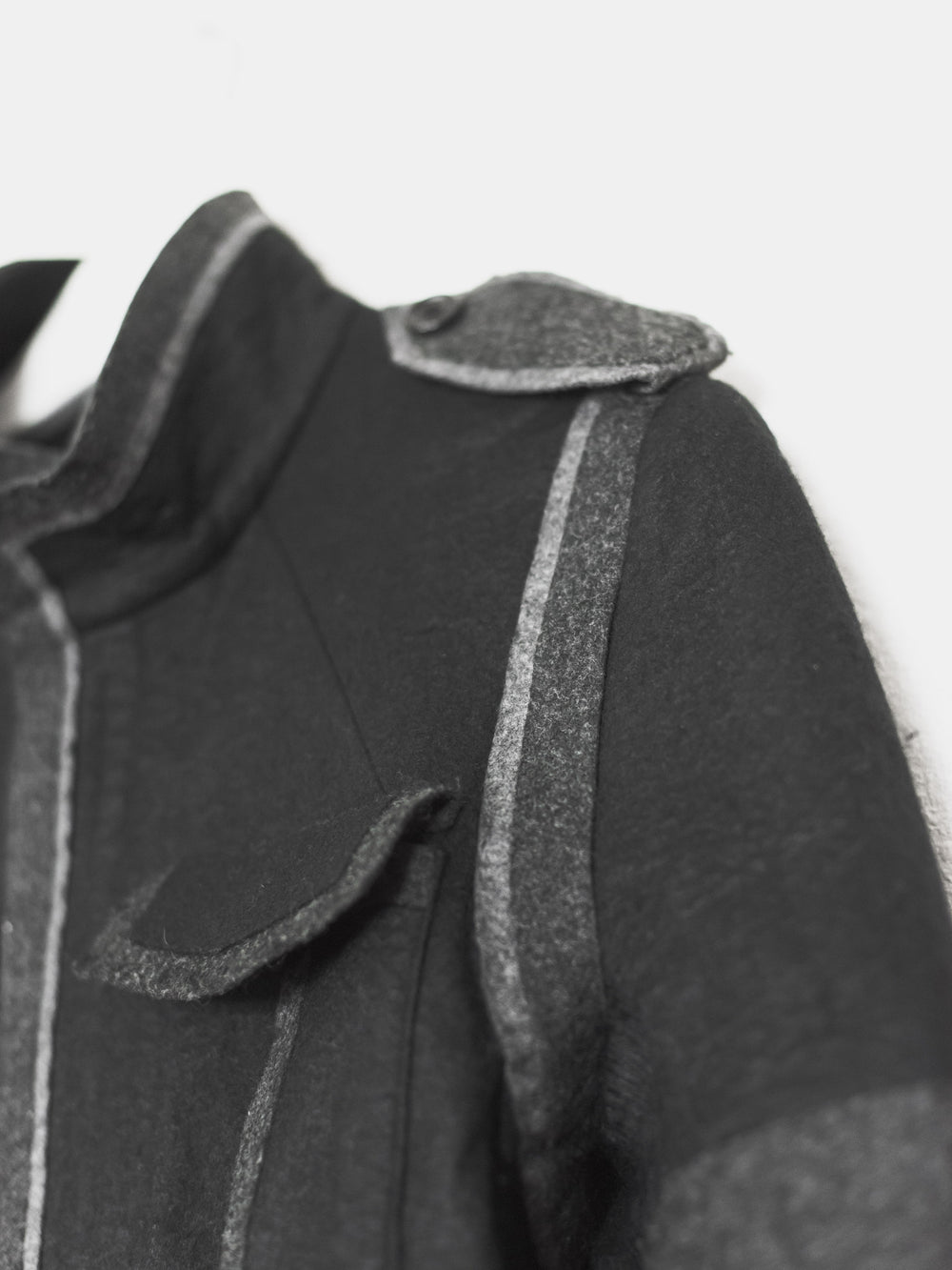 Impossible to find runway jacket and one of the most characteristic pieces of one of Undercover’s best seasons ‘Arts and Crafts’. Composed of charcoal paneled wool felt to reflect the season's theme, the jacket features insane details such as the laser cutout skull and crossbones on the back, contrasting edges, and felt embroidered sleeves. Made in Japan. 8/10 condition, some pilling on the sleeves.