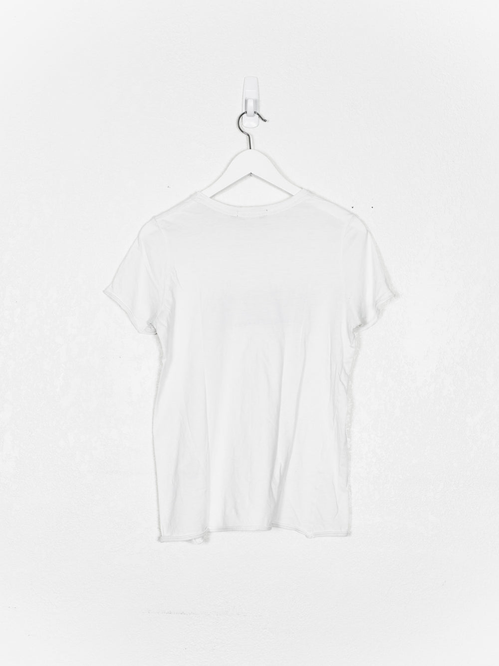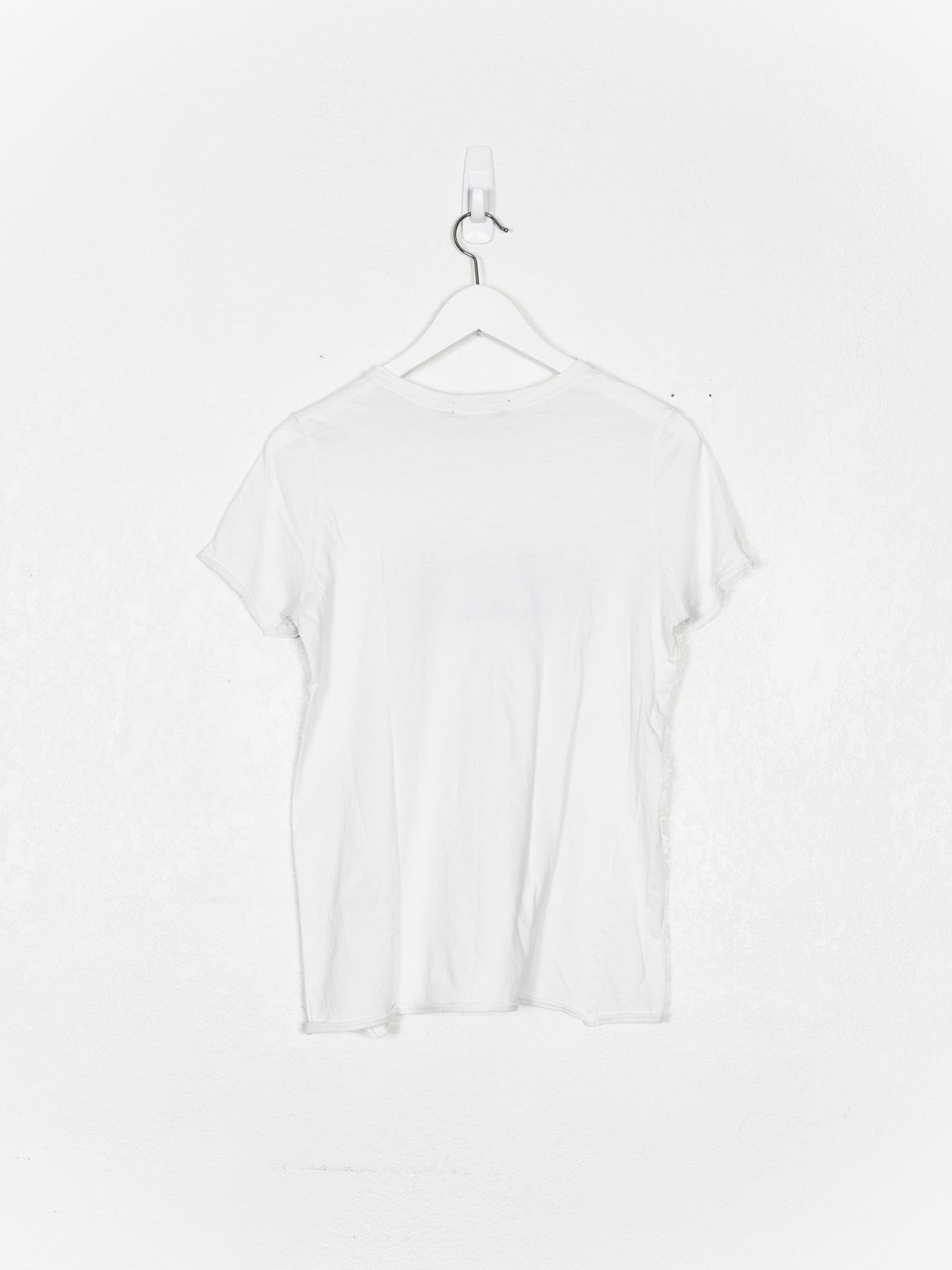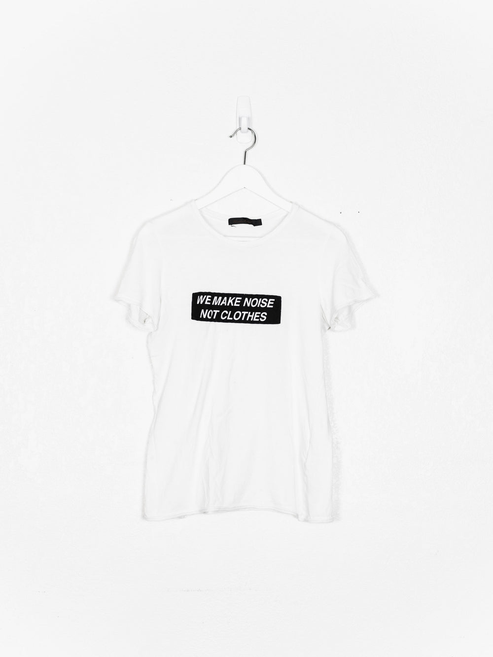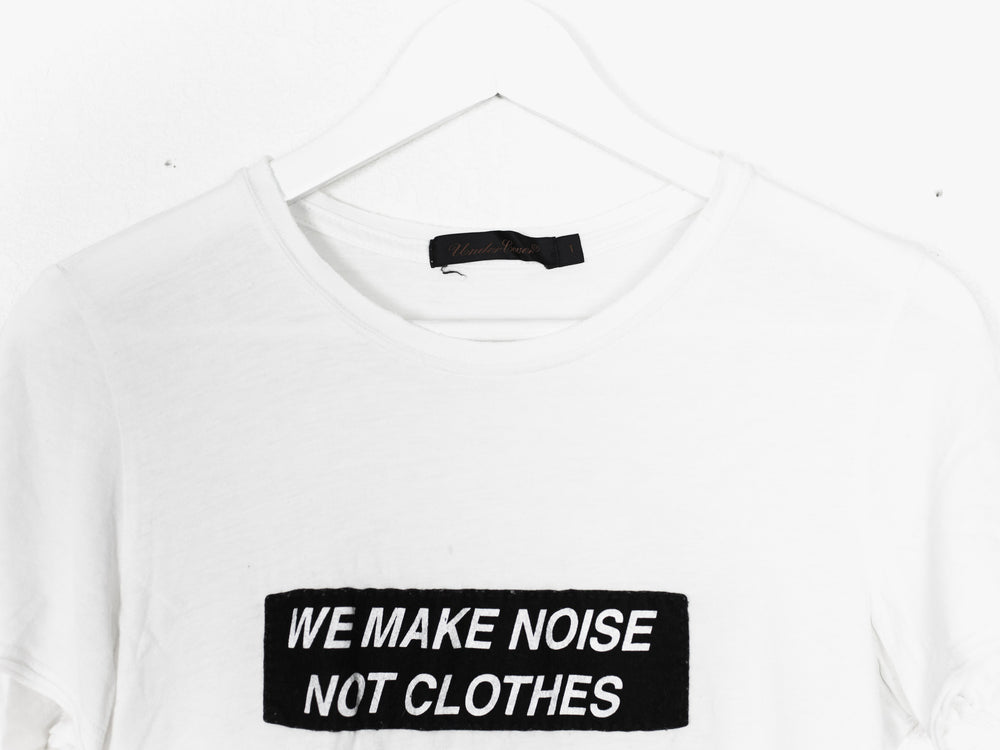 Very rare original tee from 'Arts & Crafts' with Undercover's motif, "We Make Noise Not Clothes" on a stitched felt patch, not a screen print like the remakes. Features raw deconstructed hems as typical of the season. Made in Japan.