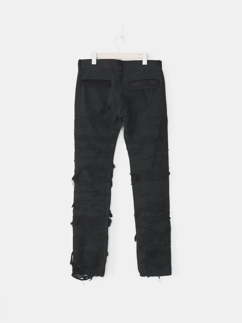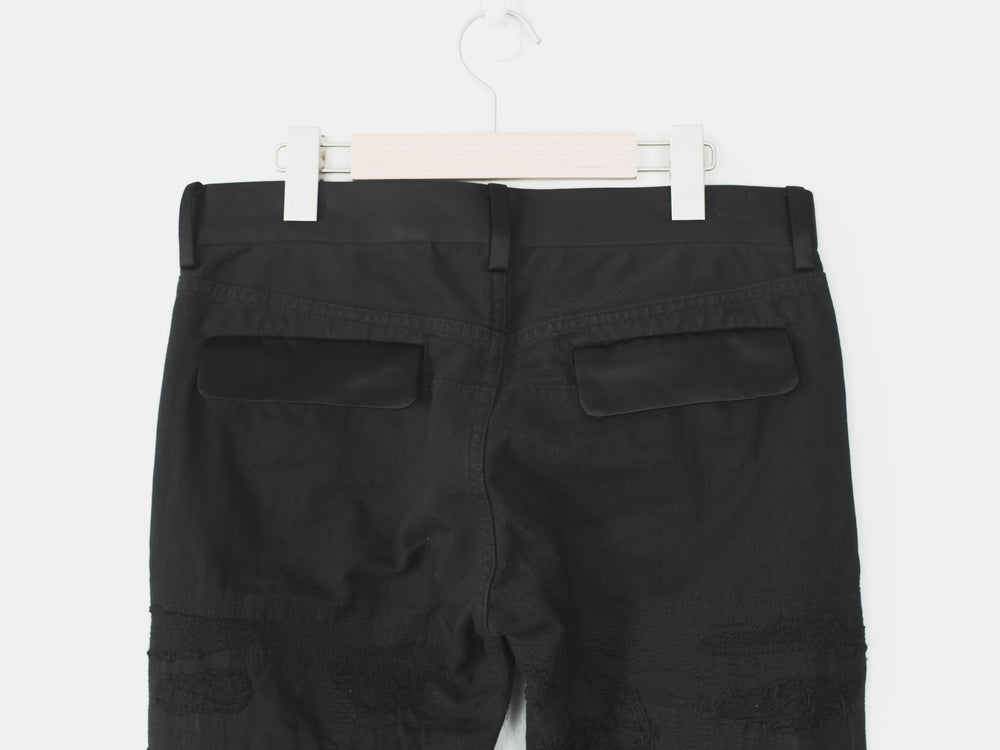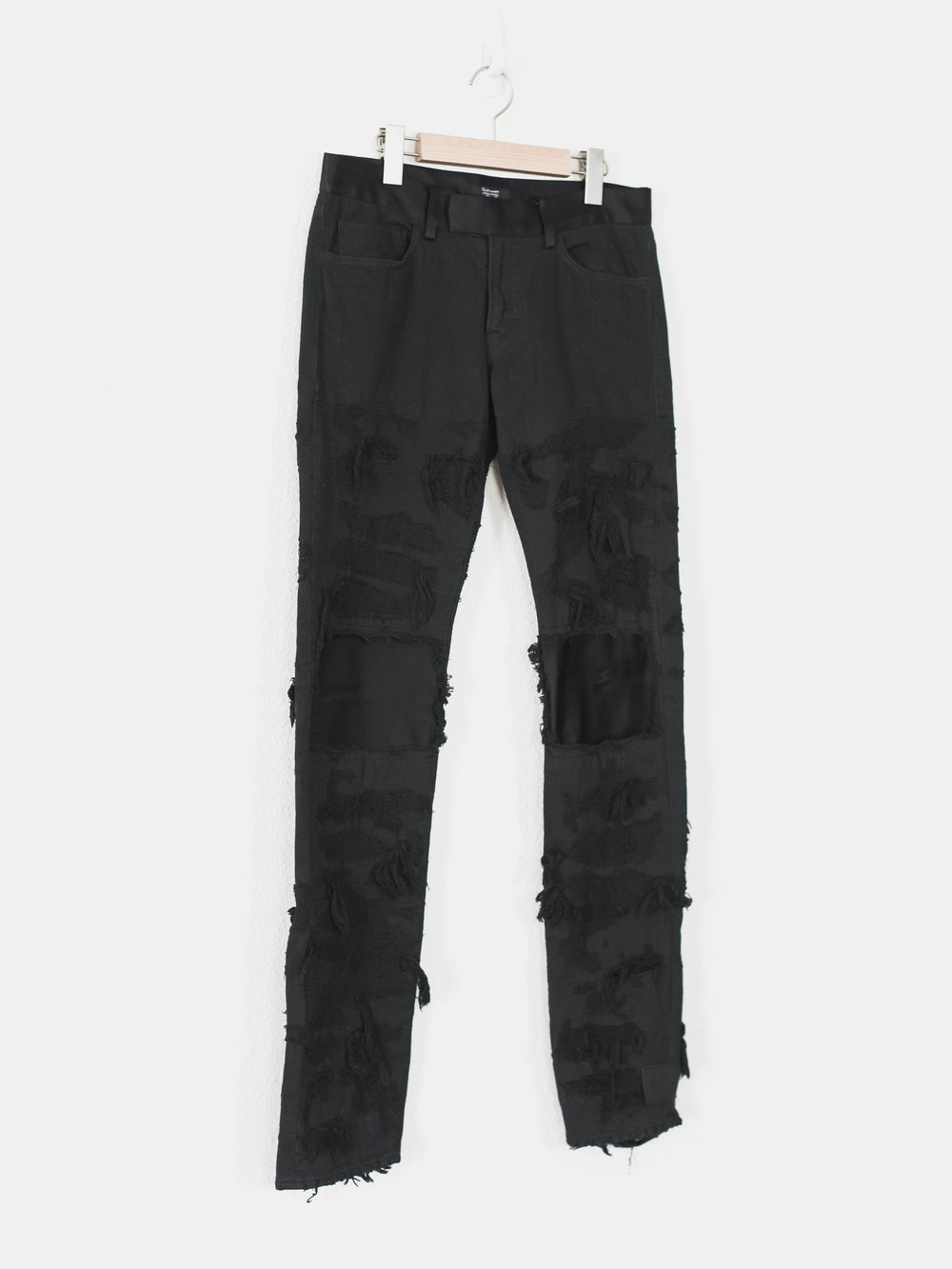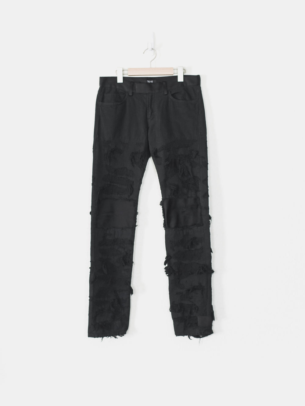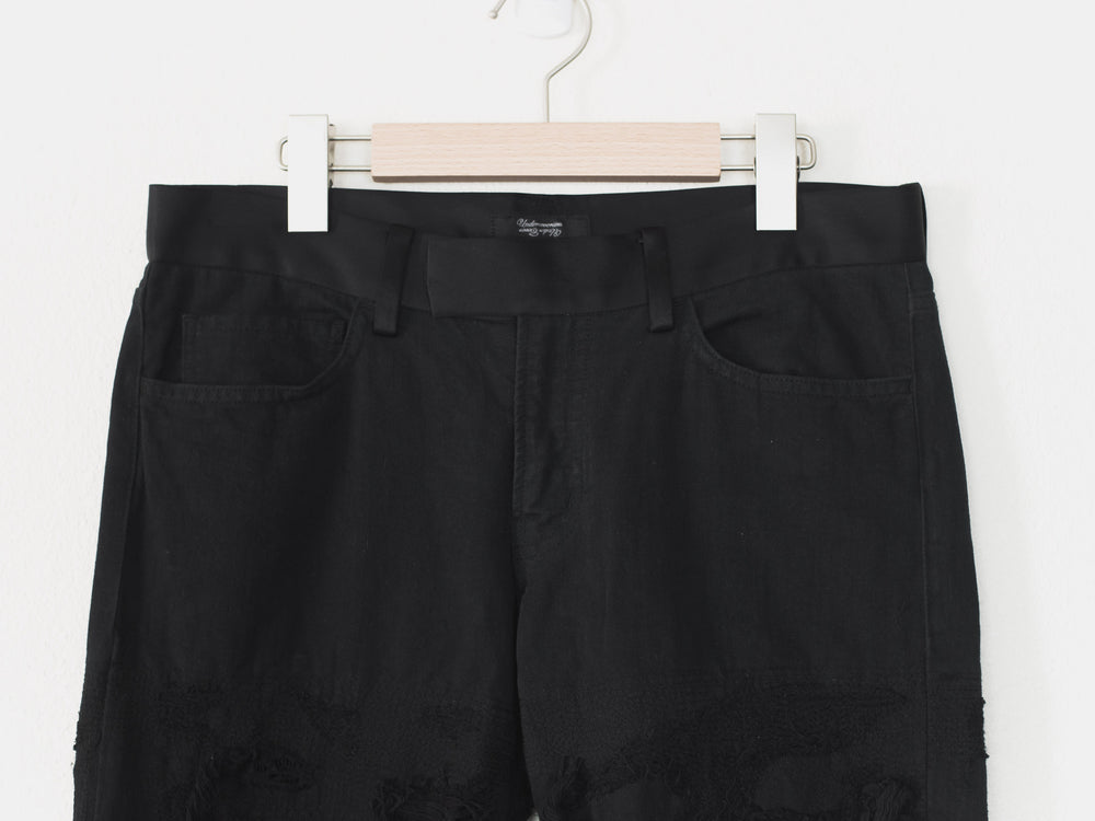 Absolutely stunning and highly coveted jeans from one of Undercover's best seasons. Super hefty construction and amazing hand crafted topographies that can only be fully appreciated in person. Very similar distressing to the 85s, but inherently more wearable and easier to put on since the "holes" are patched and stitched. Detailed with a silk waist, patches, and pocket flaps, plus an embroidered tag on the hem. Made in Japan. 9.5/10 condition, no flaws.