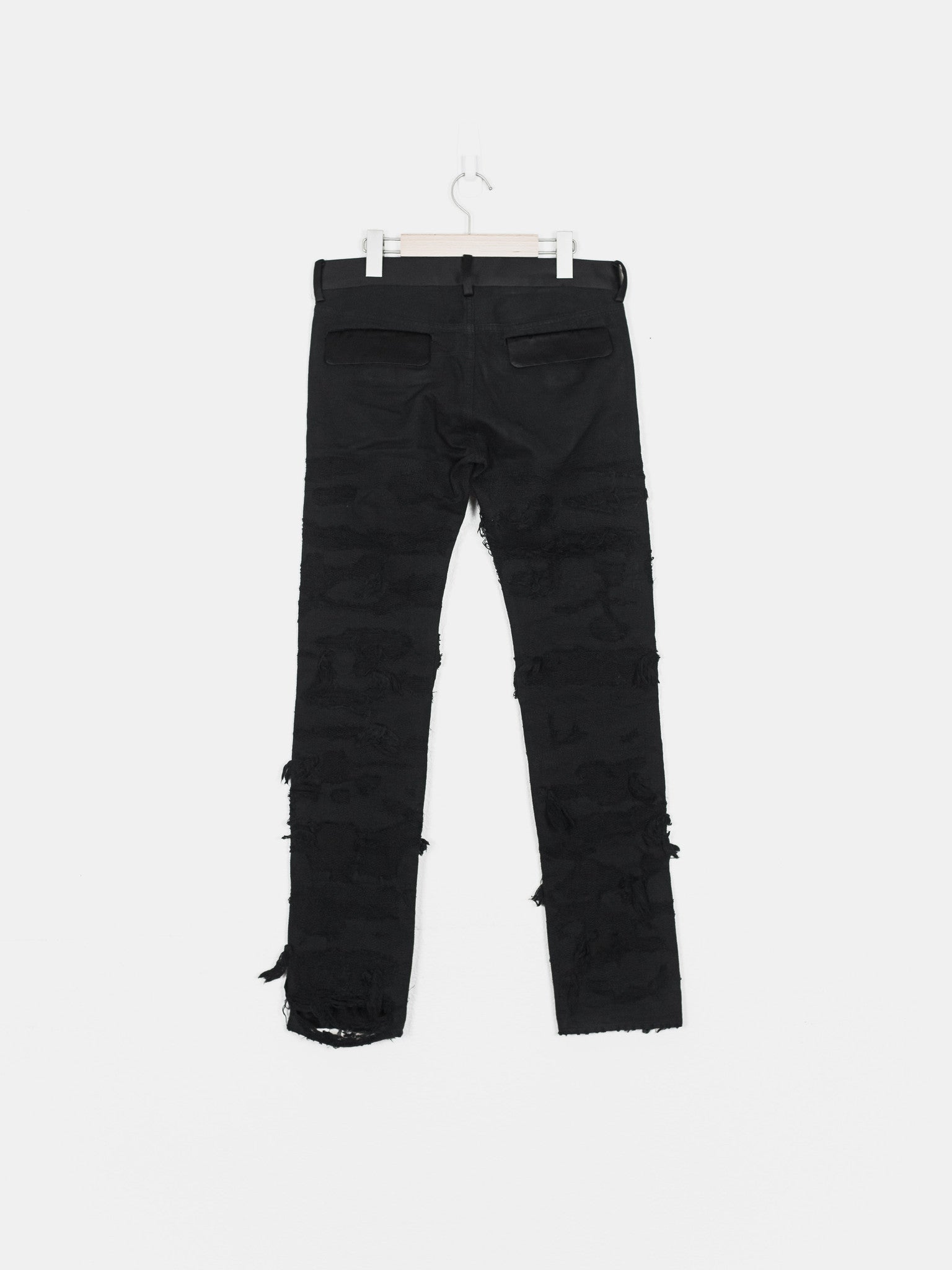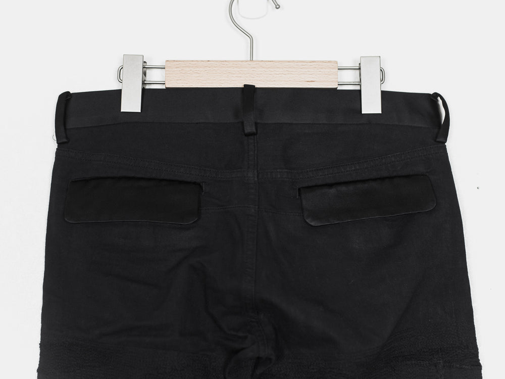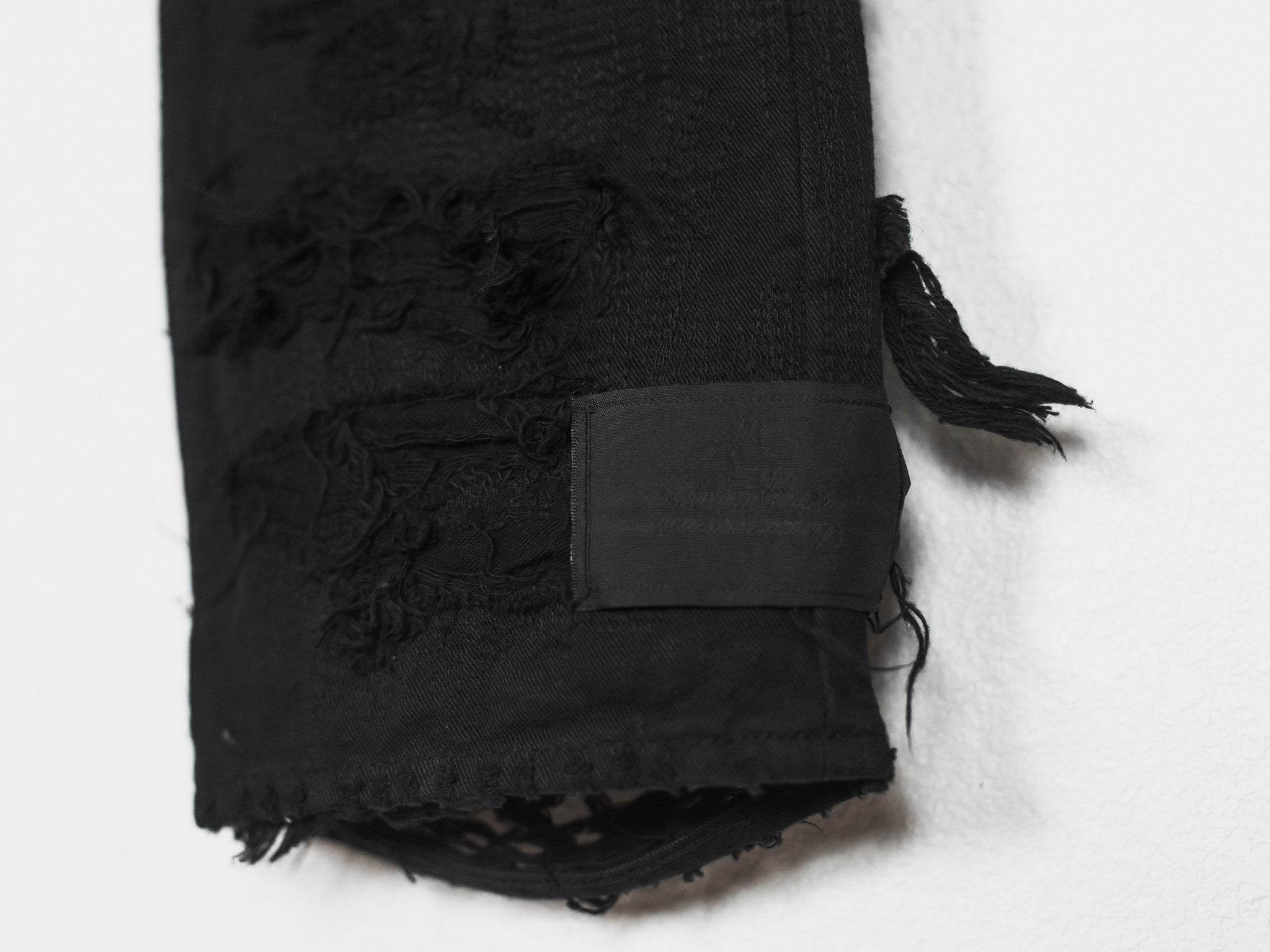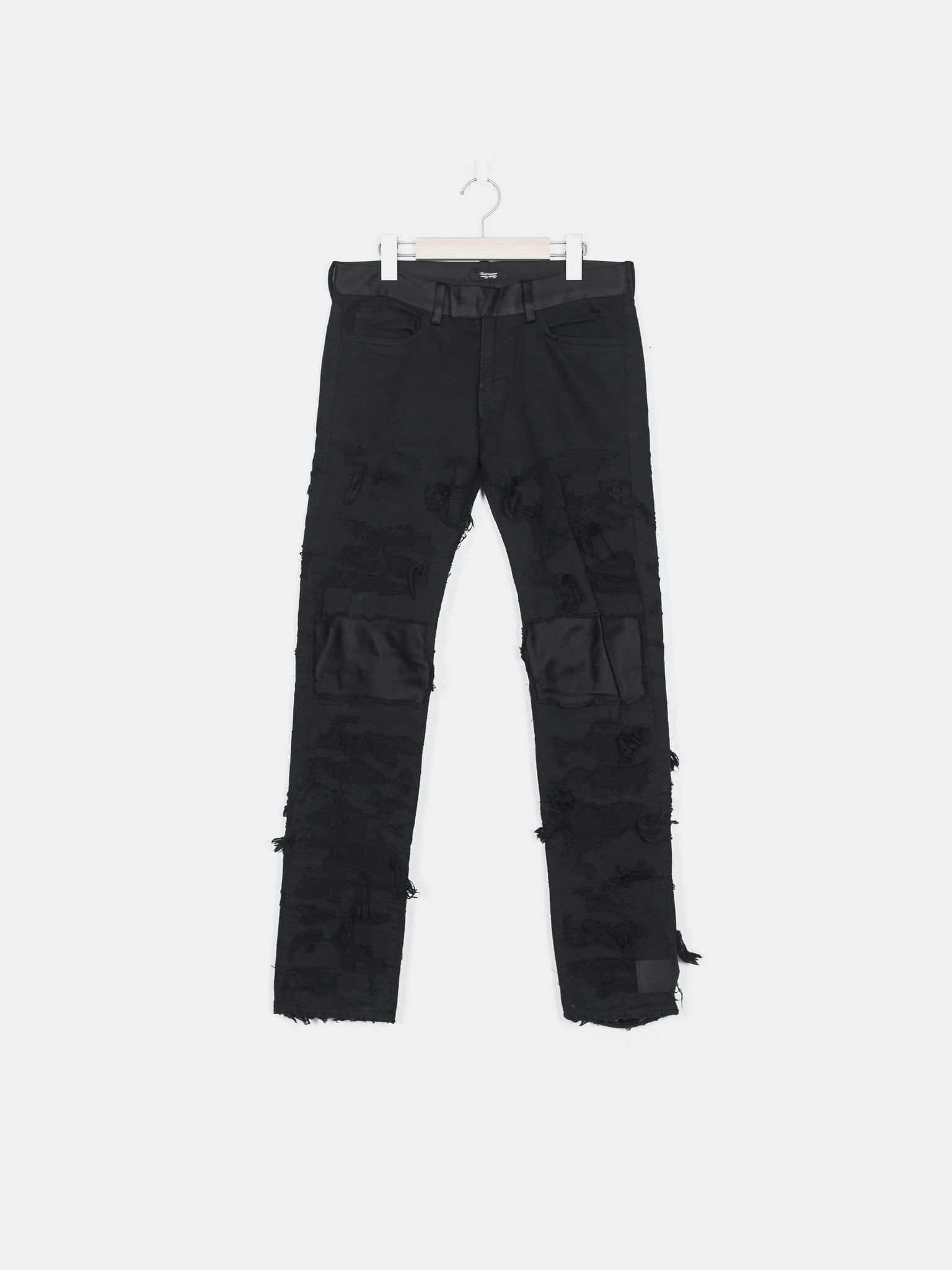 Absolutely stunning and highly coveted jeans from one of Undercover's best seasons. Super hefty construction and amazing hand crafted topographies that can only be fully appreciated in person. Very similar distressing to the 85s, but inherently more wearable and easier to put on since the "holes" are patched and stitched. Detailed with a silk waist, patches, and pocket flaps, plus an embroidered tag on the hem. Made in Japan.