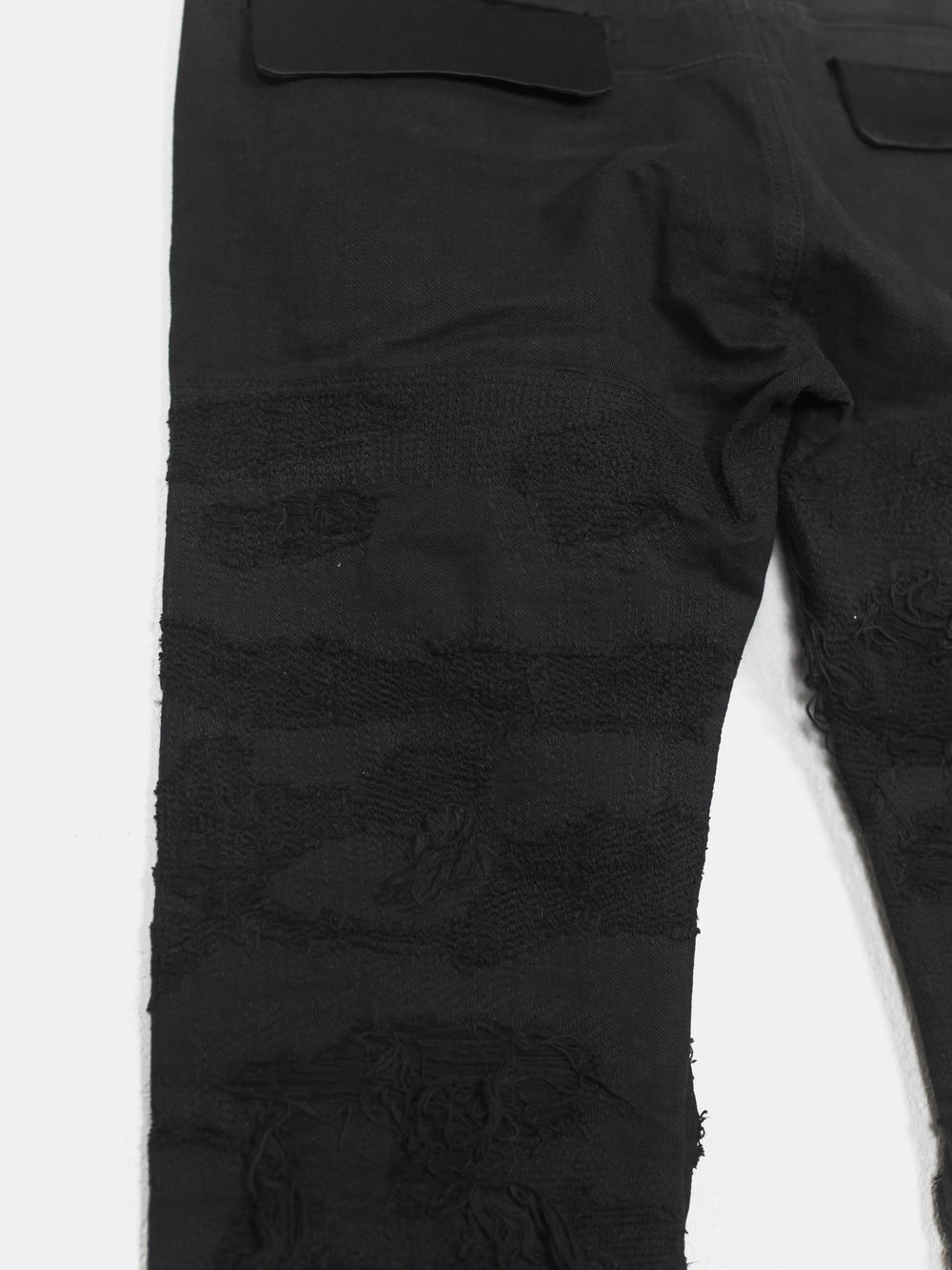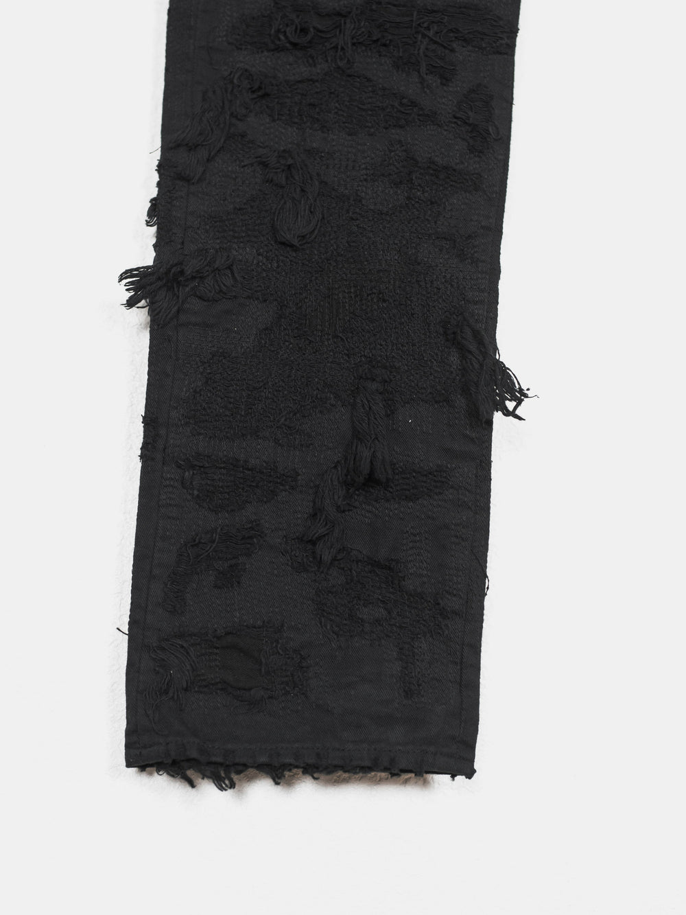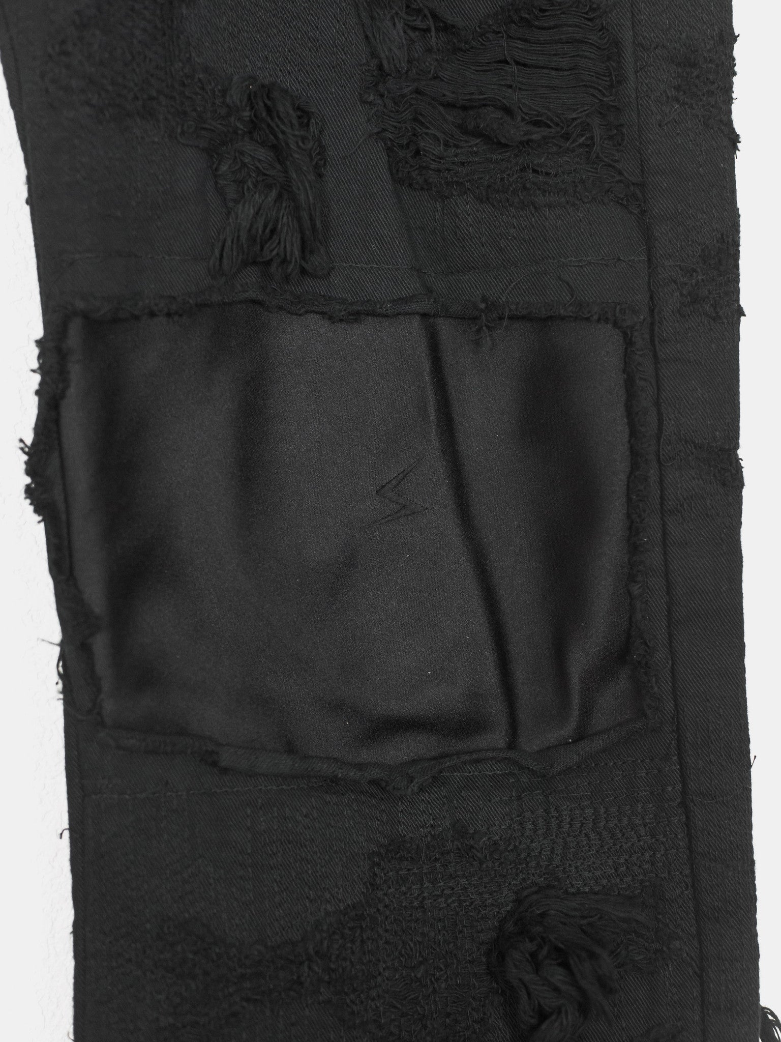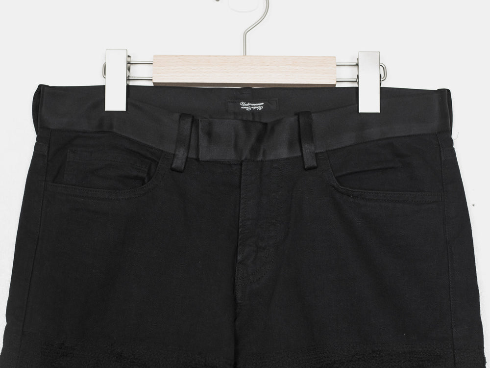 Absolutely stunning and highly coveted jeans from one of Undercover's best seasons. Super hefty construction and amazing hand crafted topographies that can only be fully appreciated in person. Very similar distressing to the 85s, but inherently more wearable and easier to put on since the "holes" are patched and stitched. Detailed with a silk waist, patches, and pocket flaps, plus an embroidered tag on the hem. Made in Japan.