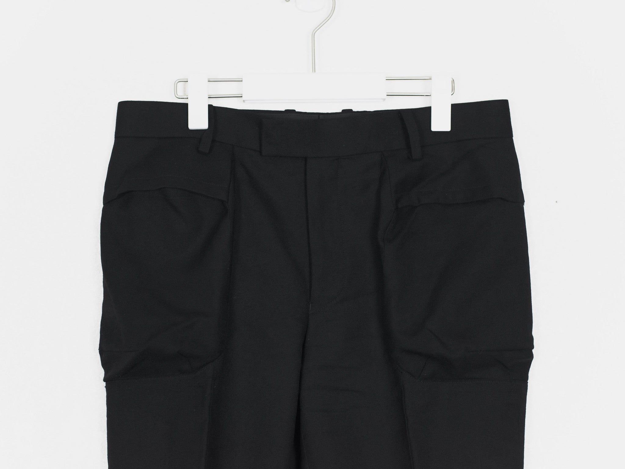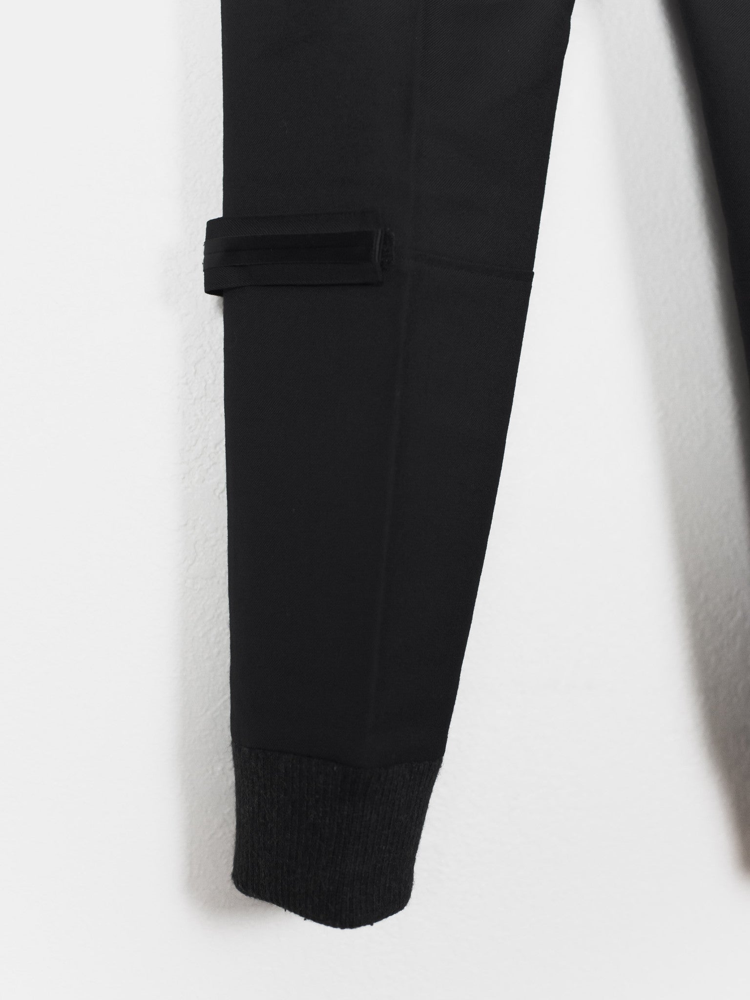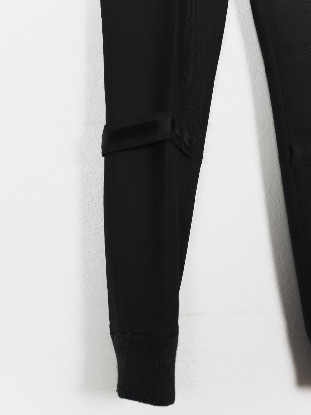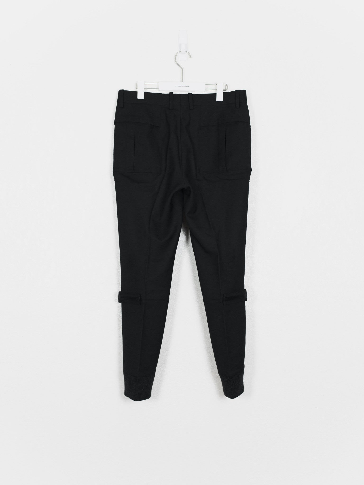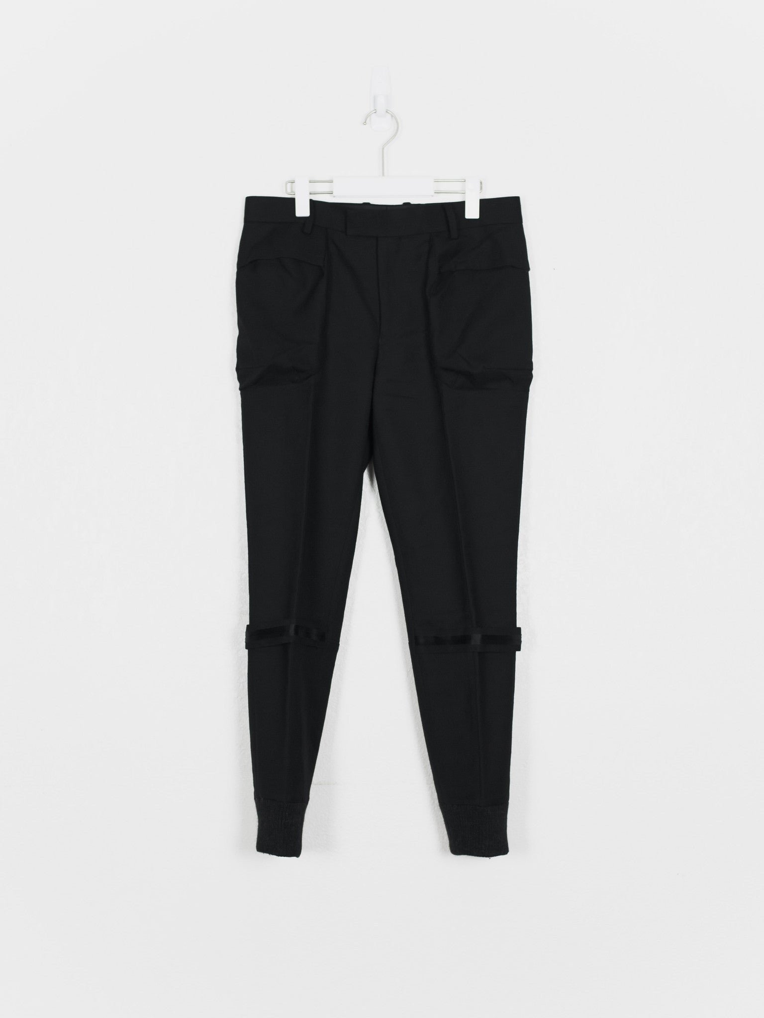 Here is a pair of wool pants from Undercover’s Fall/Winter 2009 collection, one of my favorites for the presence of technical fabrics and futuristic, functional detailing. These pants feature tech straps around the knees, ribbed hems, lightning embroidery on the left knee, and 3D waist pockets for a look that fuses the refined with the utilitarian. The result is a pair of pants with incredible versatility.