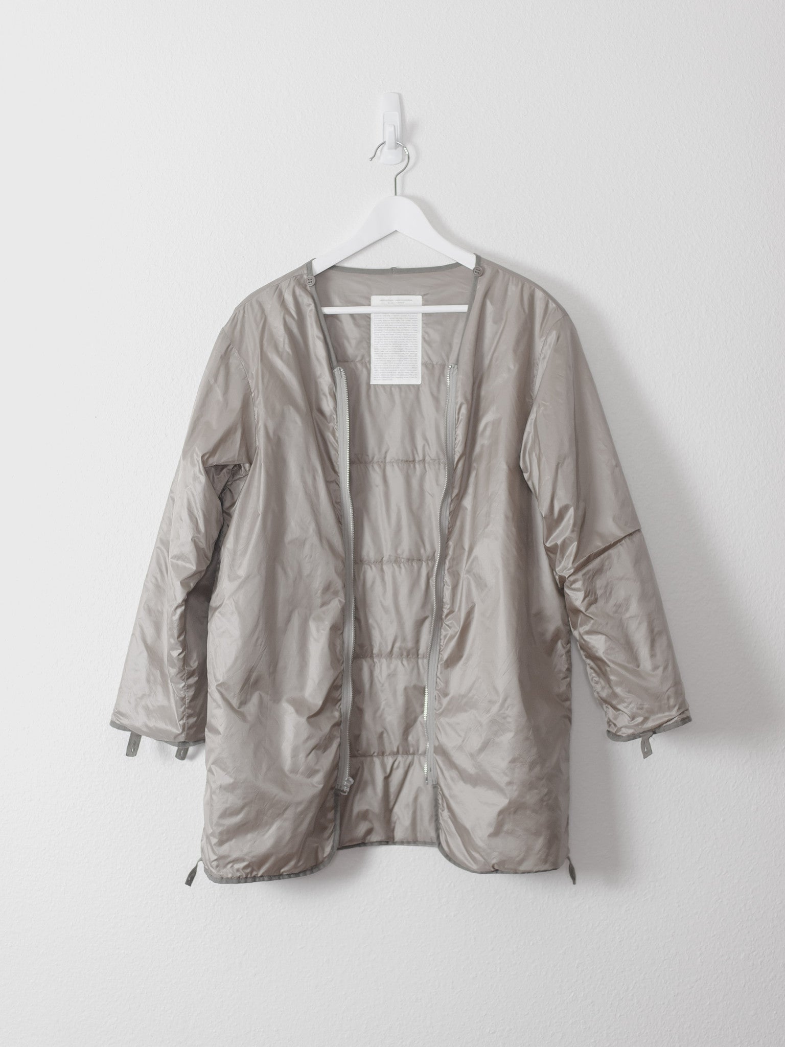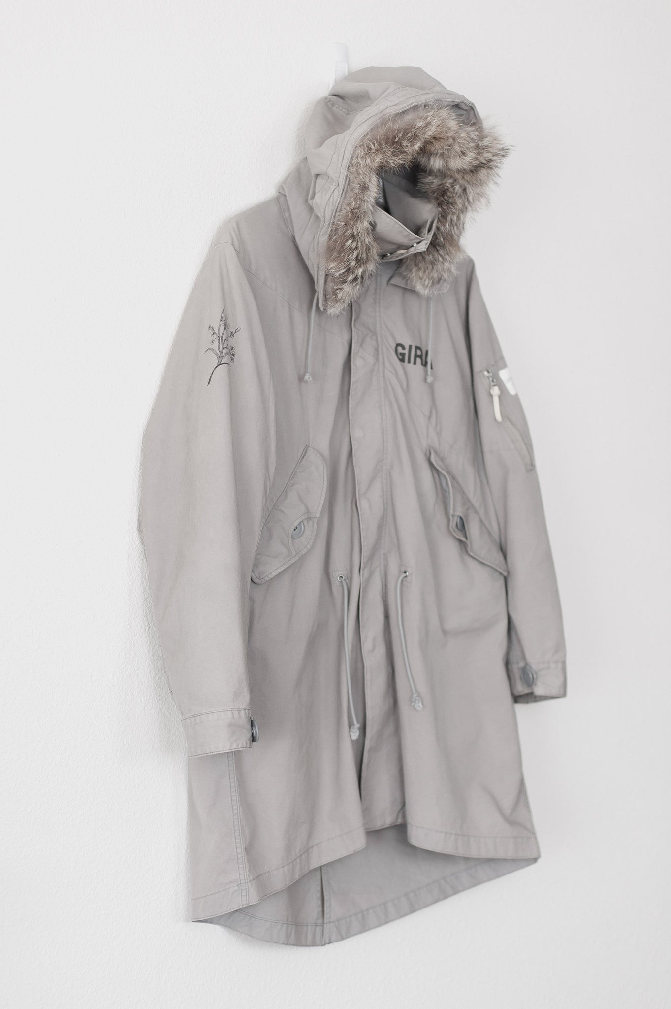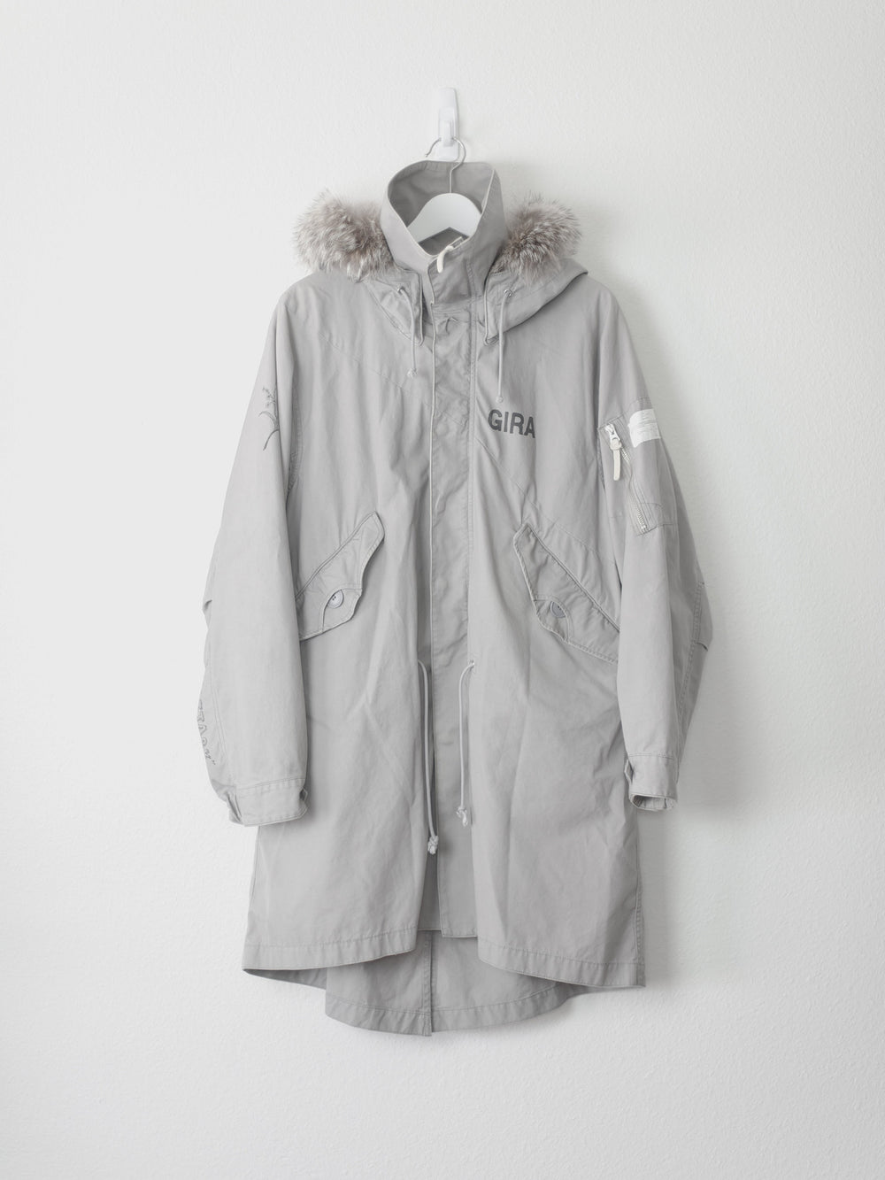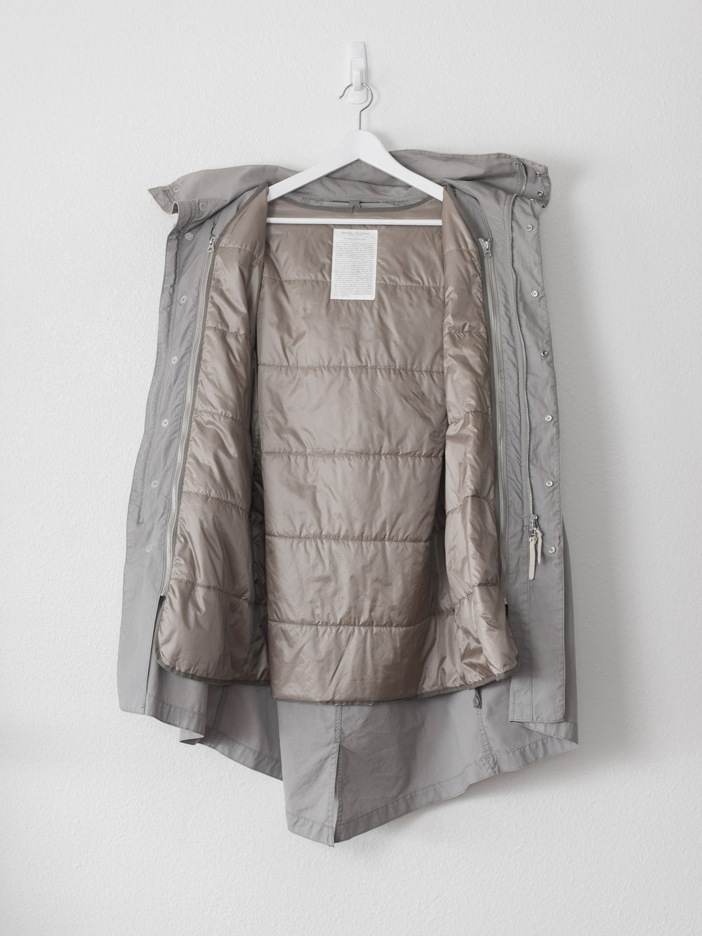 Composed of a soft, yet hefty grey cotton outer with removable genuine coyote fur hood collar and removable poly filled liner, this piece suits all seasons and every climate.