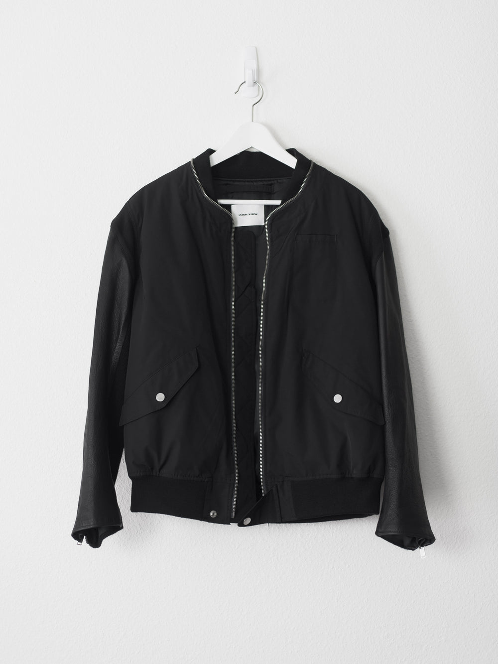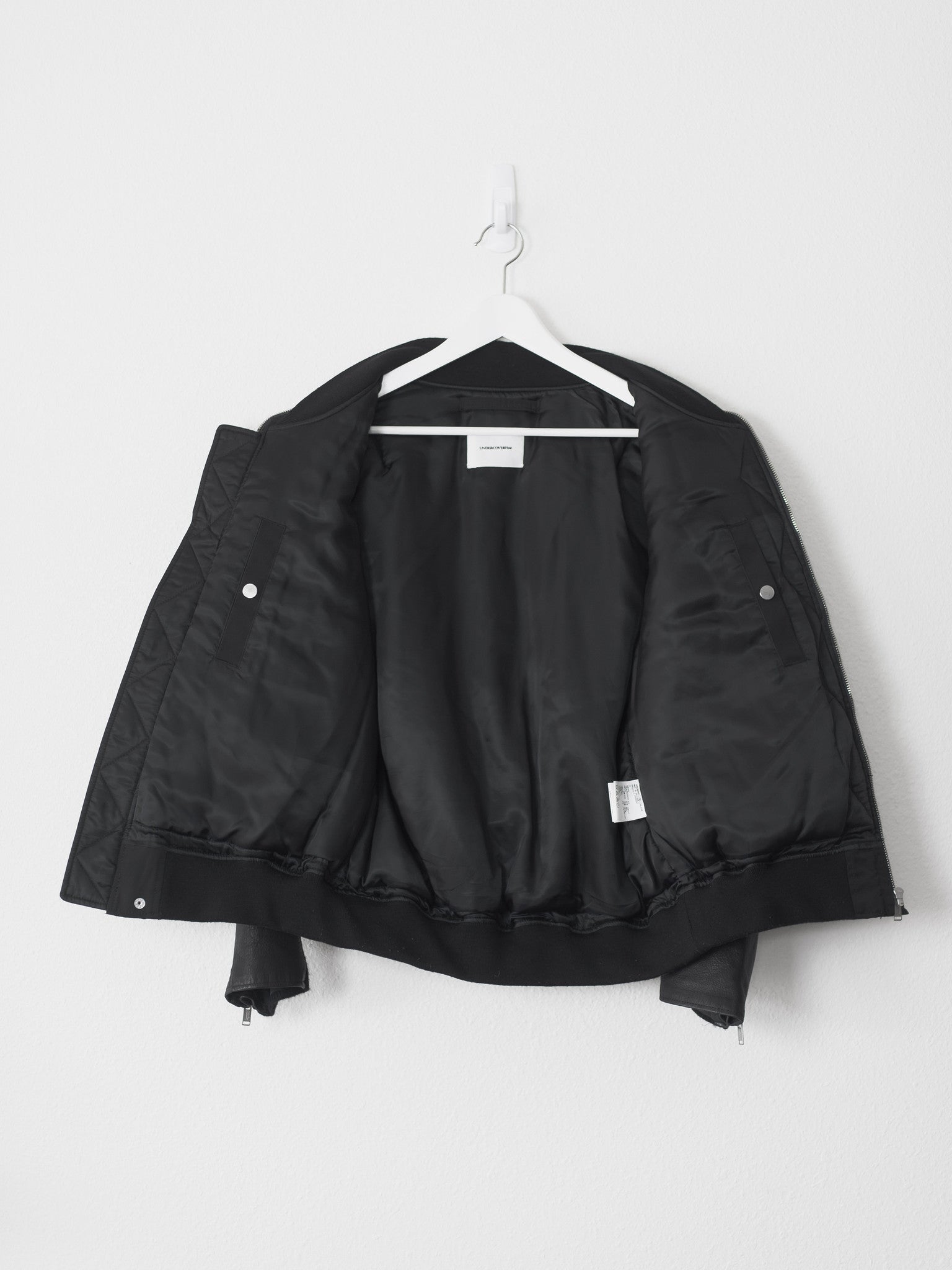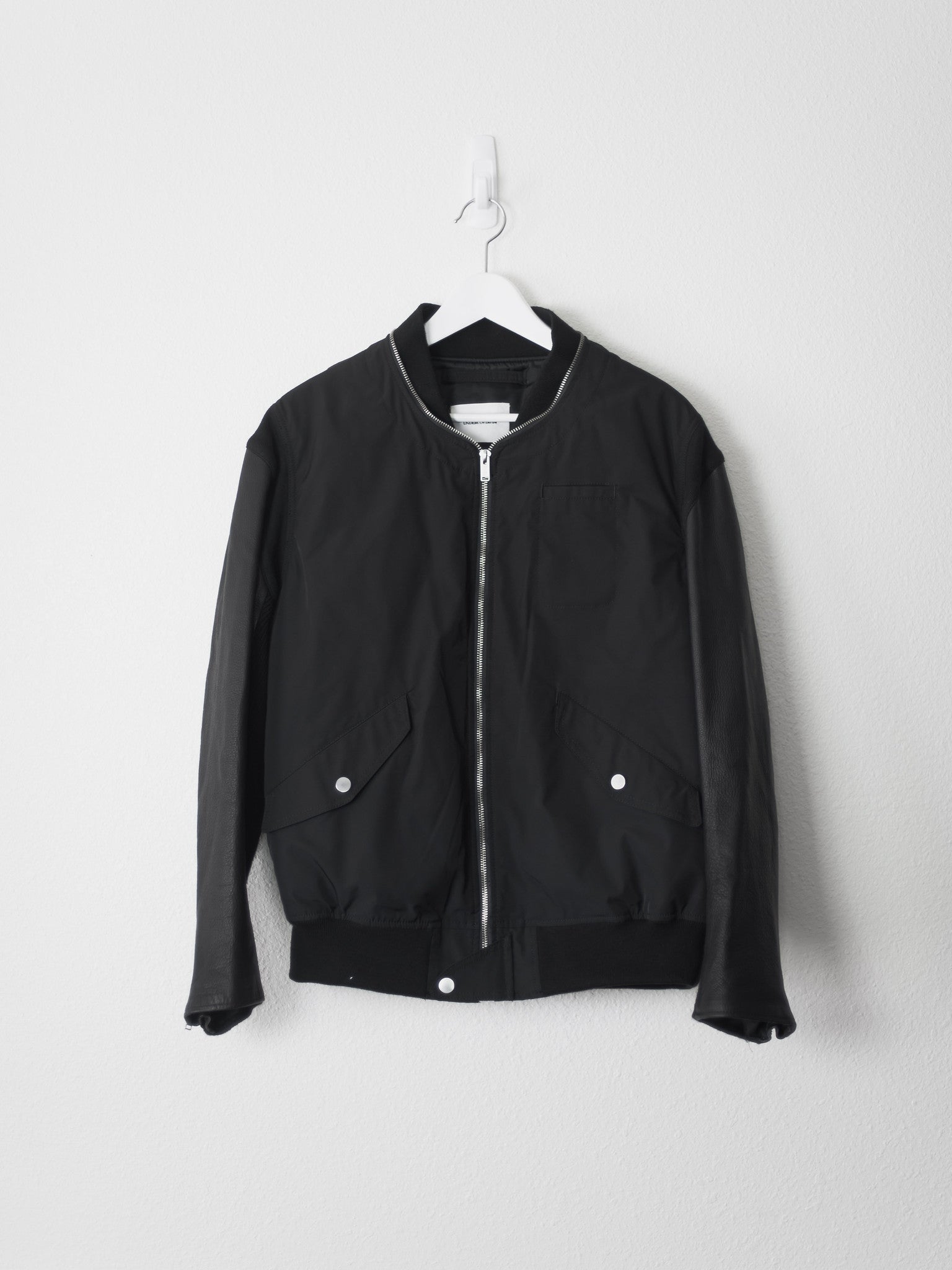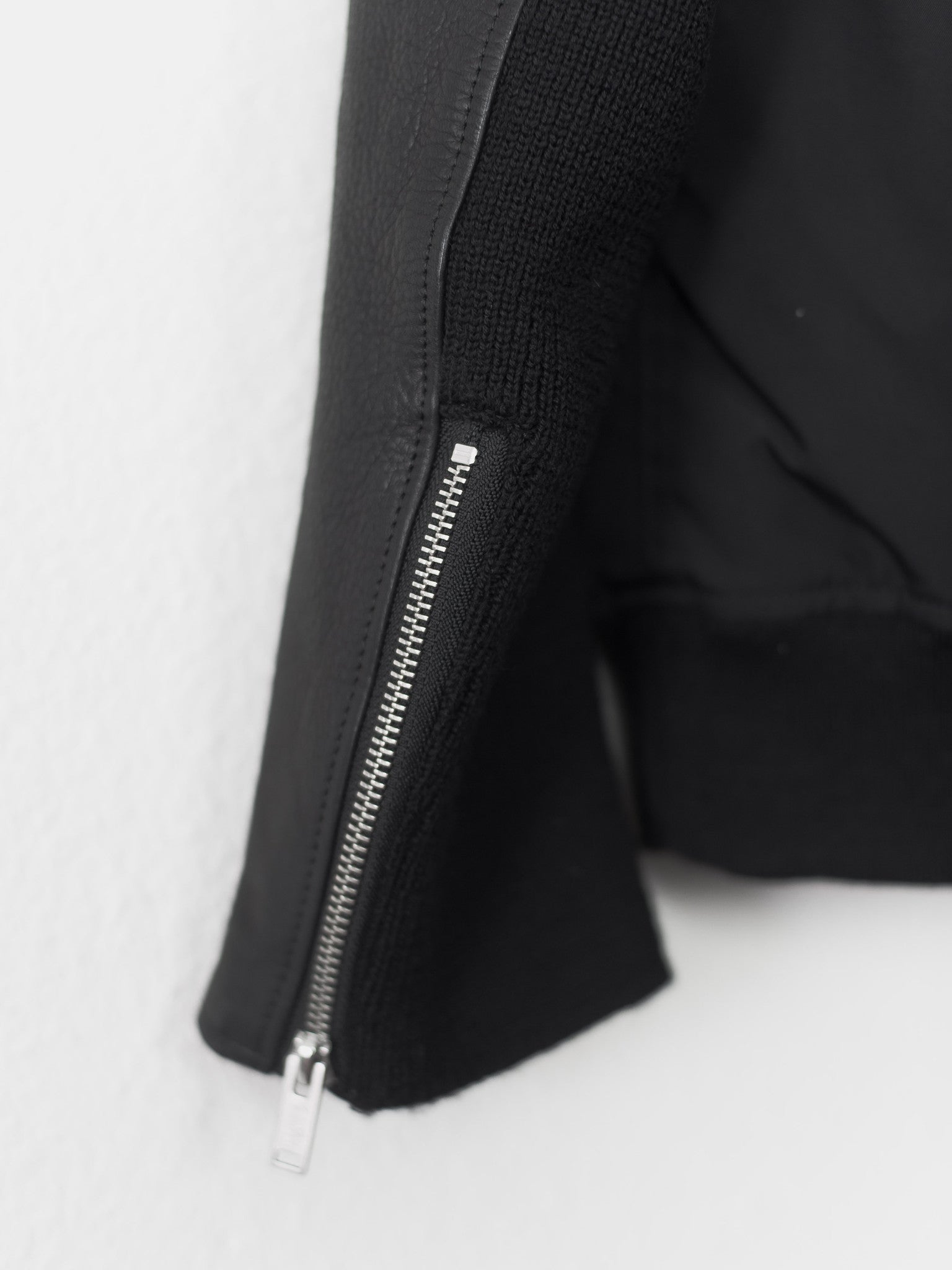 Amazing mixed composition of a padded nylon body, cowhide leather sleeves with knit wool sleeve backings and shoulders, along with a full cupro lining.