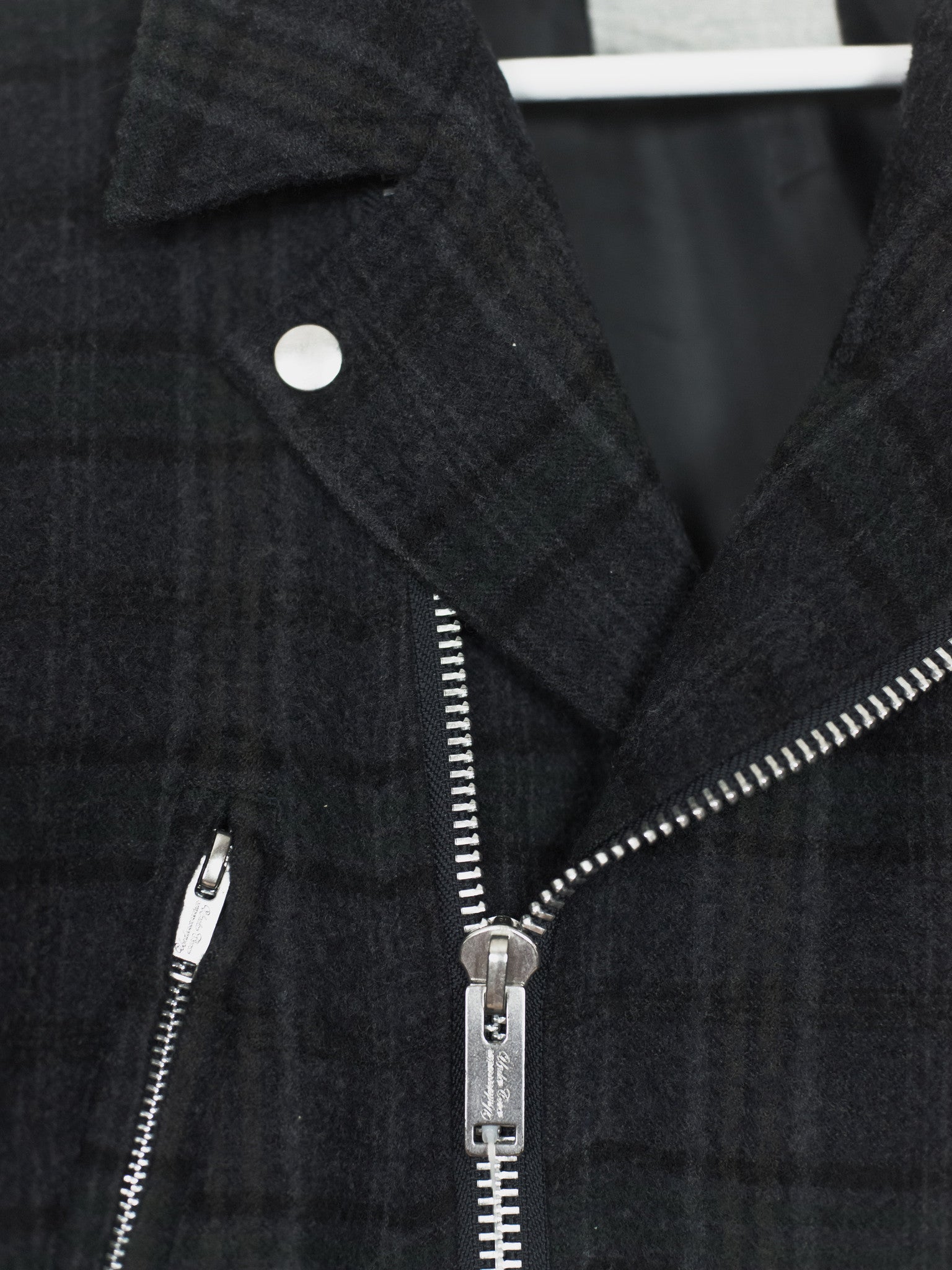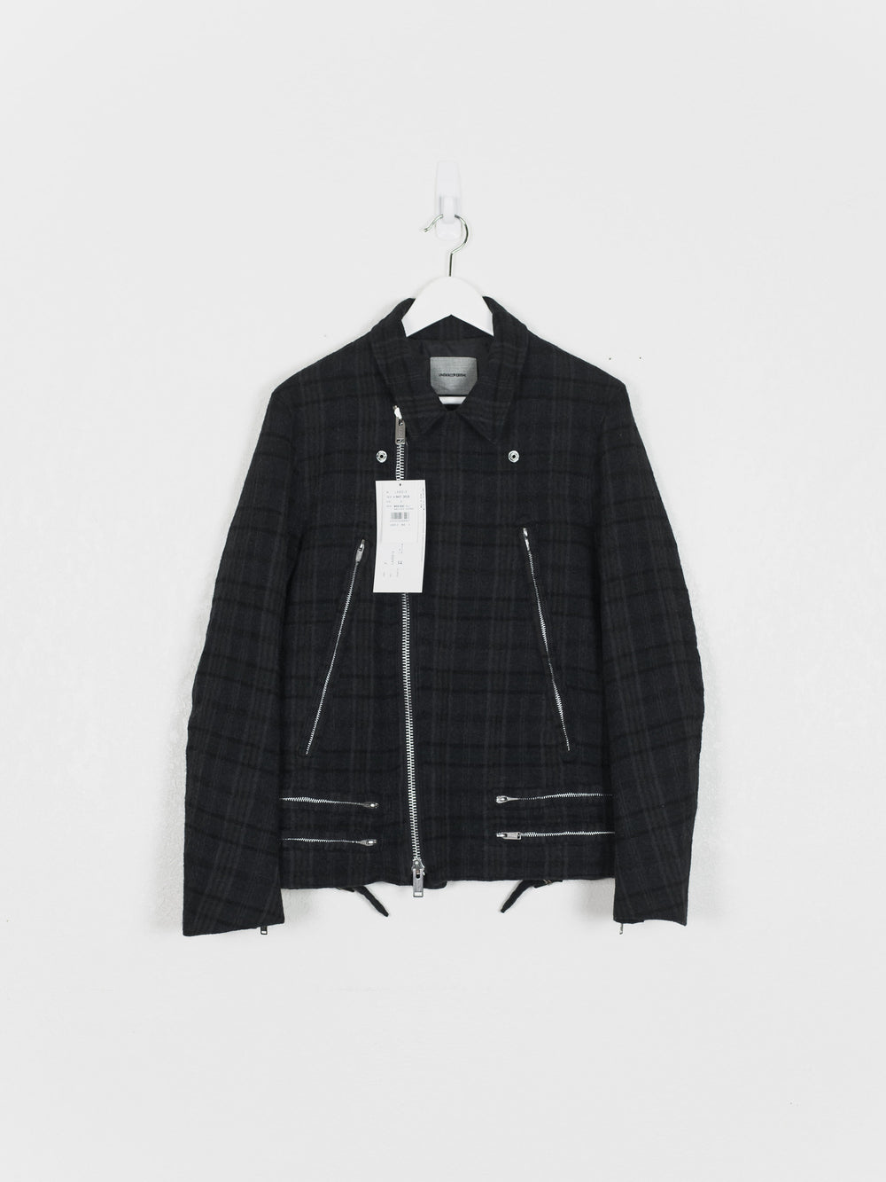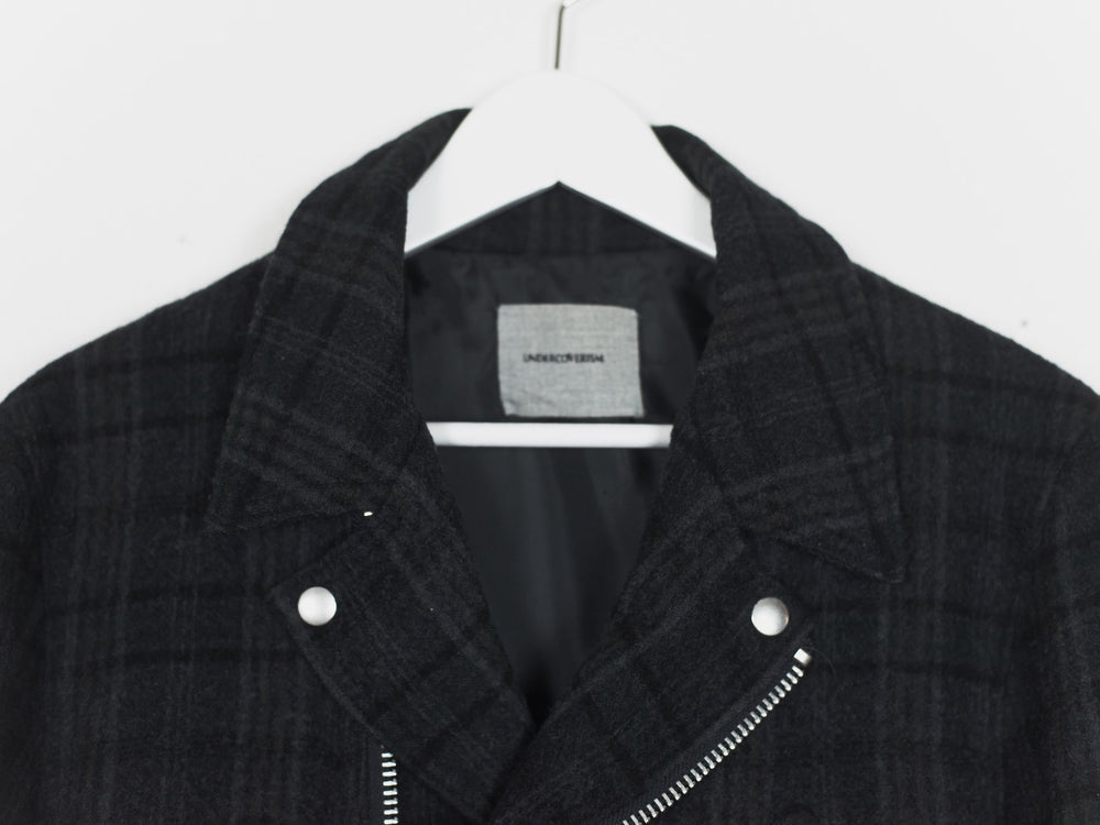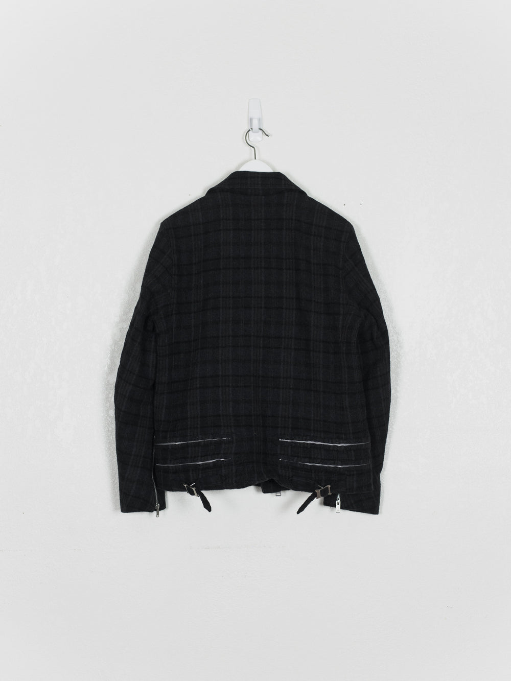 Undercover's best rider configuration from 13AW 'Anatomicouture' in flannel wool, still new with tags. Composed of a hefty charcoal, navy, and forest green wool flannel. Details include hefty Undercover embossed zippers throughout, main double zip, large front pockets, two zip-around pockets, and rear adjuster buckles. Made in Japan. Retailed for ¥84,000.