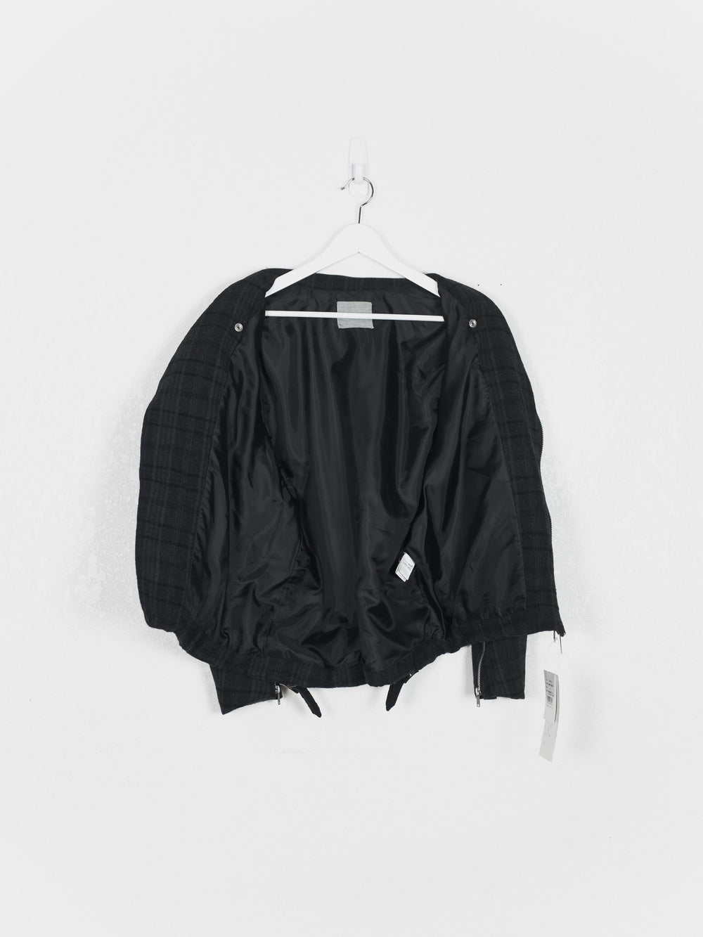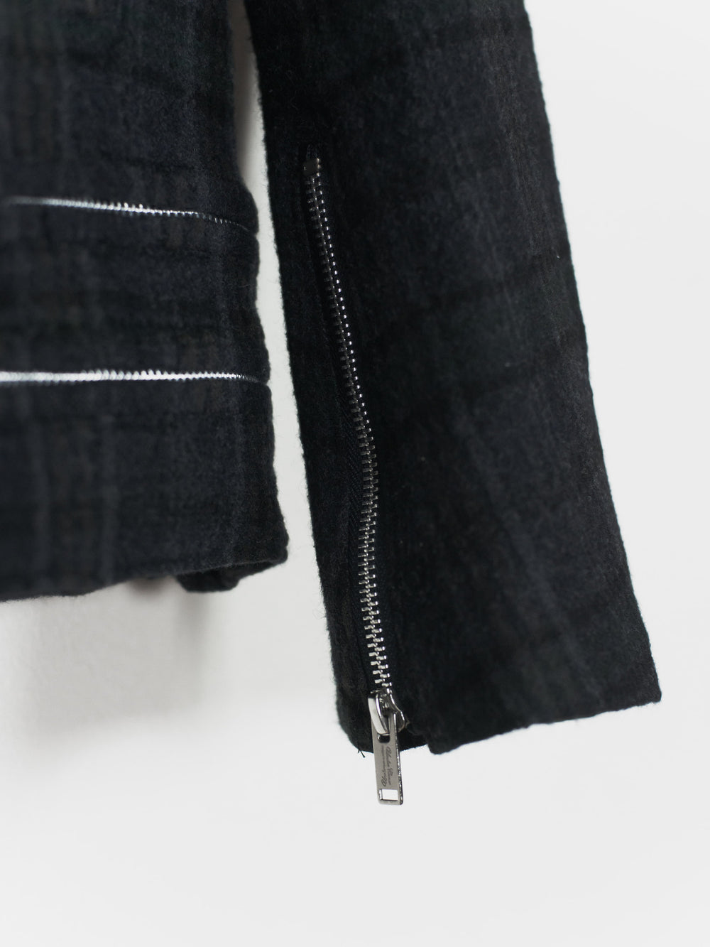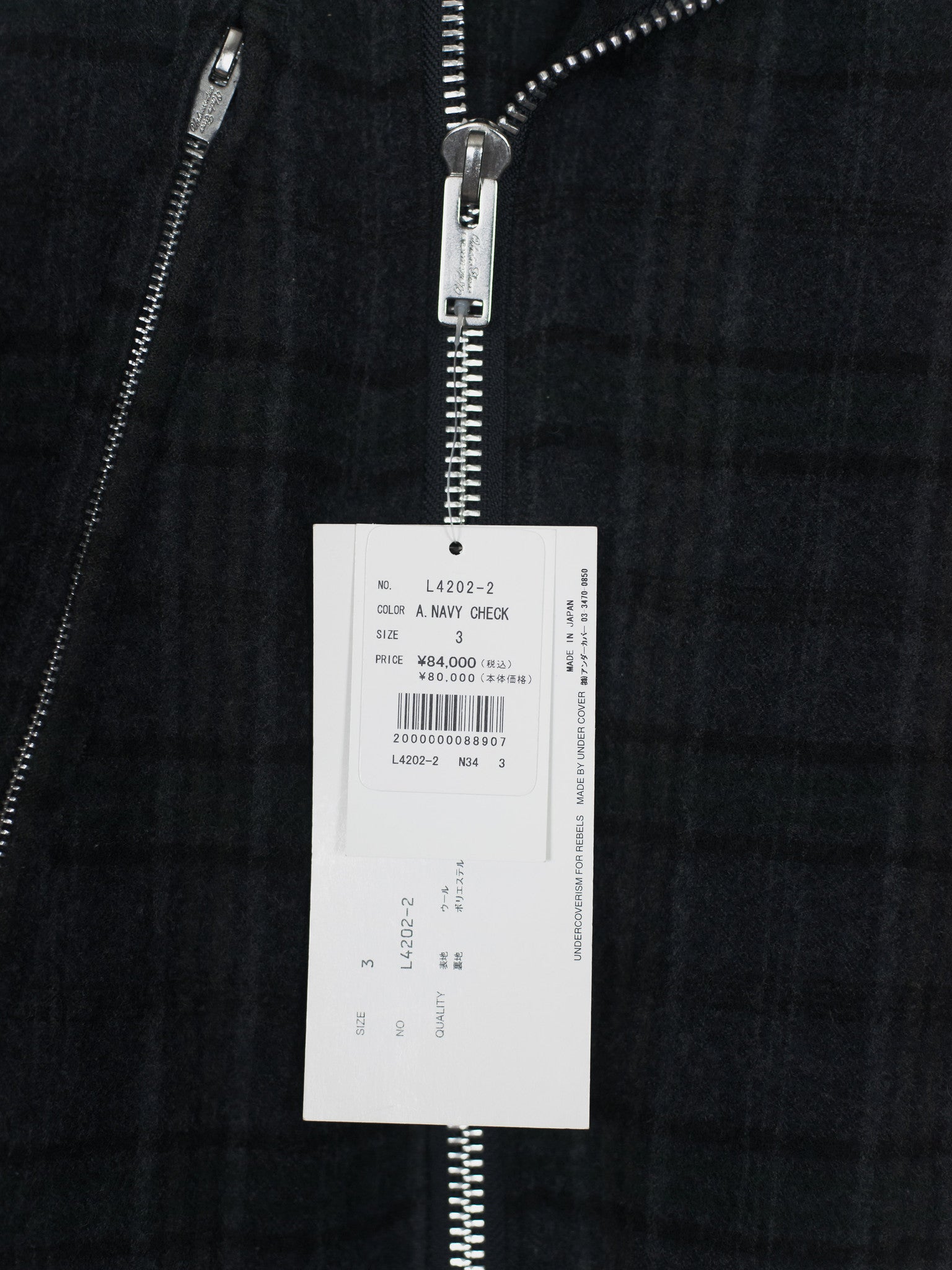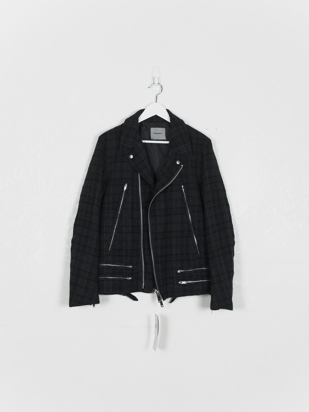 Undercover's best rider configuration from 13AW 'Anatomicouture' in flannel wool, still new with tags. Composed of a hefty charcoal, navy, and forest green wool flannel. Details include hefty Undercover embossed zippers throughout, main double zip, large front pockets, two zip-around pockets, and rear adjuster buckles. Made in Japan. Retailed for ¥84,000.