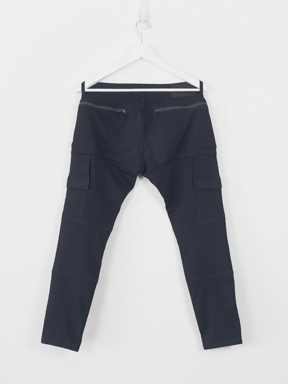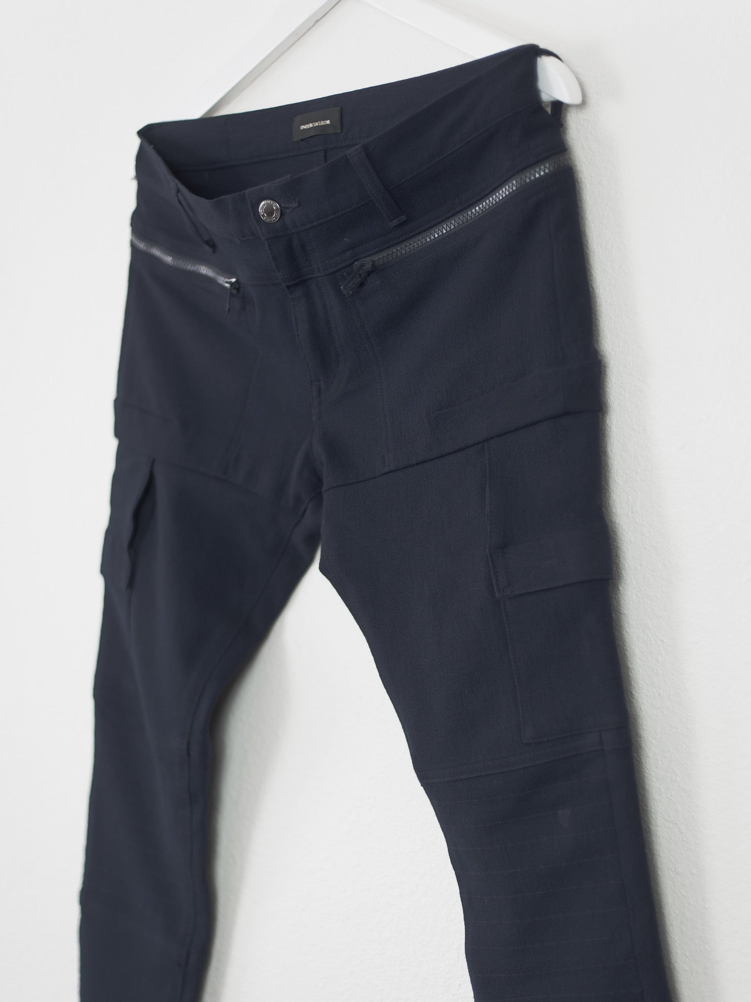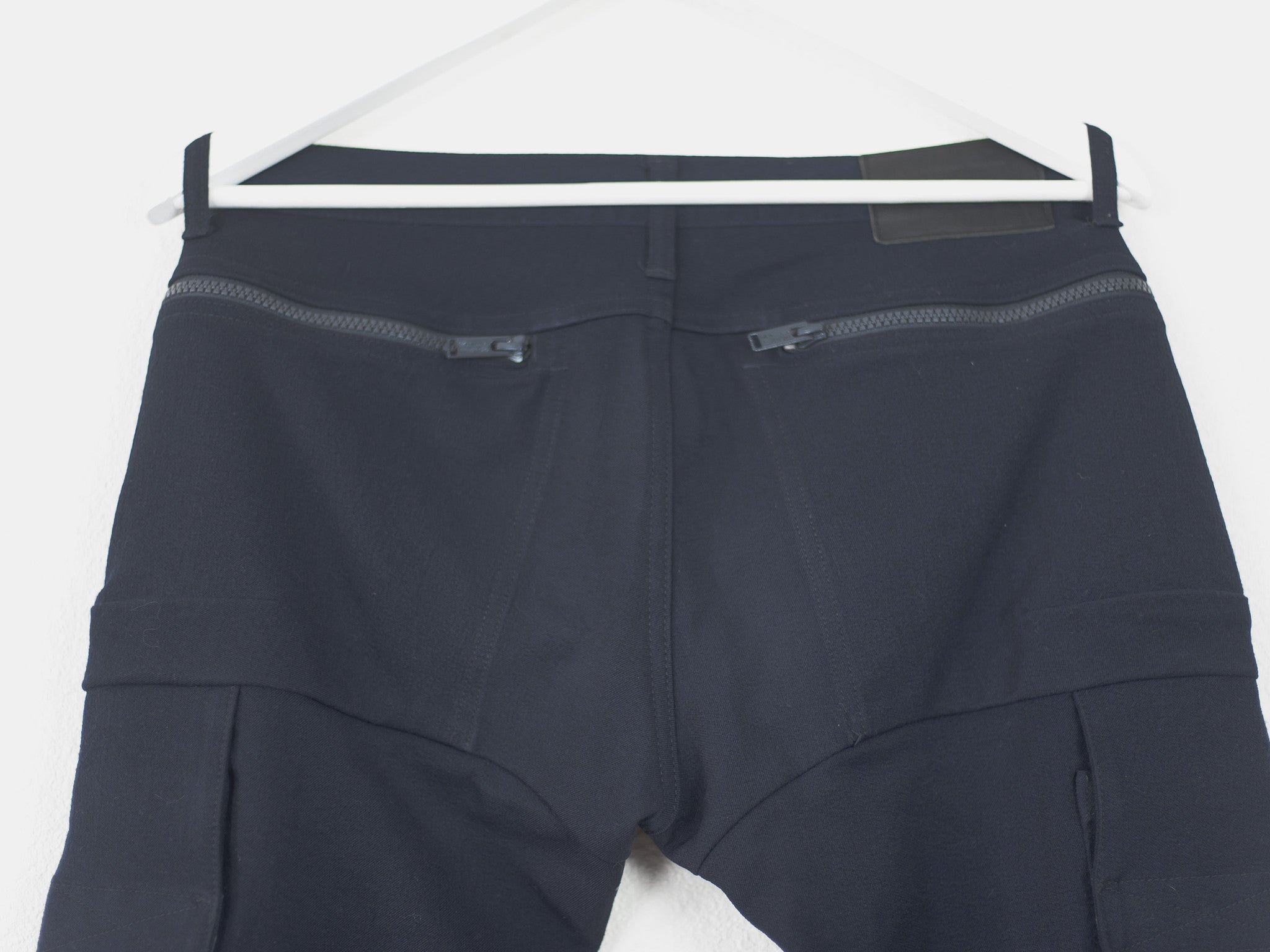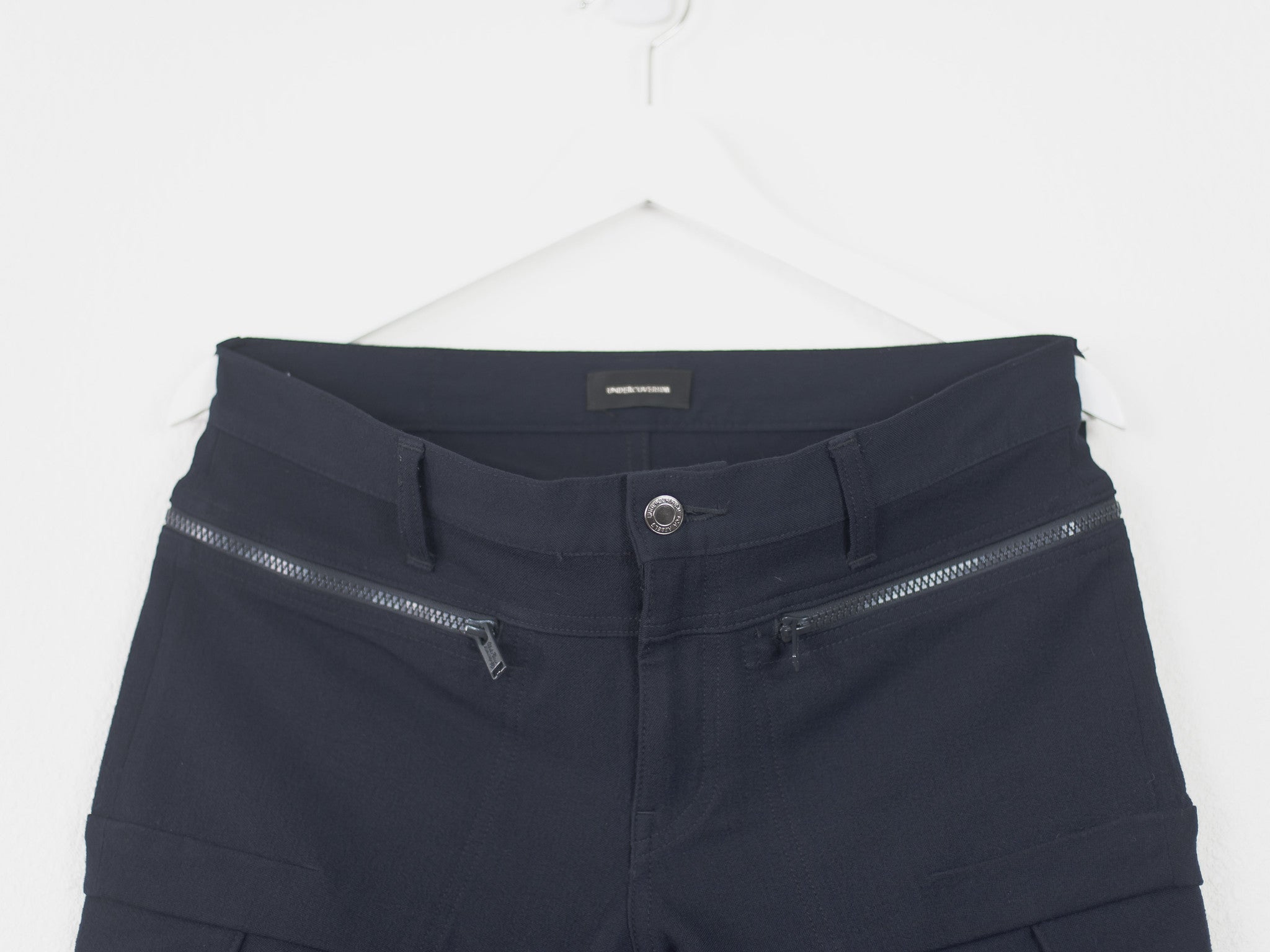 Coveted pants by Undercover from 14AW in the rarer cropped navy wool iteration. Incredible details with the chunky double zips connecting the rear and front pockets, creating a very wide space for storage, in addition to two thigh pockets and biker seam details on the knee. The rear patch says "We make noise not clothes / Undercover / Undercoversim". Made in Japan. 9.5/10 condition, no flaws.