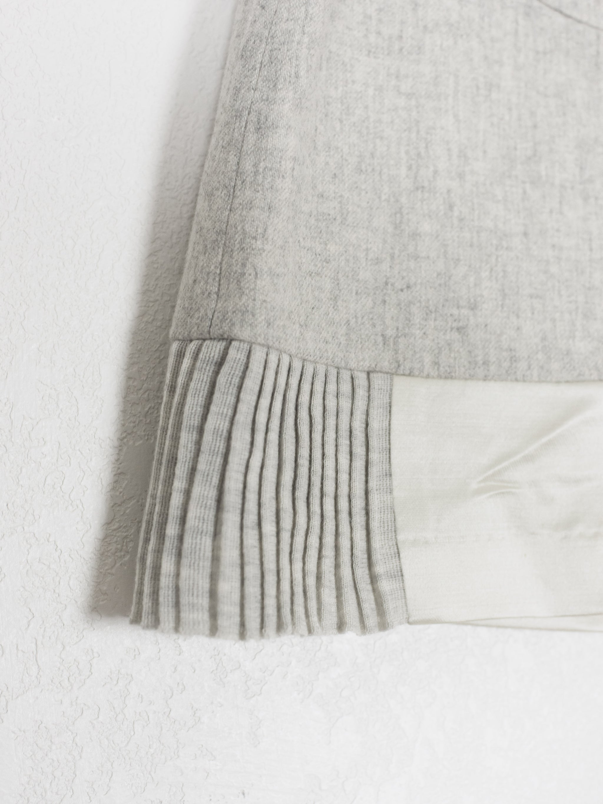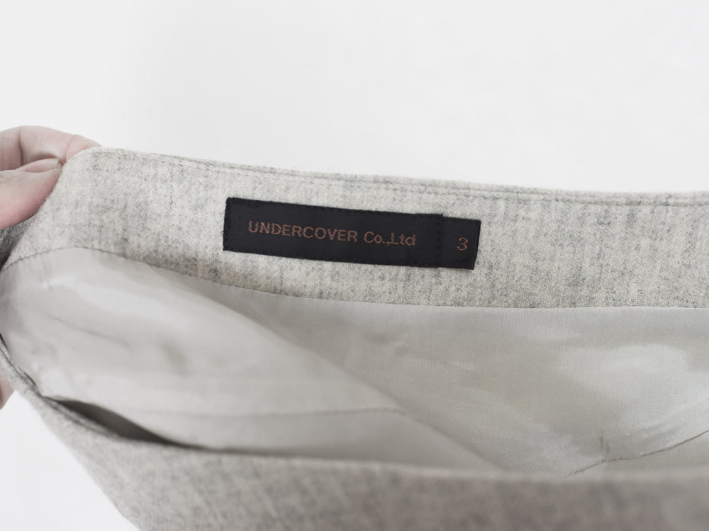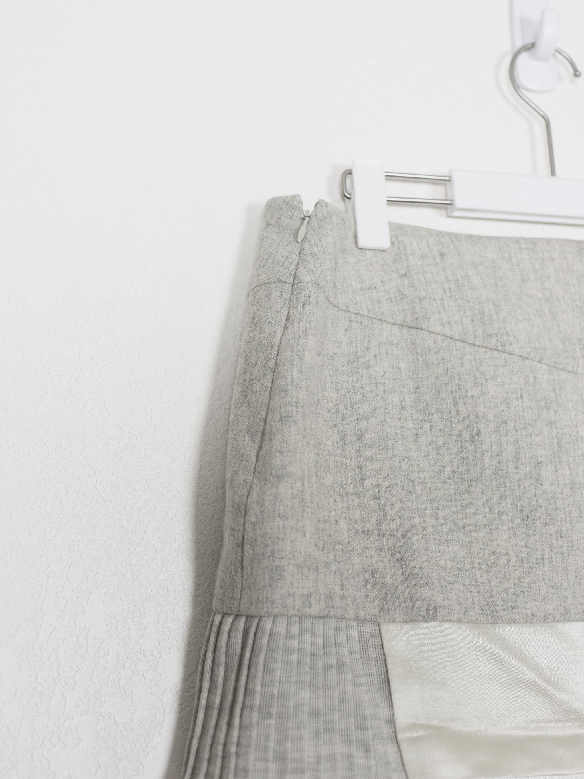 Beautifully structured and futuristic mini skirt with contrasting fabrics and seams. Main wool body with silk panelling. Featured as part of an AW07 ensemble outfit.