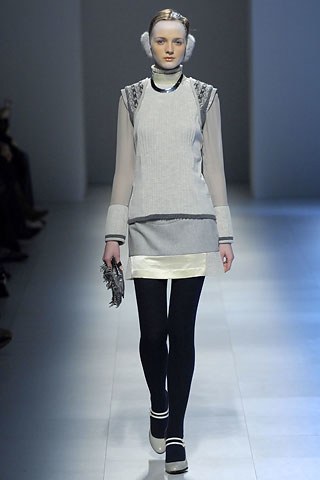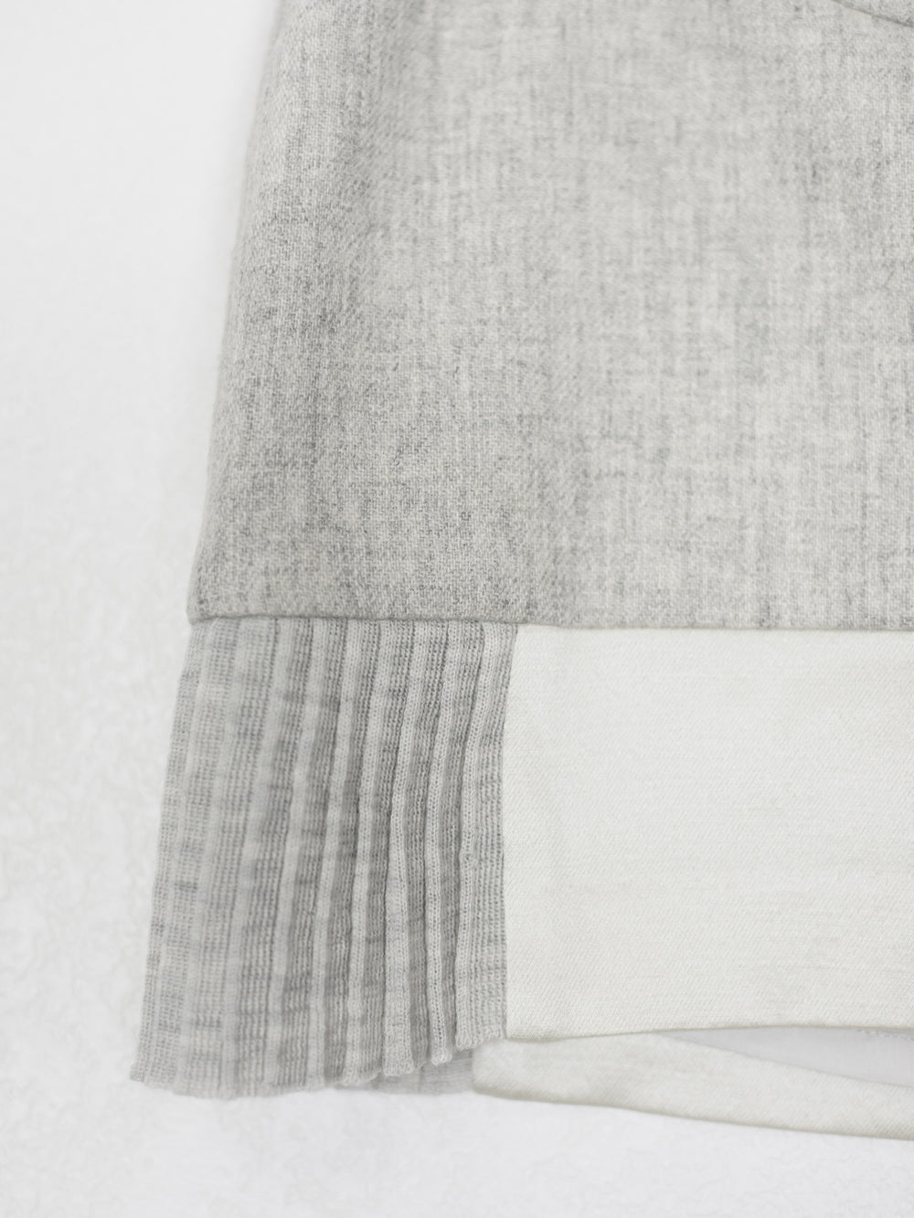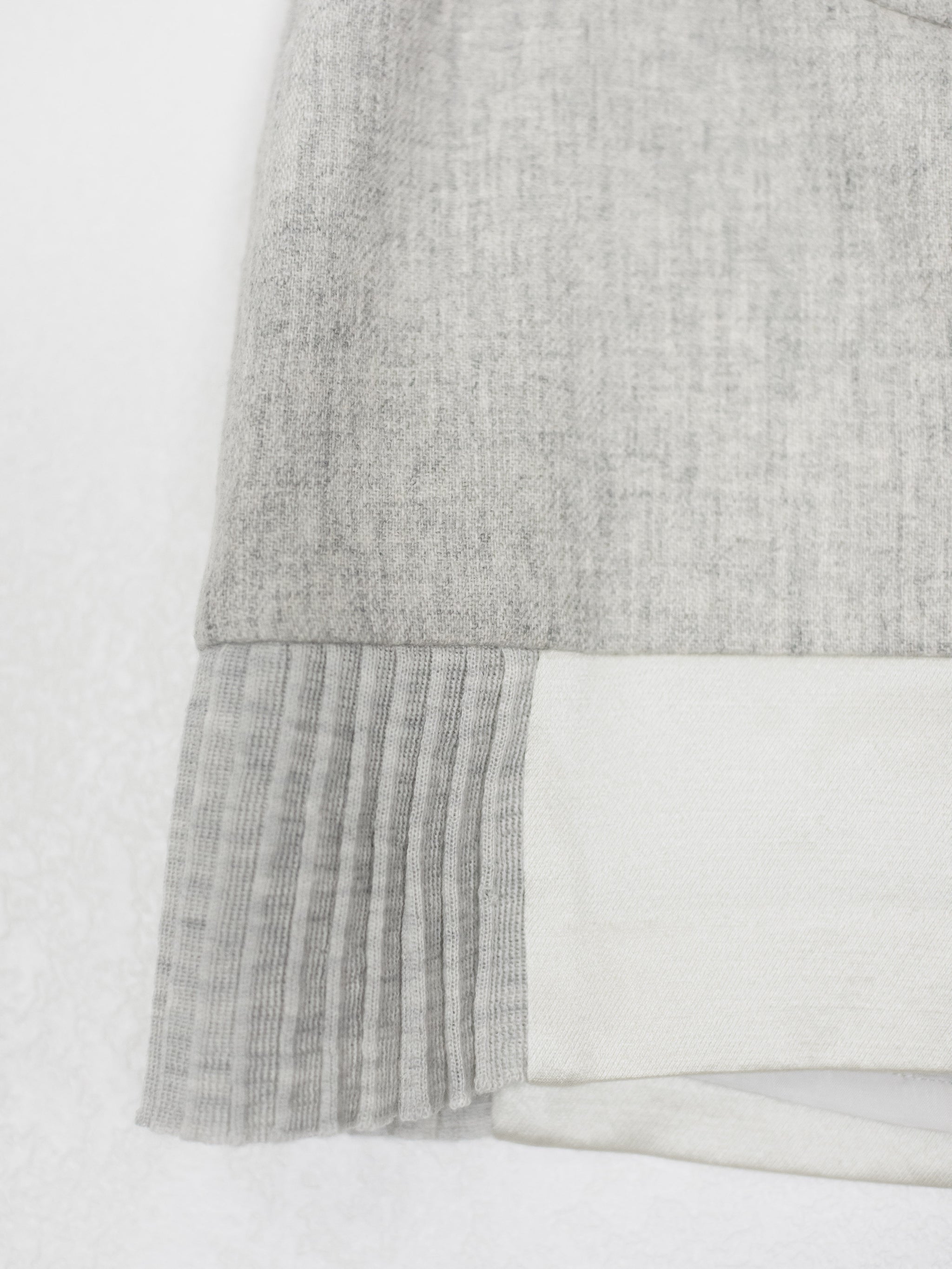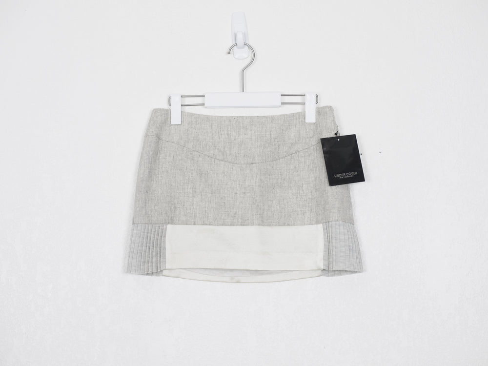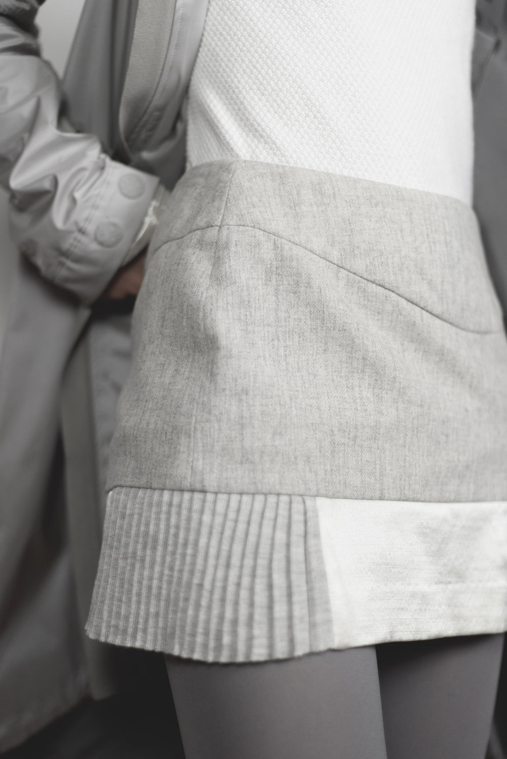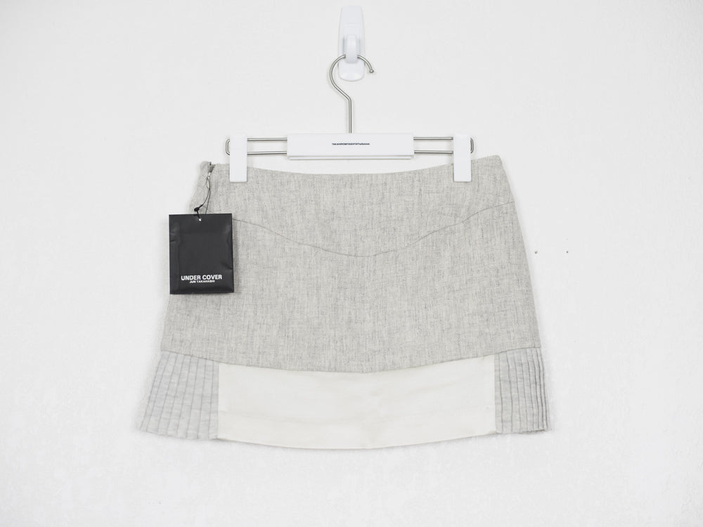 Beautifully structured and futuristic mini skirt with contrasting fabrics and seams. Main wool body with silk panelling. Featured as part of an AW07 ensemble outfit.