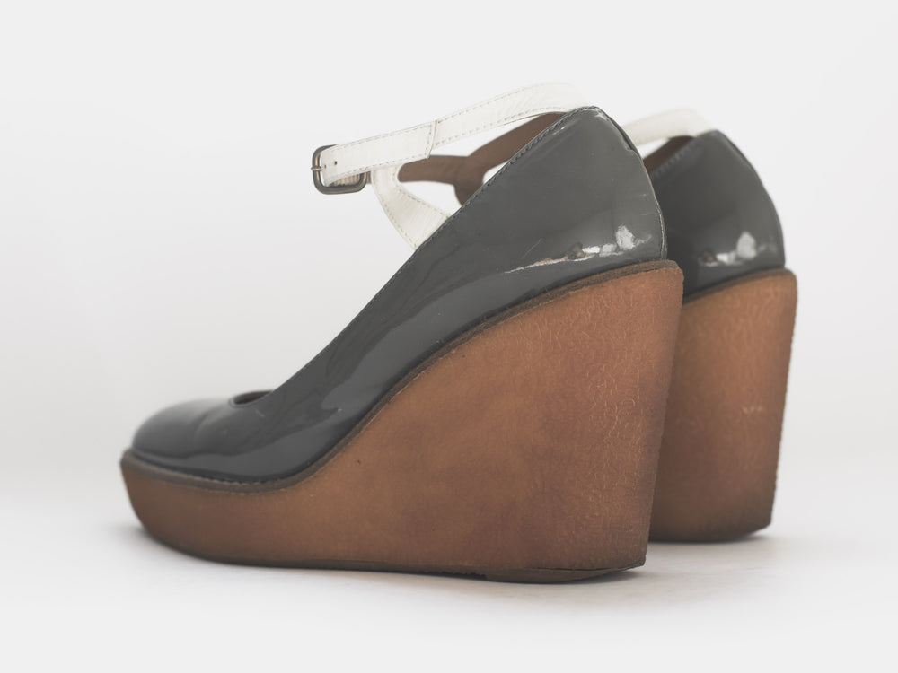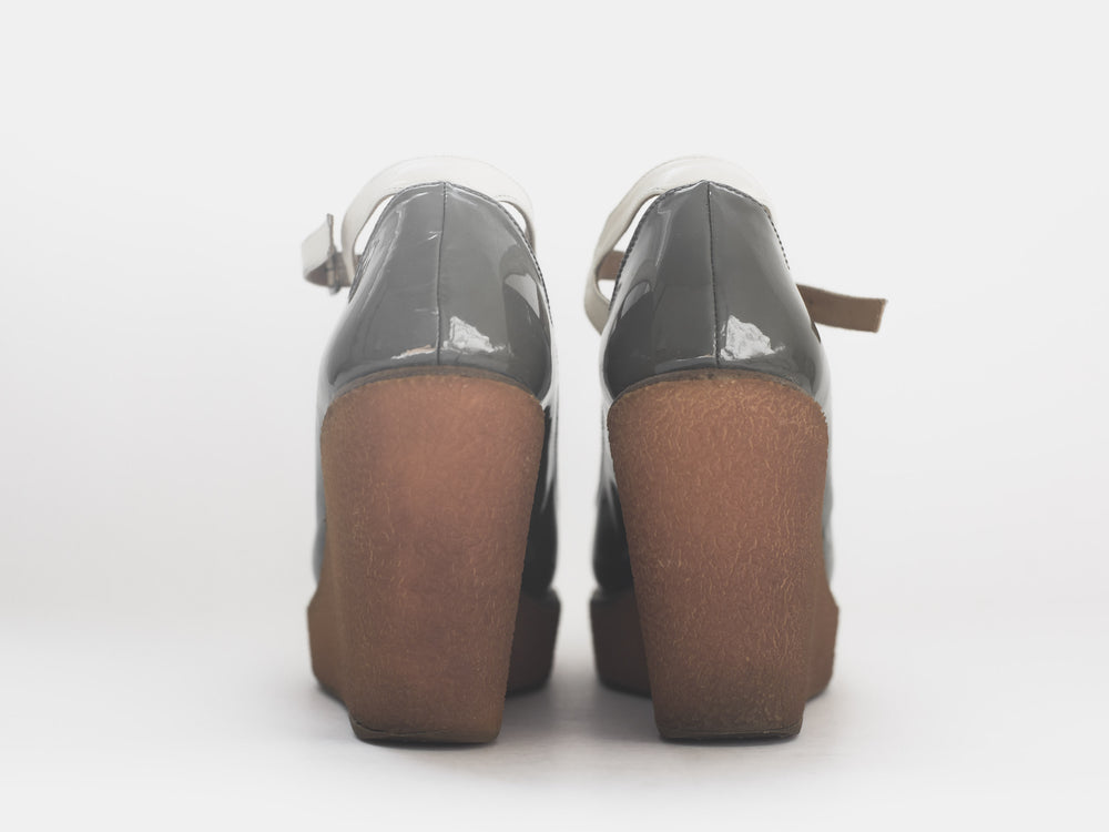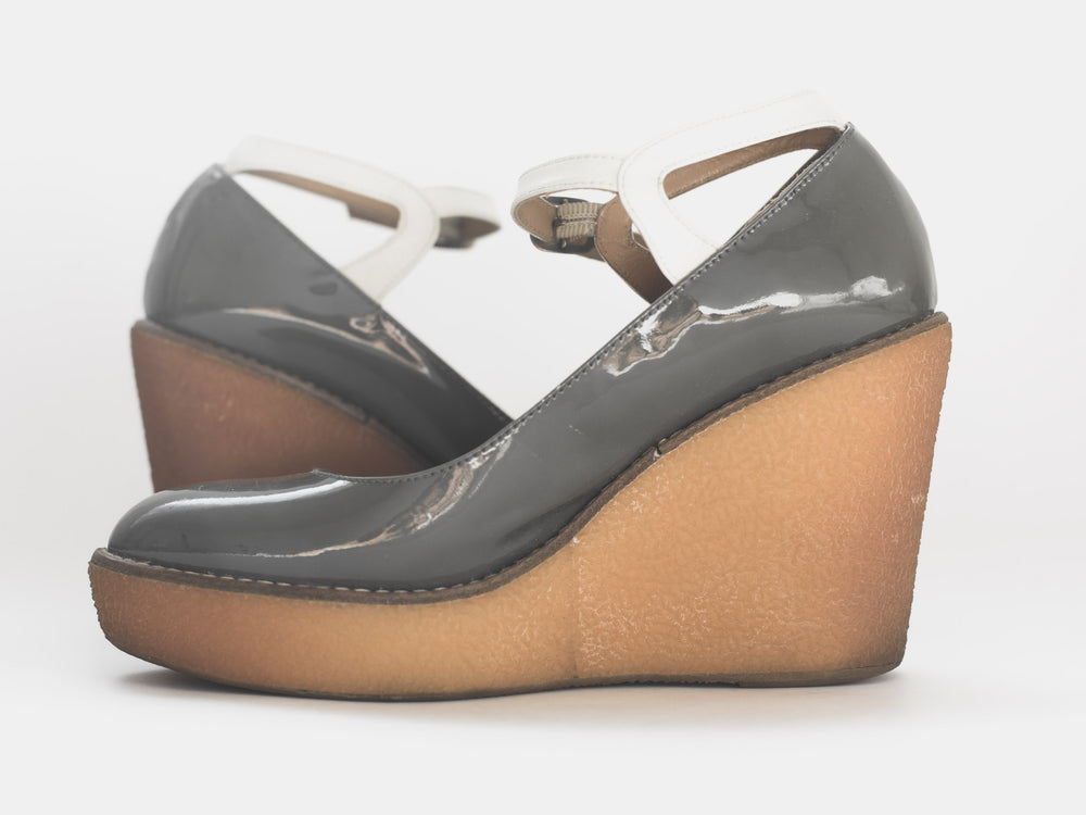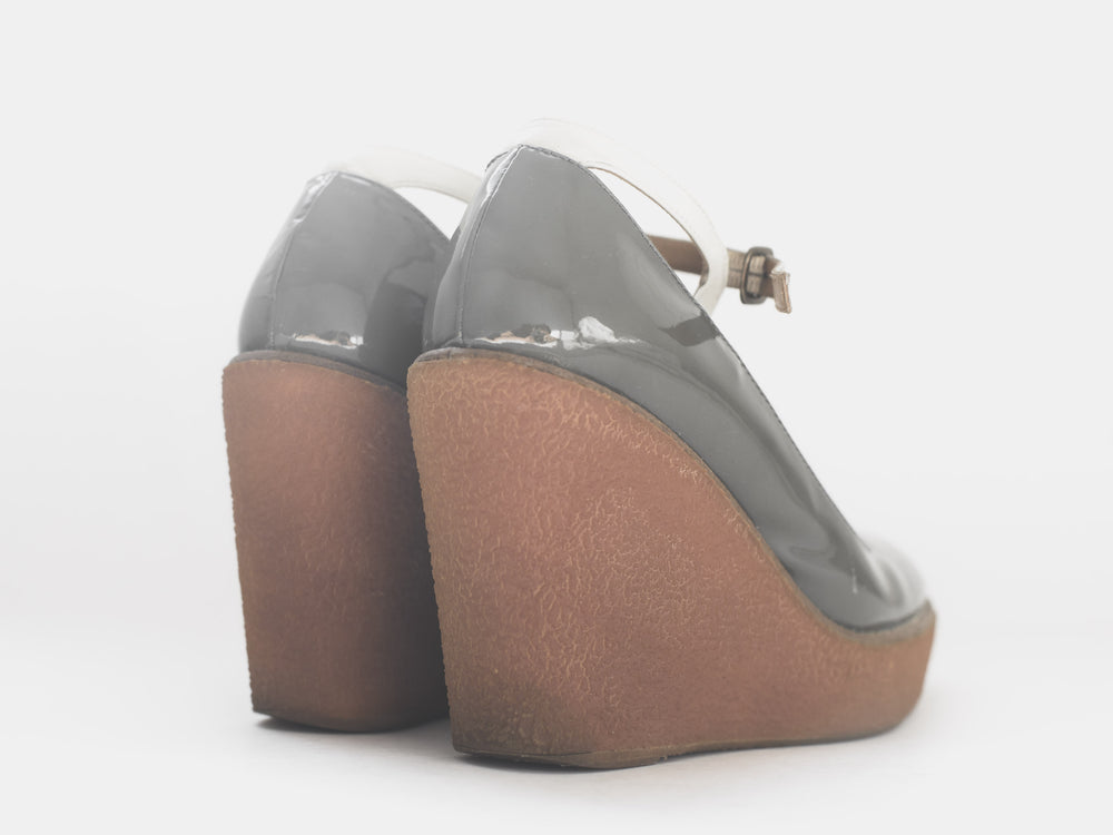 Created in collaboration with Spanish classic shoemaker Castañer, Jun Takahashi reinterprets their classic espadrille silhouette with a technical upgrade true to AW07. Rather than the traditional canvas upper and esparto rope sole, the shoes which are featured centrally throughout the season, consist of a weather resistant patent leather resting on grippy gum soles.