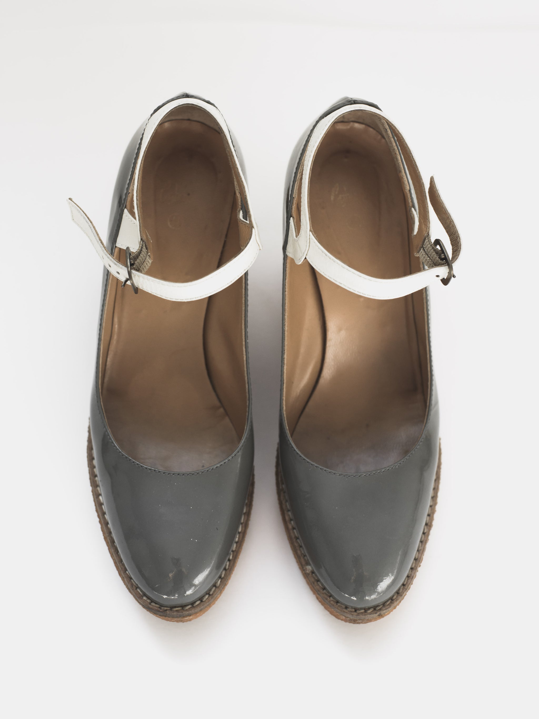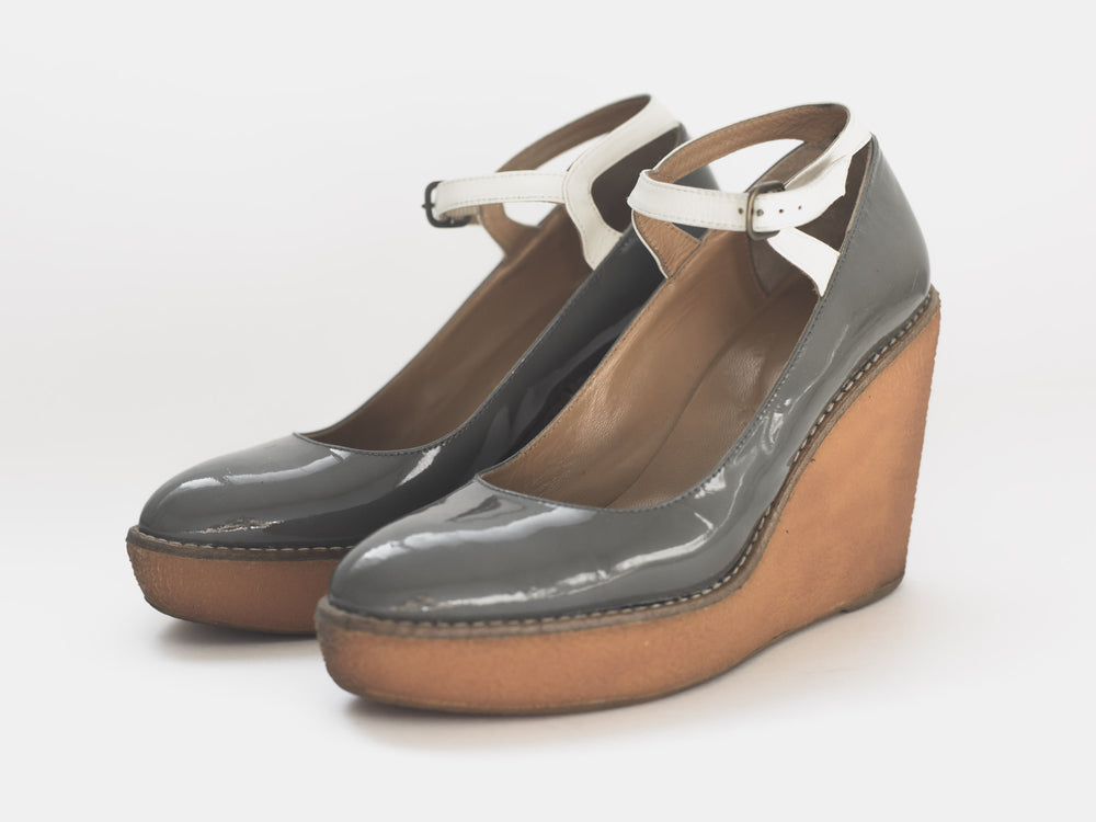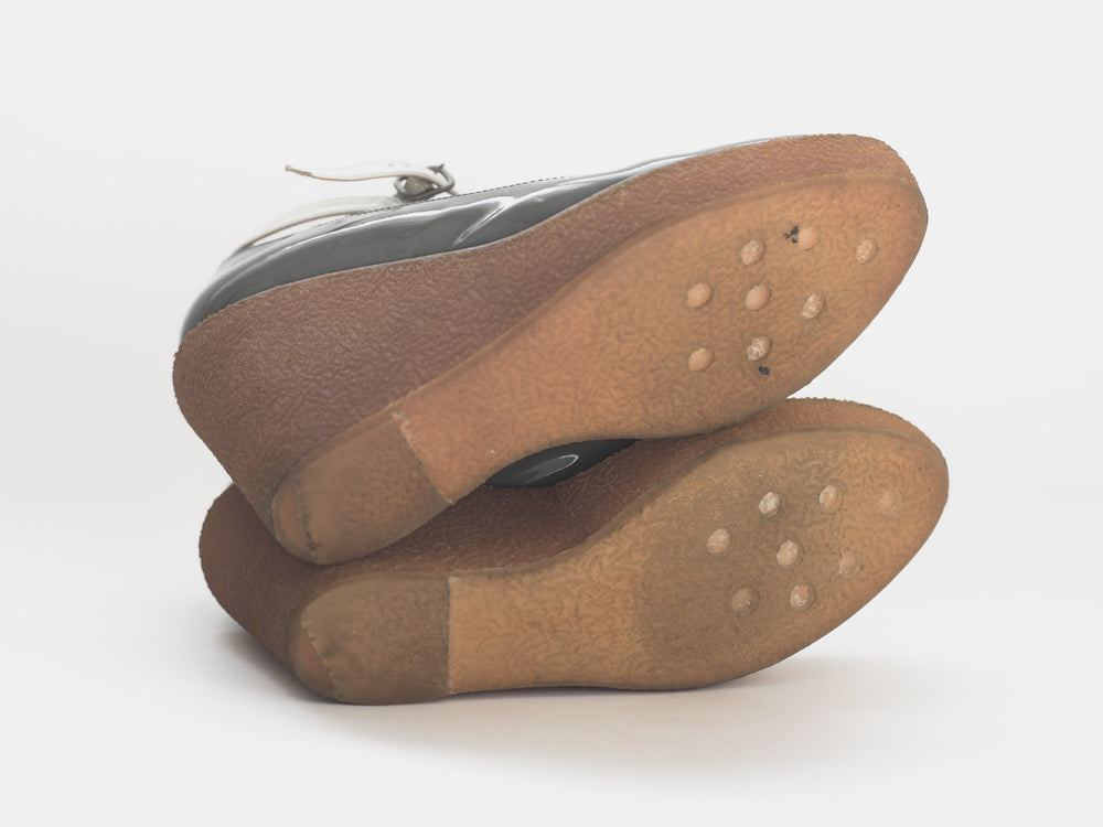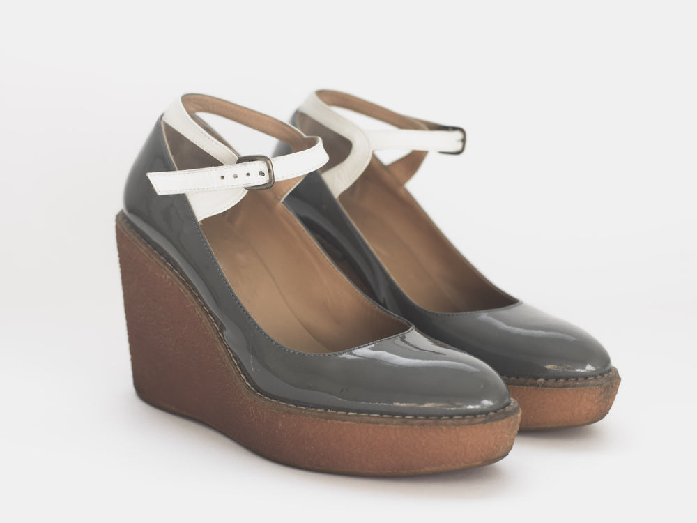 Created in collaboration with Spanish classic shoemaker Castañer, Jun Takahashi reinterprets their classic espadrille silhouette with a technical upgrade true to AW07. Rather than the traditional canvas upper and esparto rope sole, the shoes which are featured centrally throughout the season, consist of a weather resistant patent leather resting on grippy gum soles.