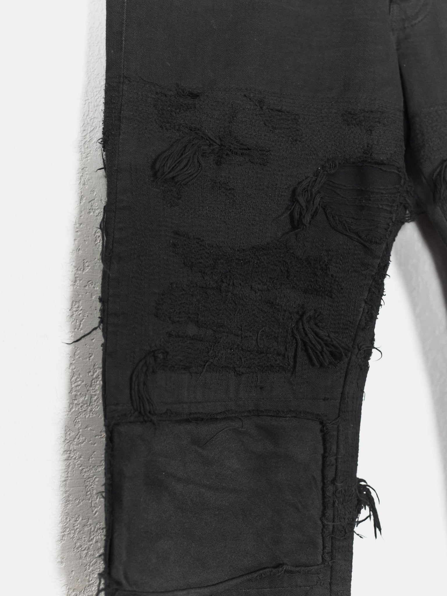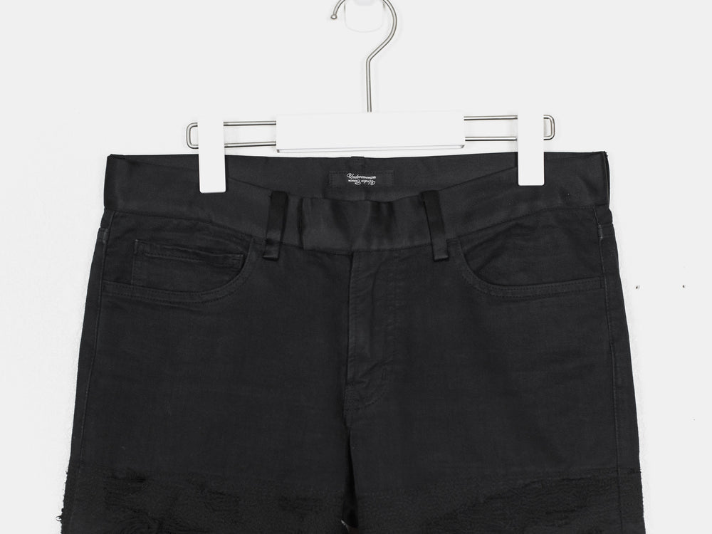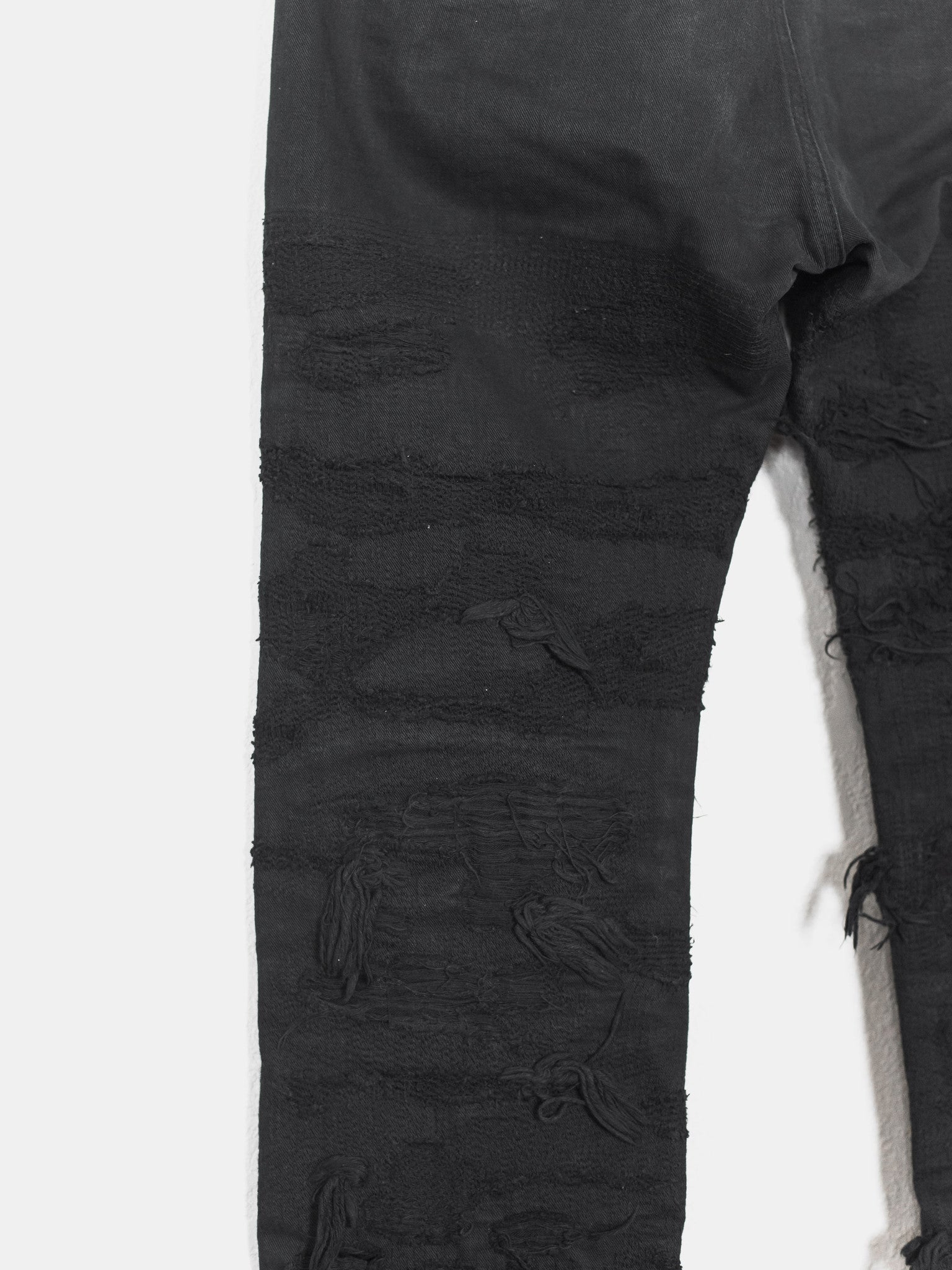 Absolutely stunning and highly coveted jeans from one of Undercover's best seasons. Super hefty construction and amazing hand crafted topographies that can only be fully appreciated in person. Very similar distressing to the 85s, but inherently more wearable and easier to put on since the "holes" are patched and stitched. Detailed with a silk waist, patches, and pocket flaps, plus an embroidered tag on the hem.