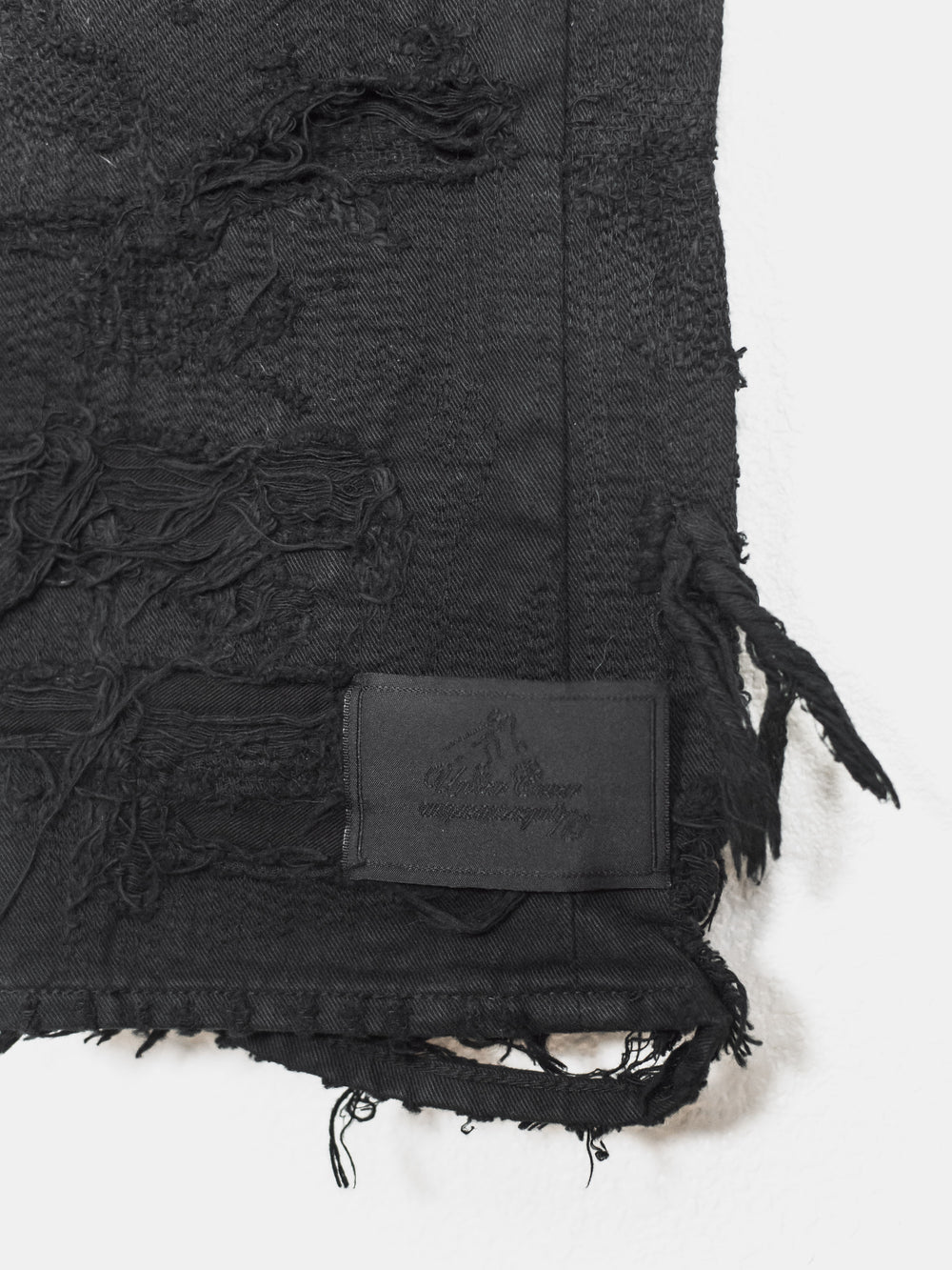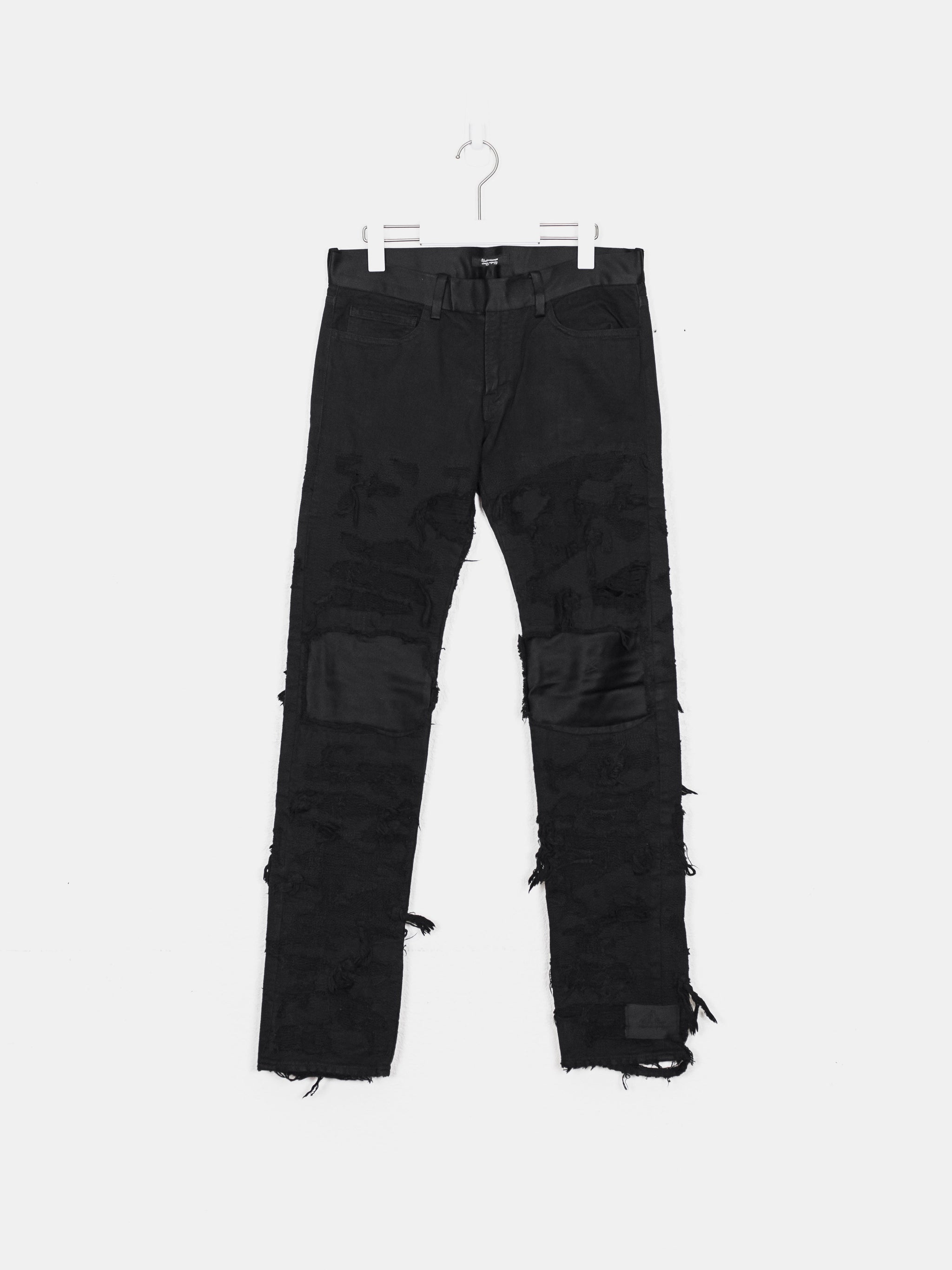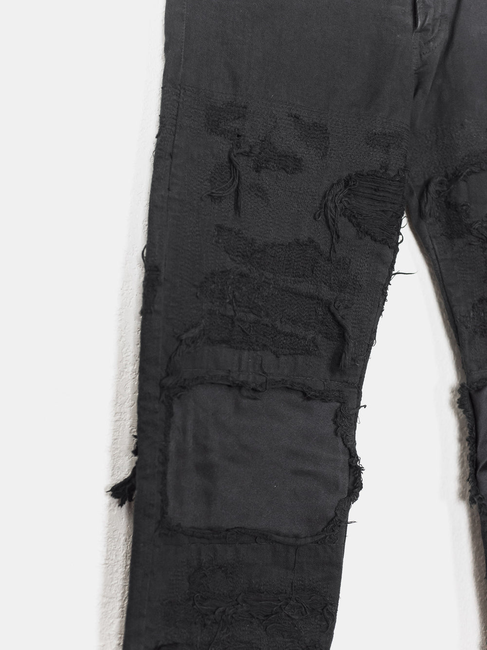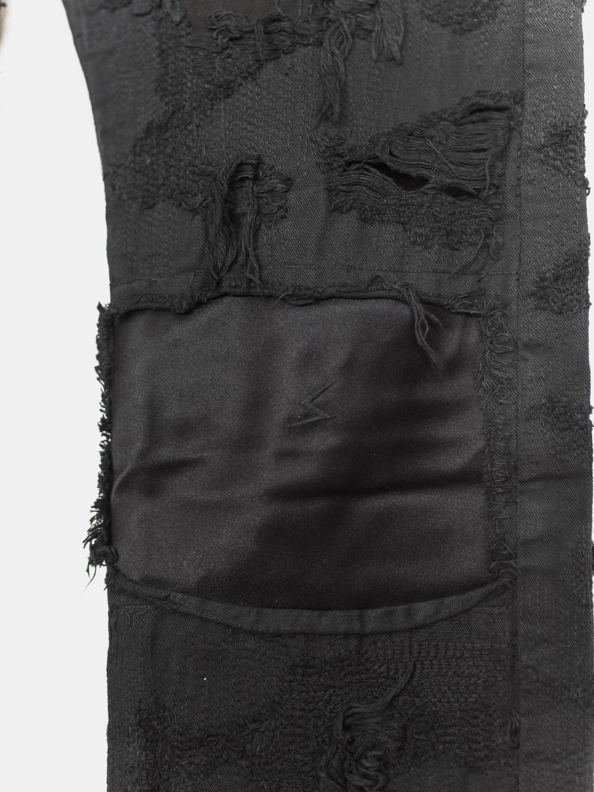 Absolutely stunning and highly coveted jeans from one of Undercover's best seasons. Super hefty construction and amazing hand crafted topographies that can only be fully appreciated in person. Similar distressing to the 85s, but inherently more wearable and easier to put on since the "holes" are patched and stitched. Detailed with a silk waist, patches, and pocket flaps, plus an embroidered tag on the hem.