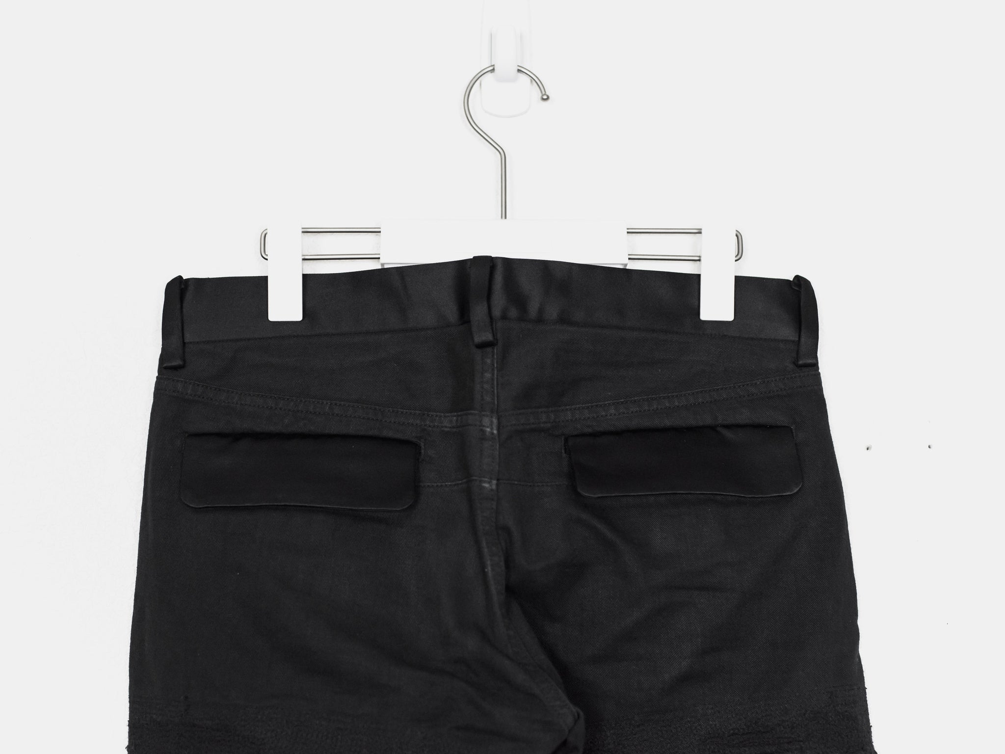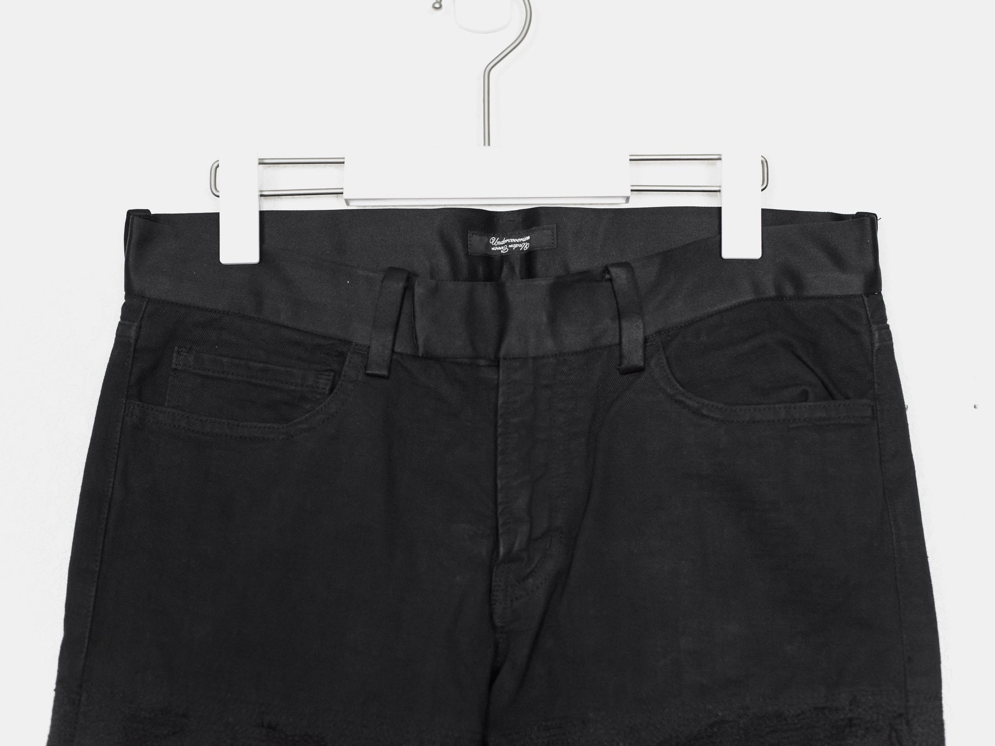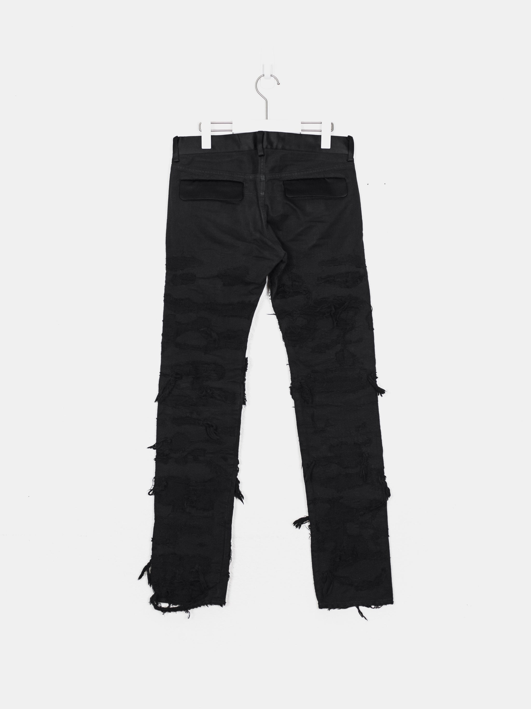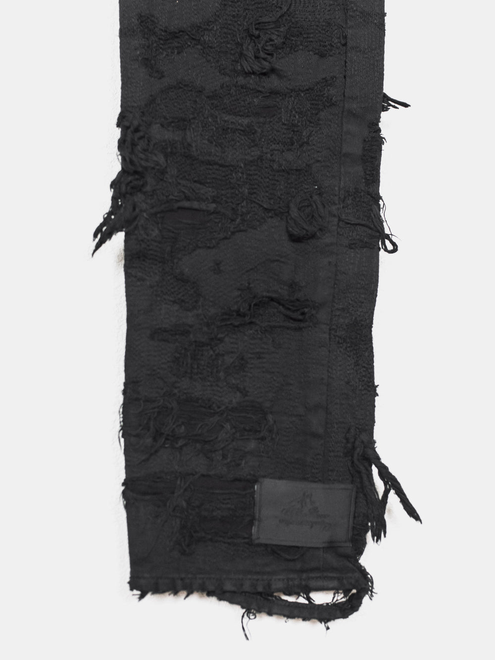 Absolutely stunning and highly coveted jeans from one of Undercover's best seasons. Super hefty construction and amazing hand crafted topographies that can only be fully appreciated in person. Similar distressing to the 85s, but inherently more wearable and easier to put on since the "holes" are patched and stitched. Detailed with a silk waist, patches, and pocket flaps, plus an embroidered tag on the hem.