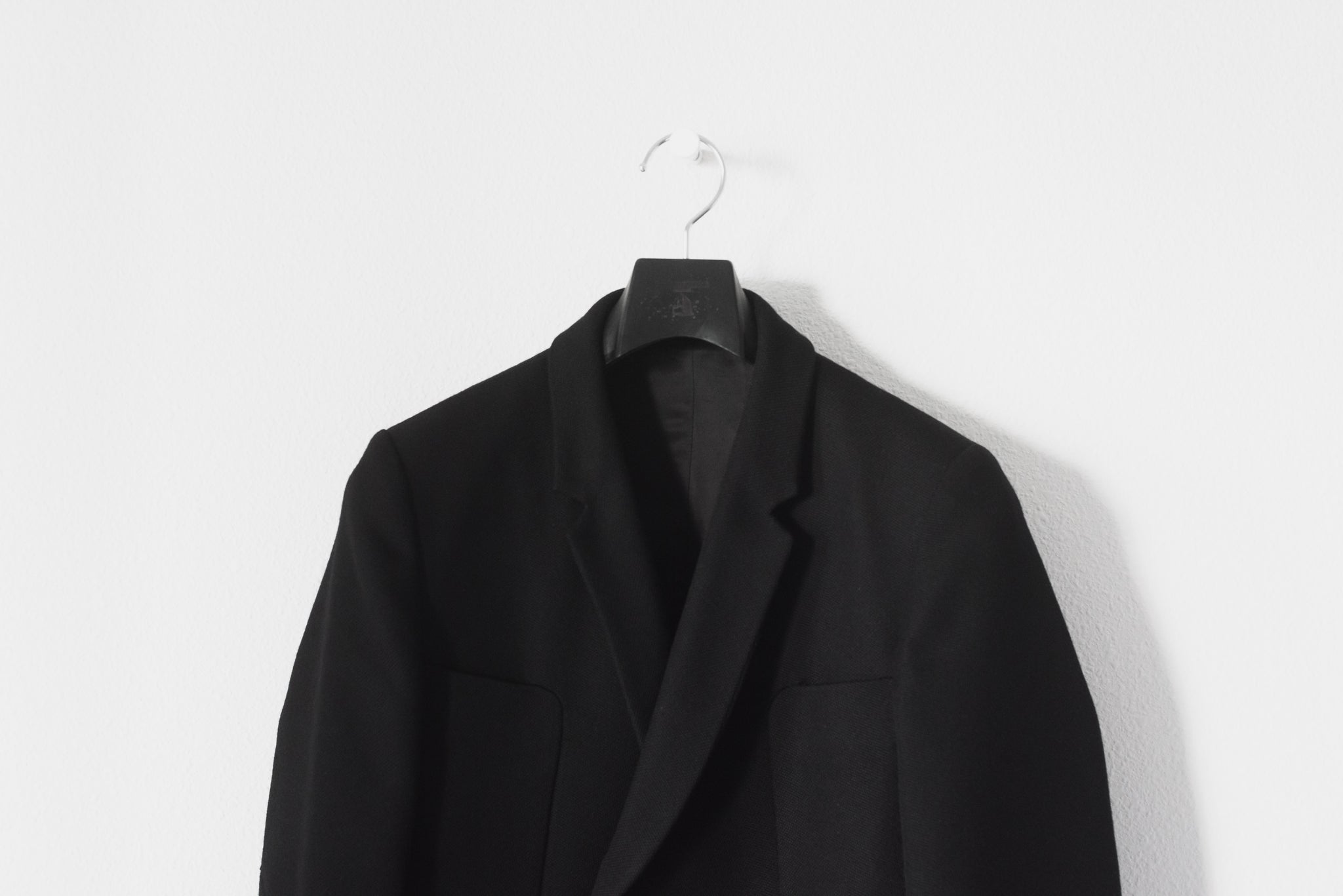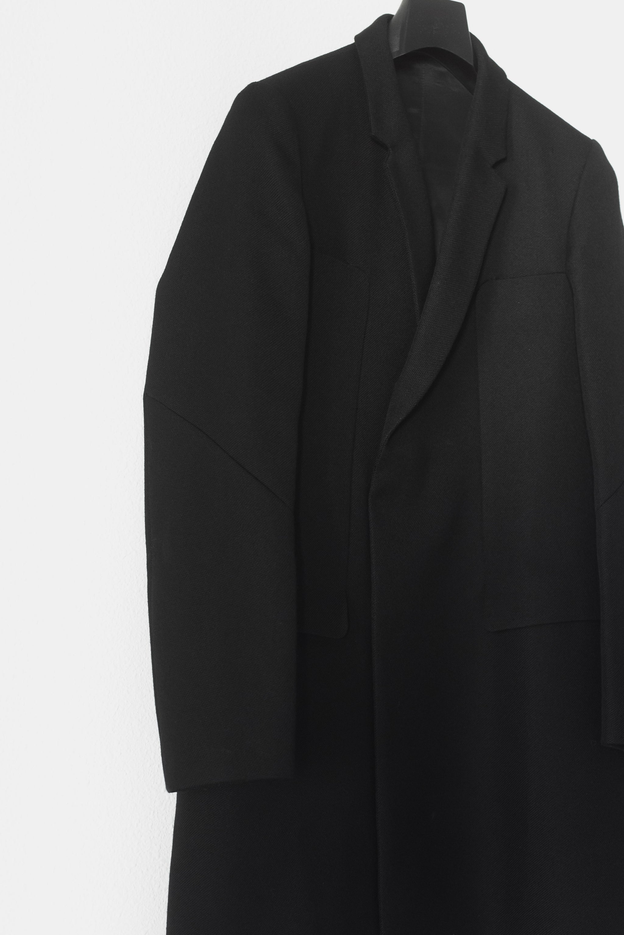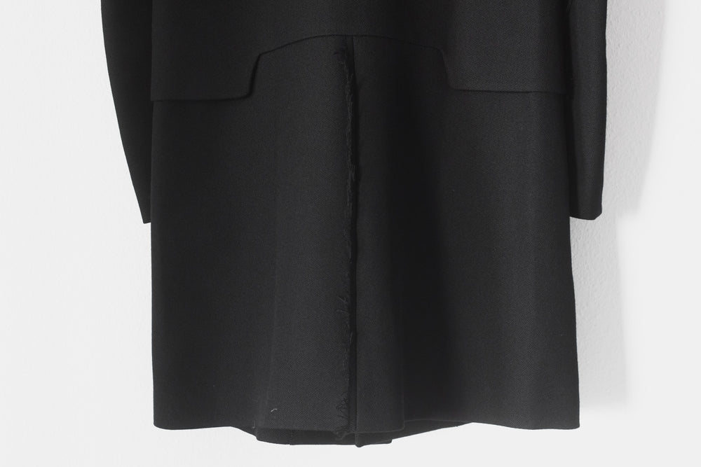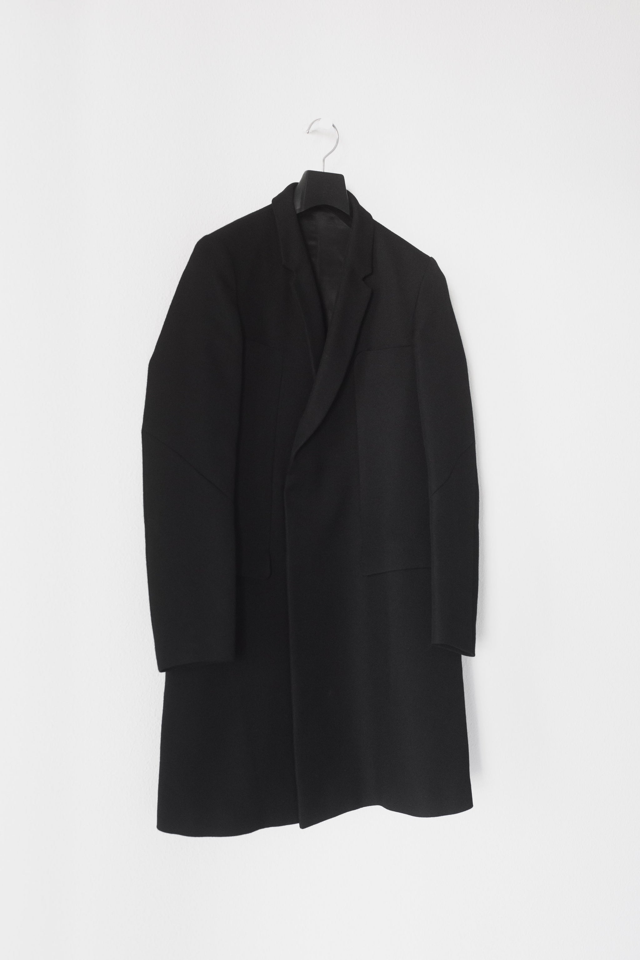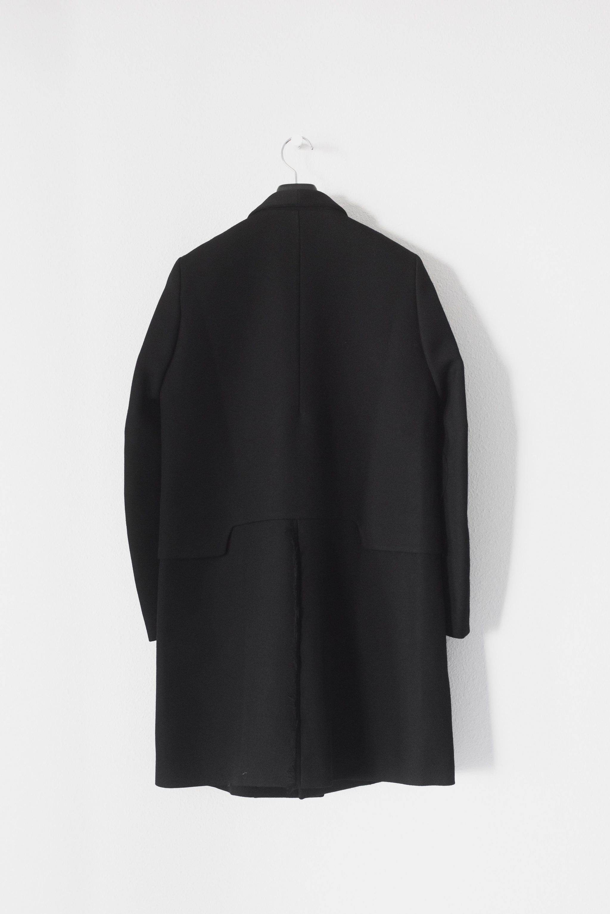 Amazing coat with incredibly sleek details such as hidden double breasted magnetic closures, streamlined front pockets, anatomically panelled sleeves, and rear panelling details with hints of unfinished edges. It is constructed from a tight-knit suiting wool outer and a full cupro liner. This coat was reproduced with scab patches and further distressing in SS16 The Greatest.