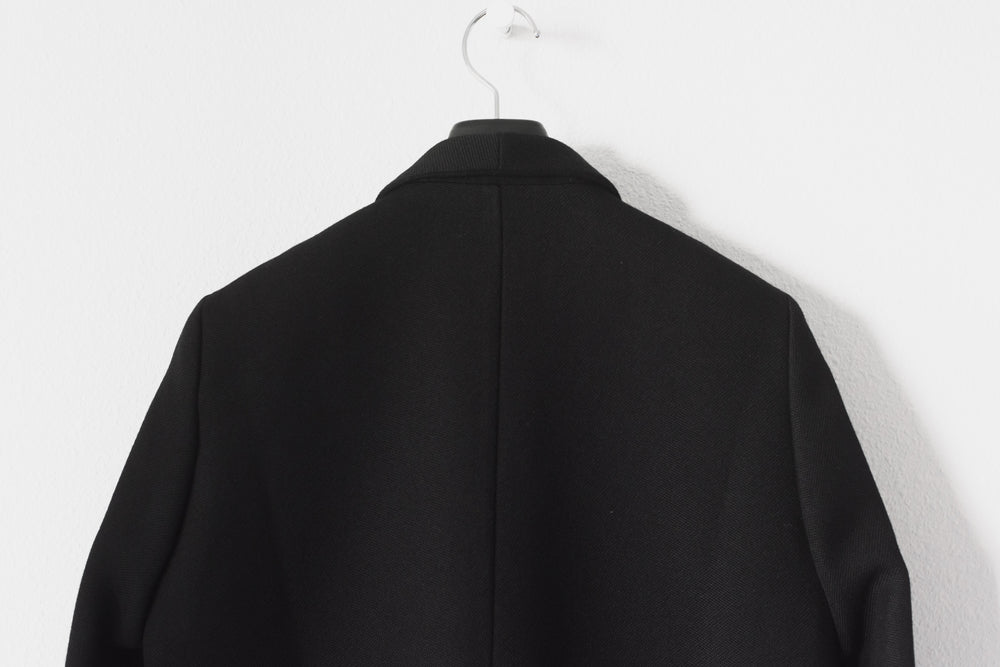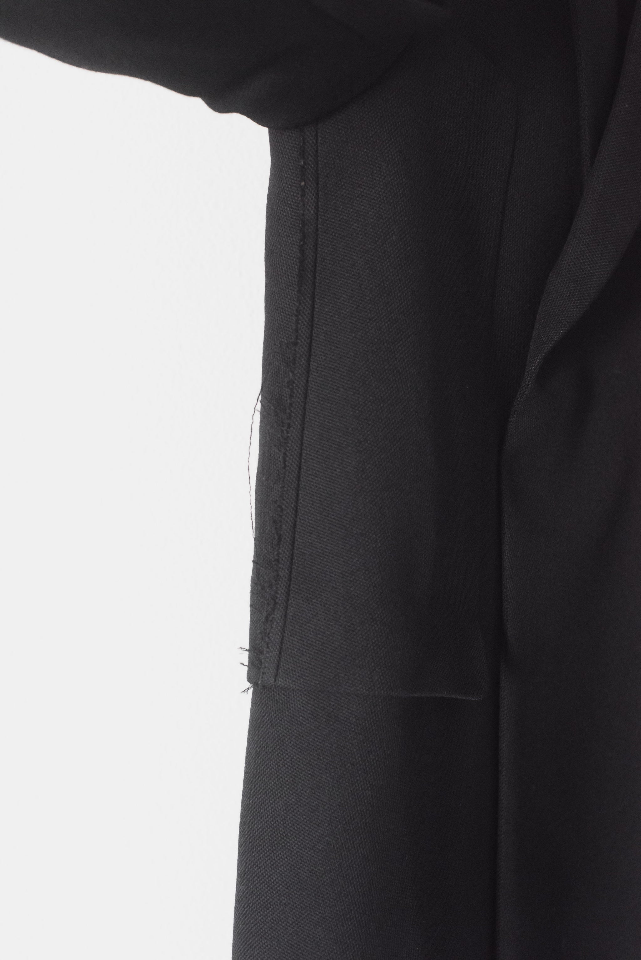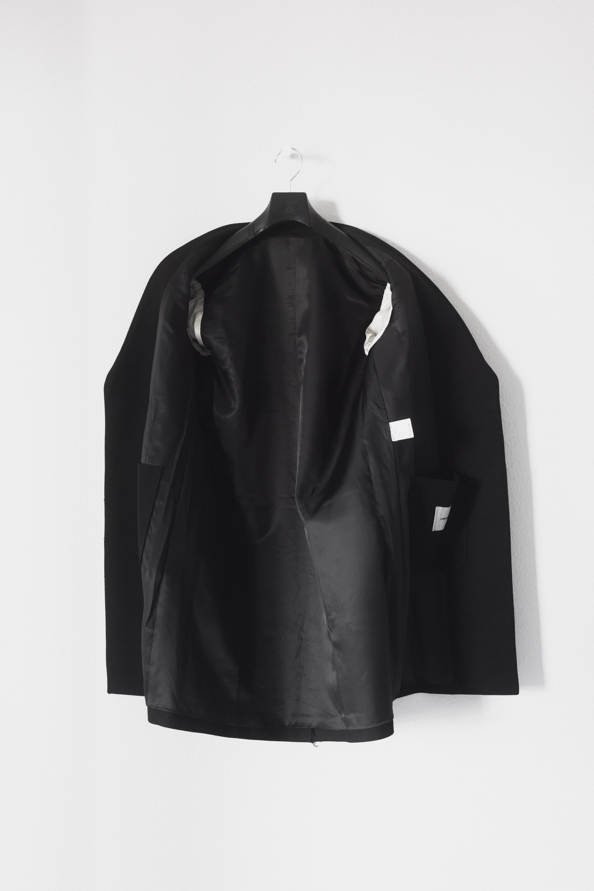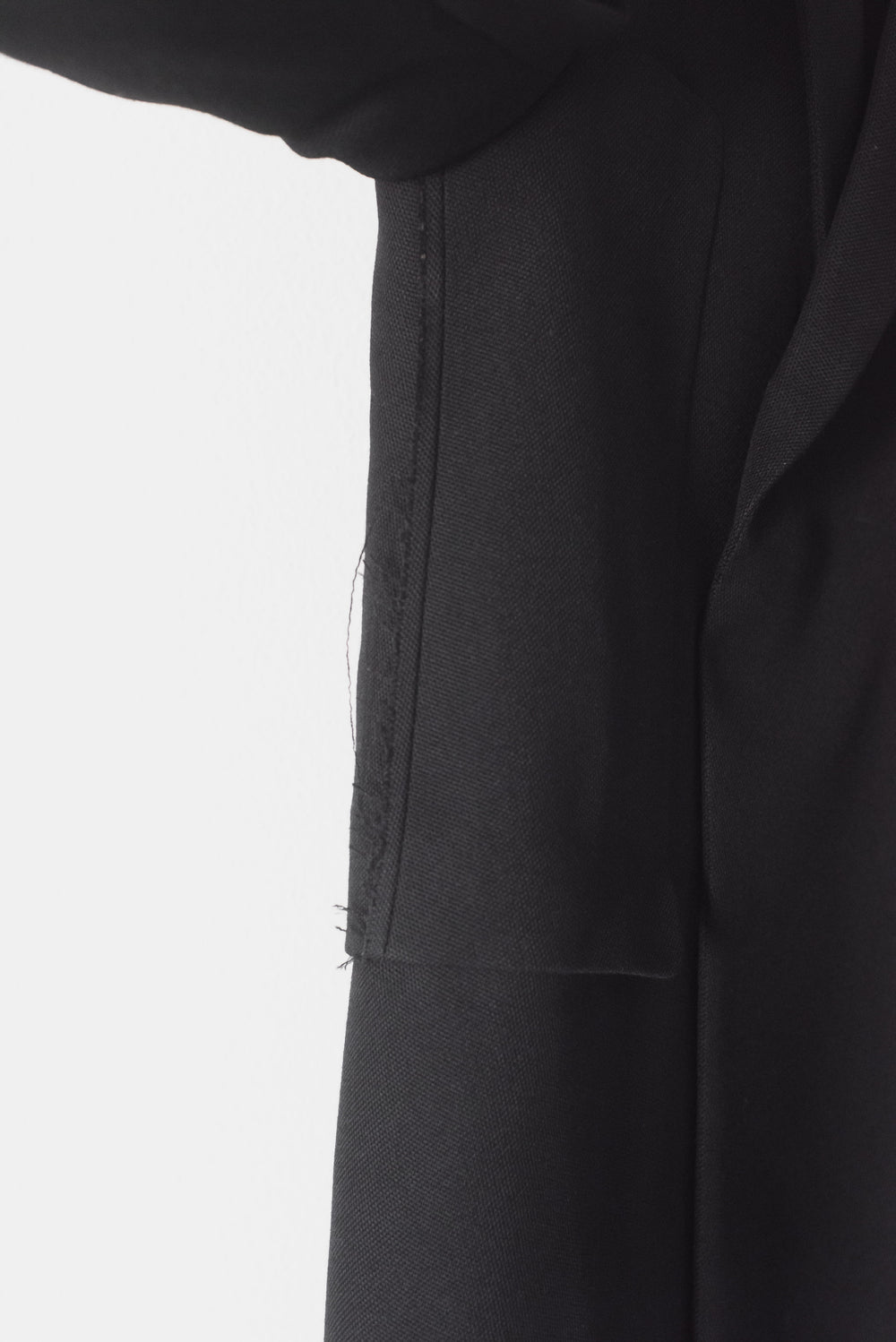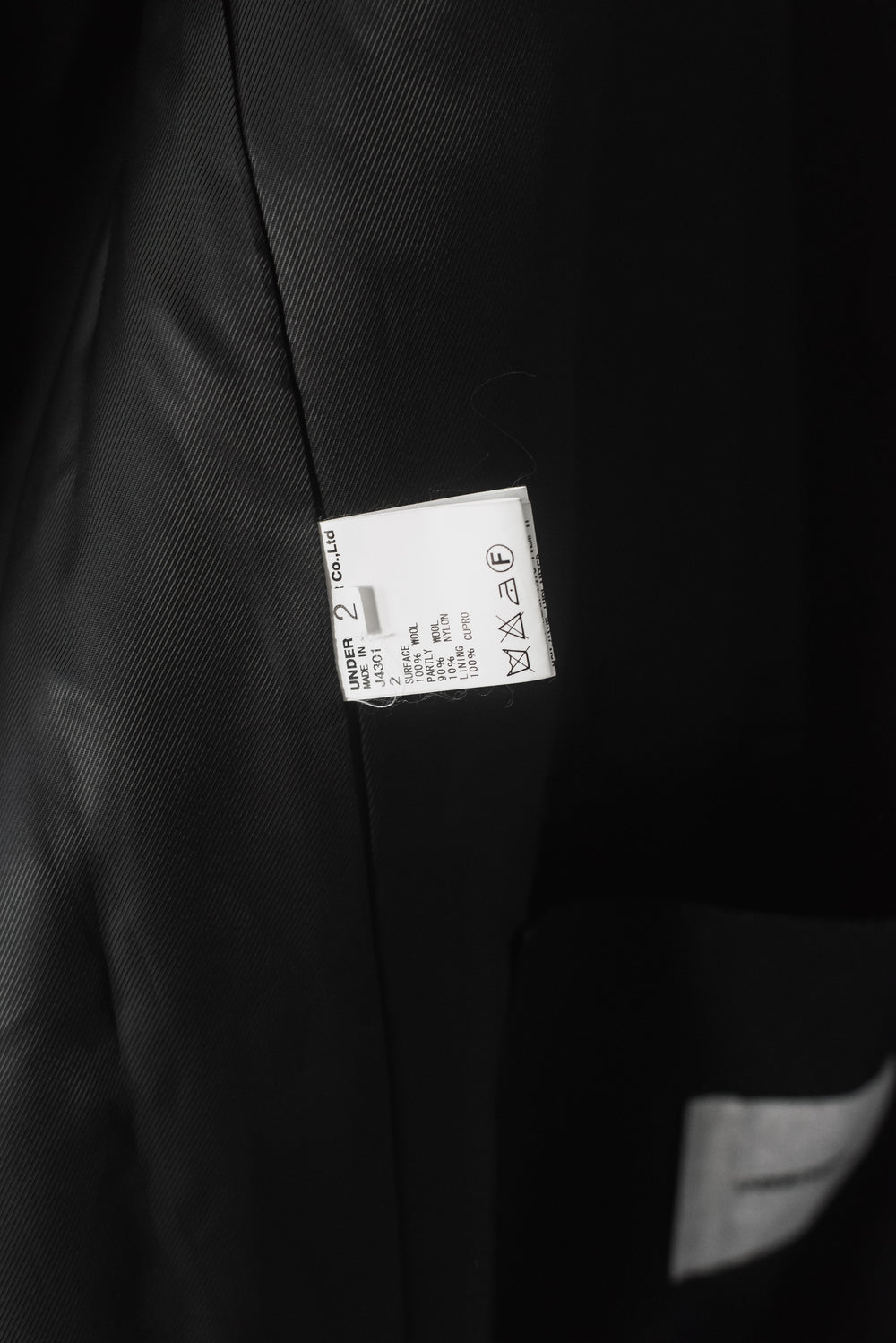 Amazing coat with incredibly sleek details such as hidden double breasted magnetic closures, streamlined front pockets, anatomically panelled sleeves, and rear panelling details with hints of unfinished edges. It is constructed from a tight-knit suiting wool outer and a full cupro liner. This coat was reproduced with scab patches and further distressing in SS16 The Greatest.