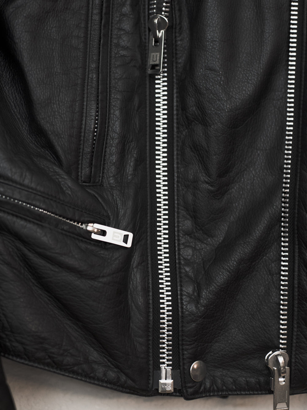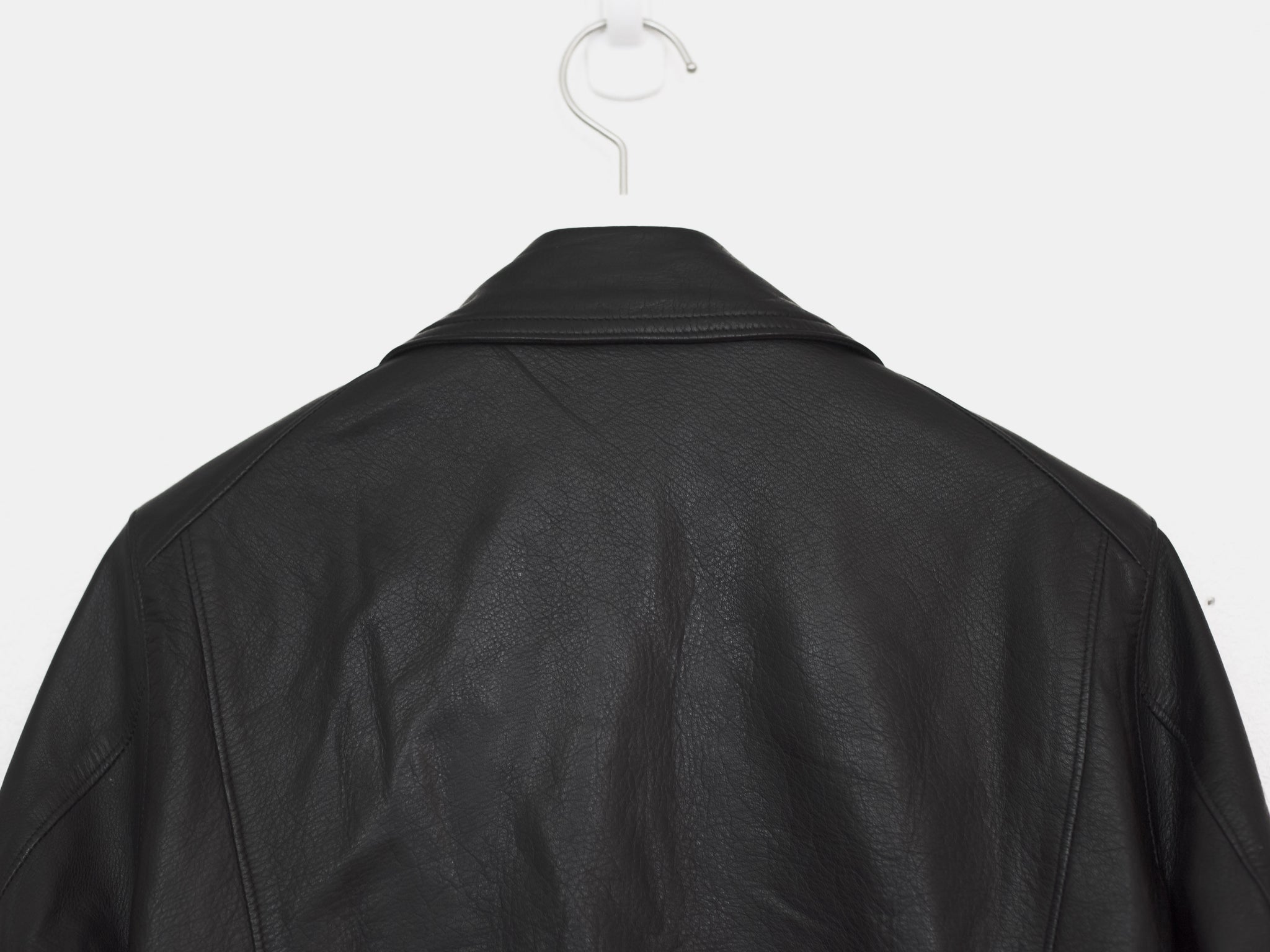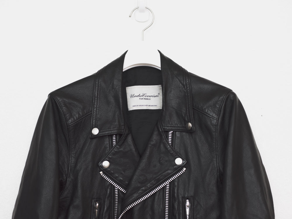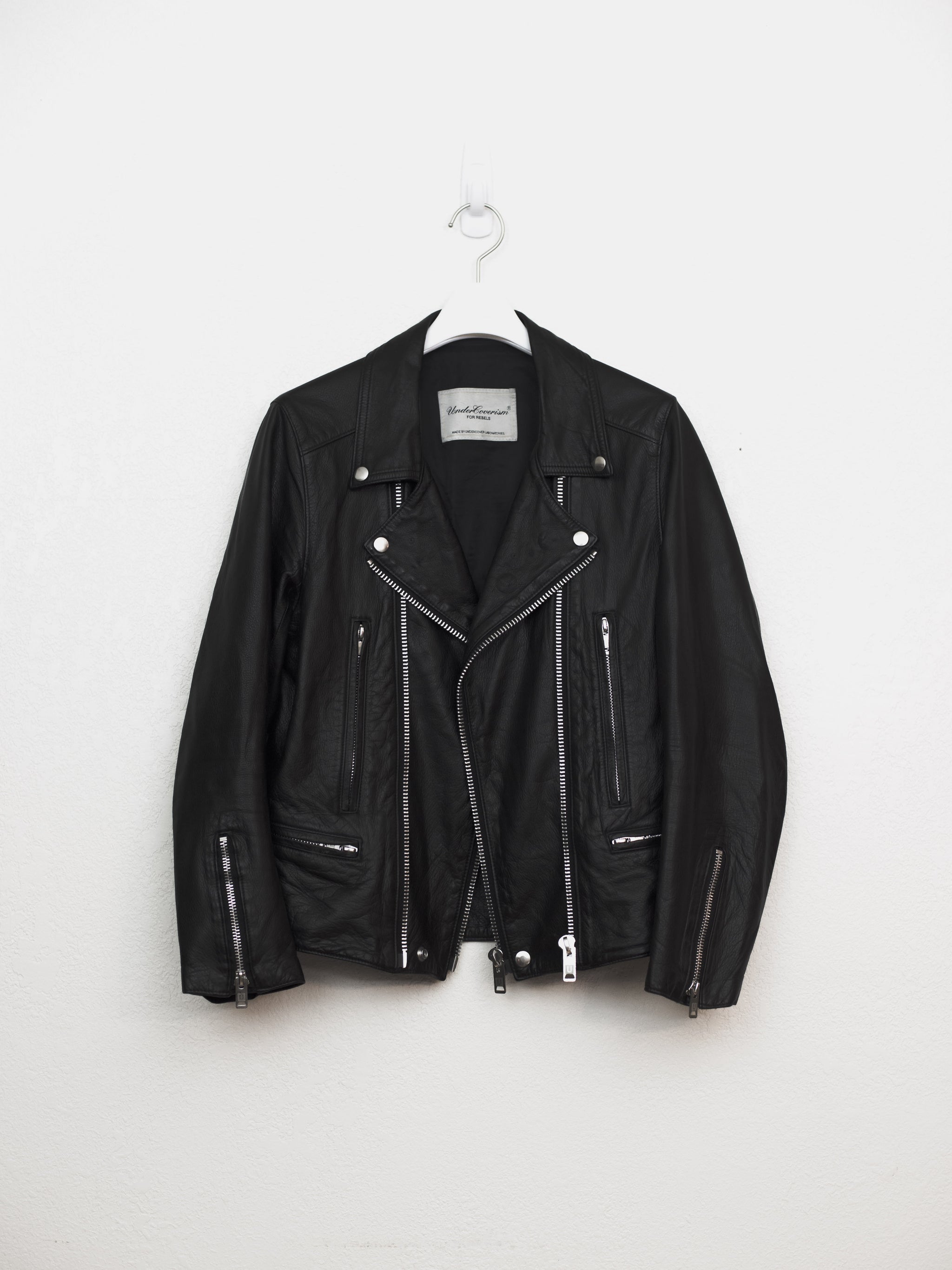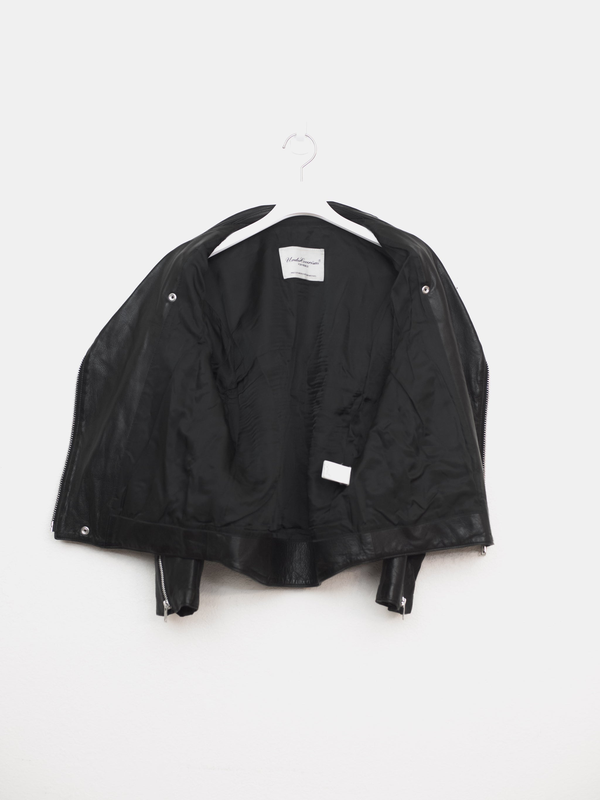 Incredible rider and a personal favorite of Radiohead's Thom Yorke. Composed of very supple calfhide, softer than the WMNNC. Details include two sided zips for either lapel configuration, four cotton fleece lined front pockets, Undercover embossed zippers throughout, and full cupro lining. Made in Japan.