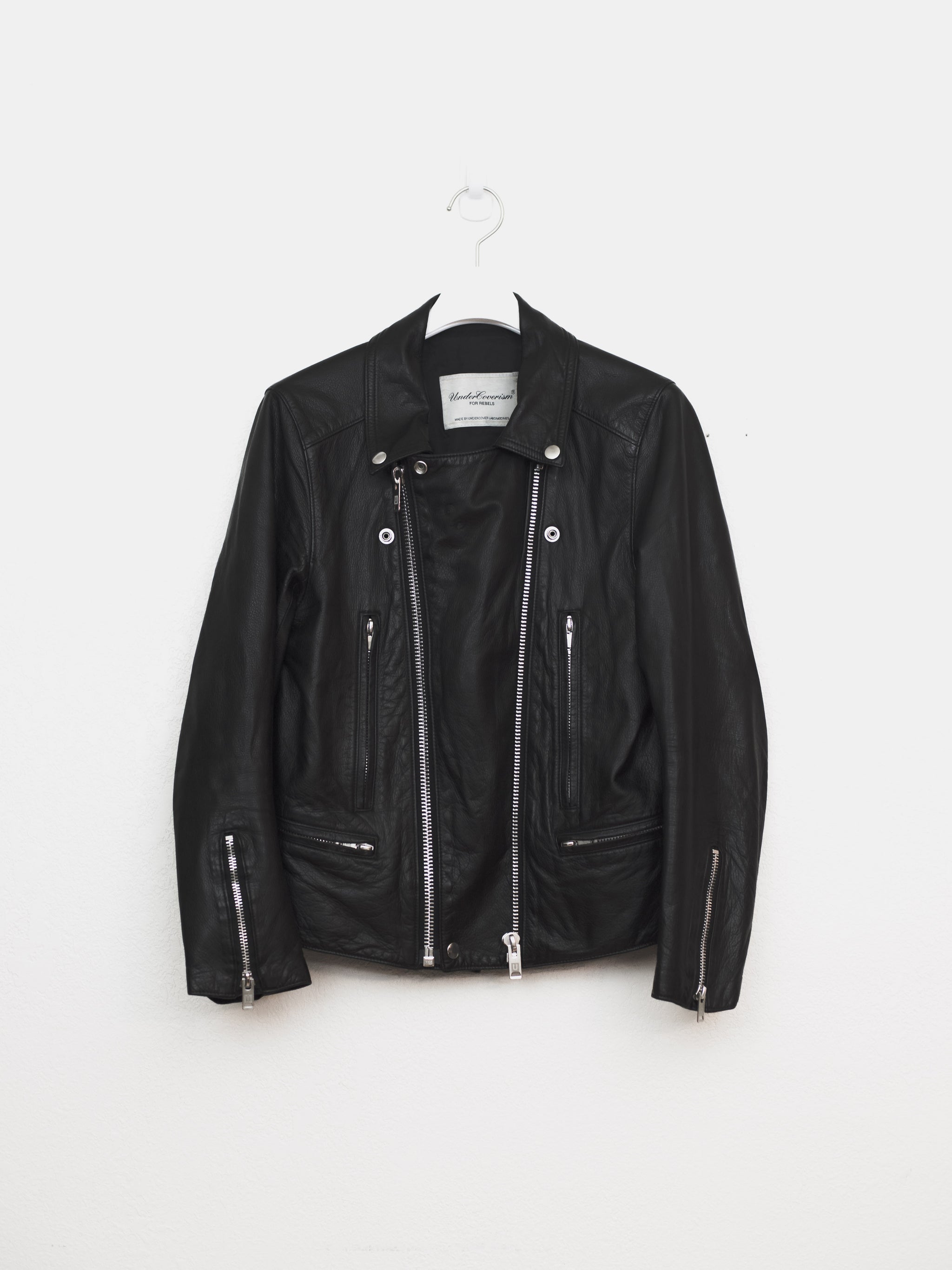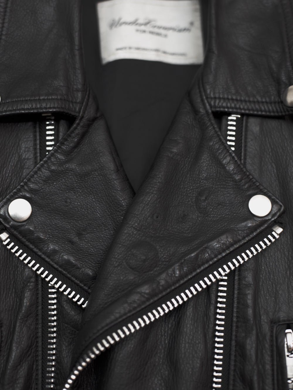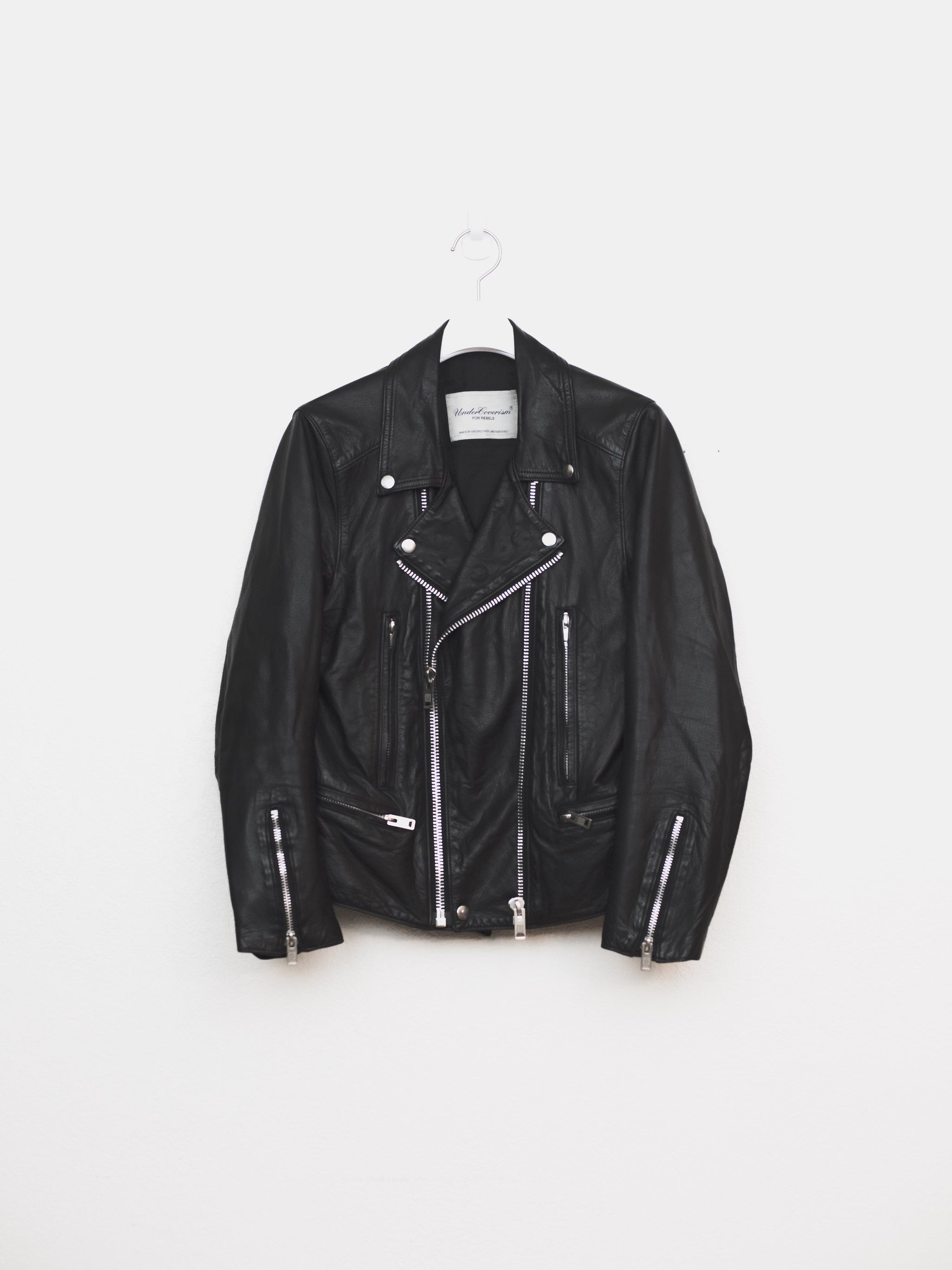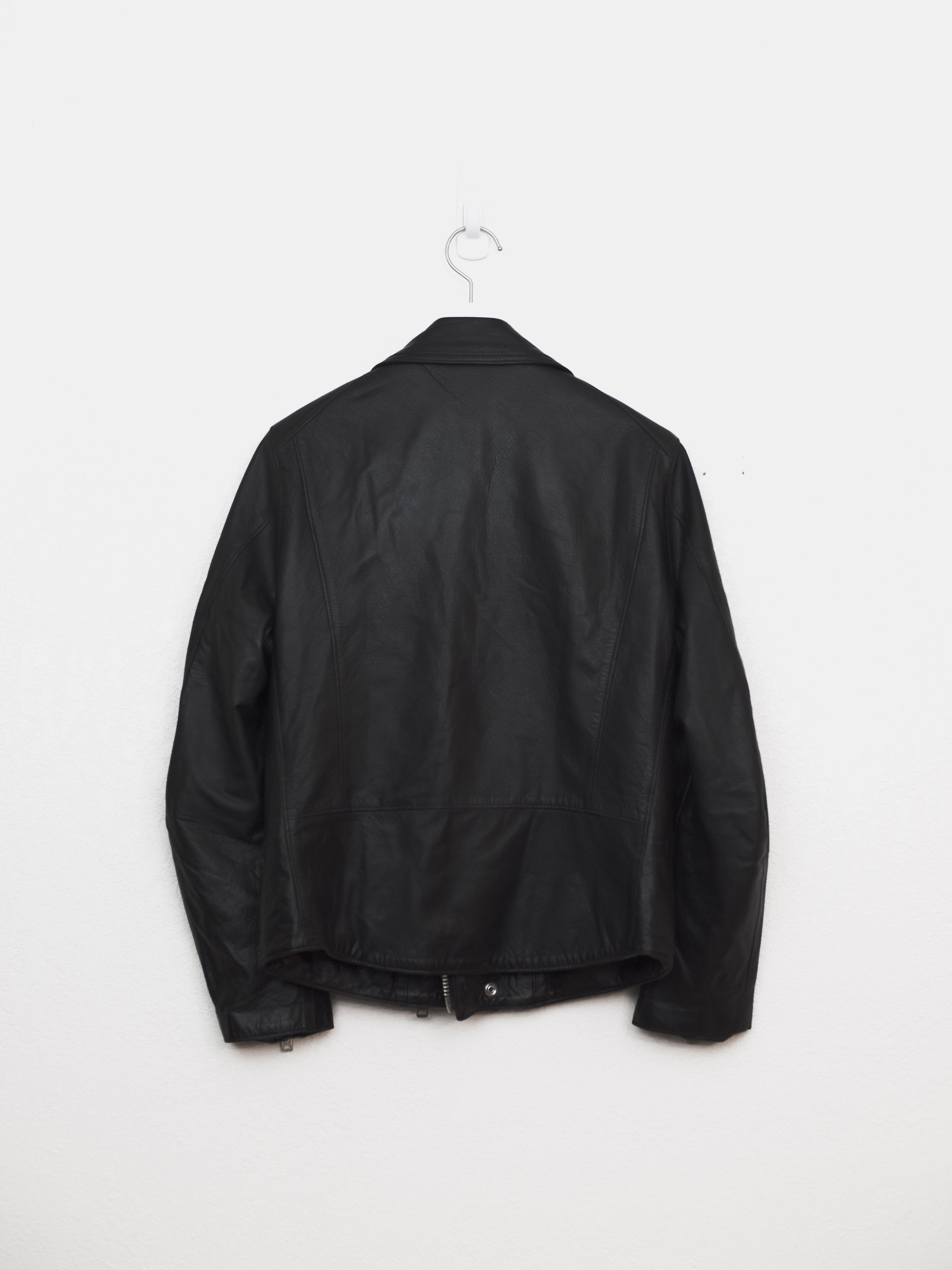 Incredible rider and a personal favorite of Radiohead's Thom Yorke. Composed of very supple calfhide, softer than the WMNNC. Details include two sided zips for either lapel configuration, four cotton fleece lined front pockets, Undercover embossed zippers throughout, and full cupro lining. Made in Japan.