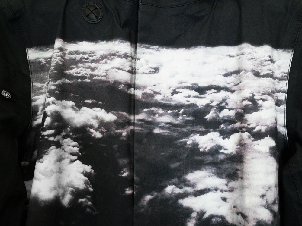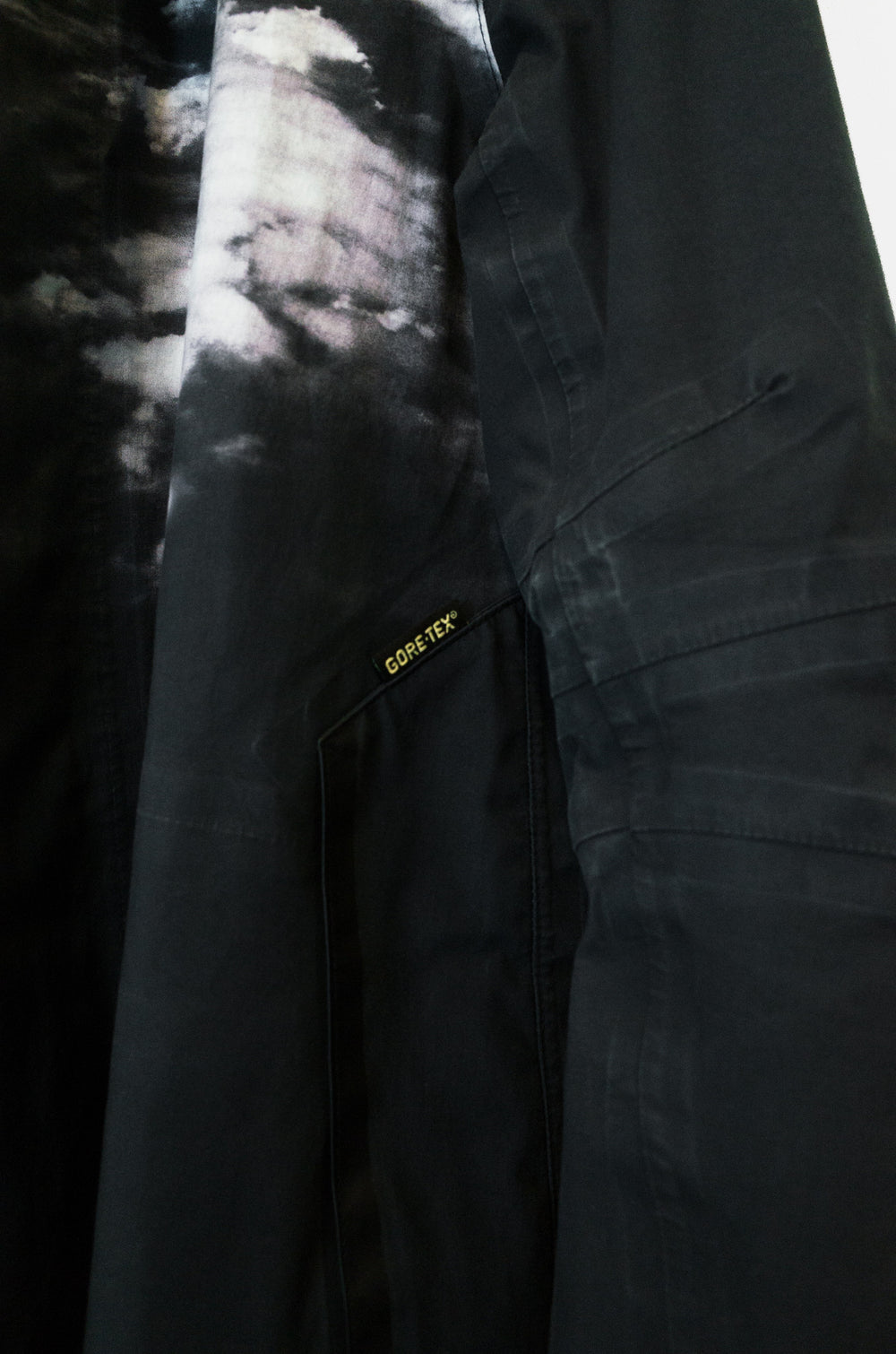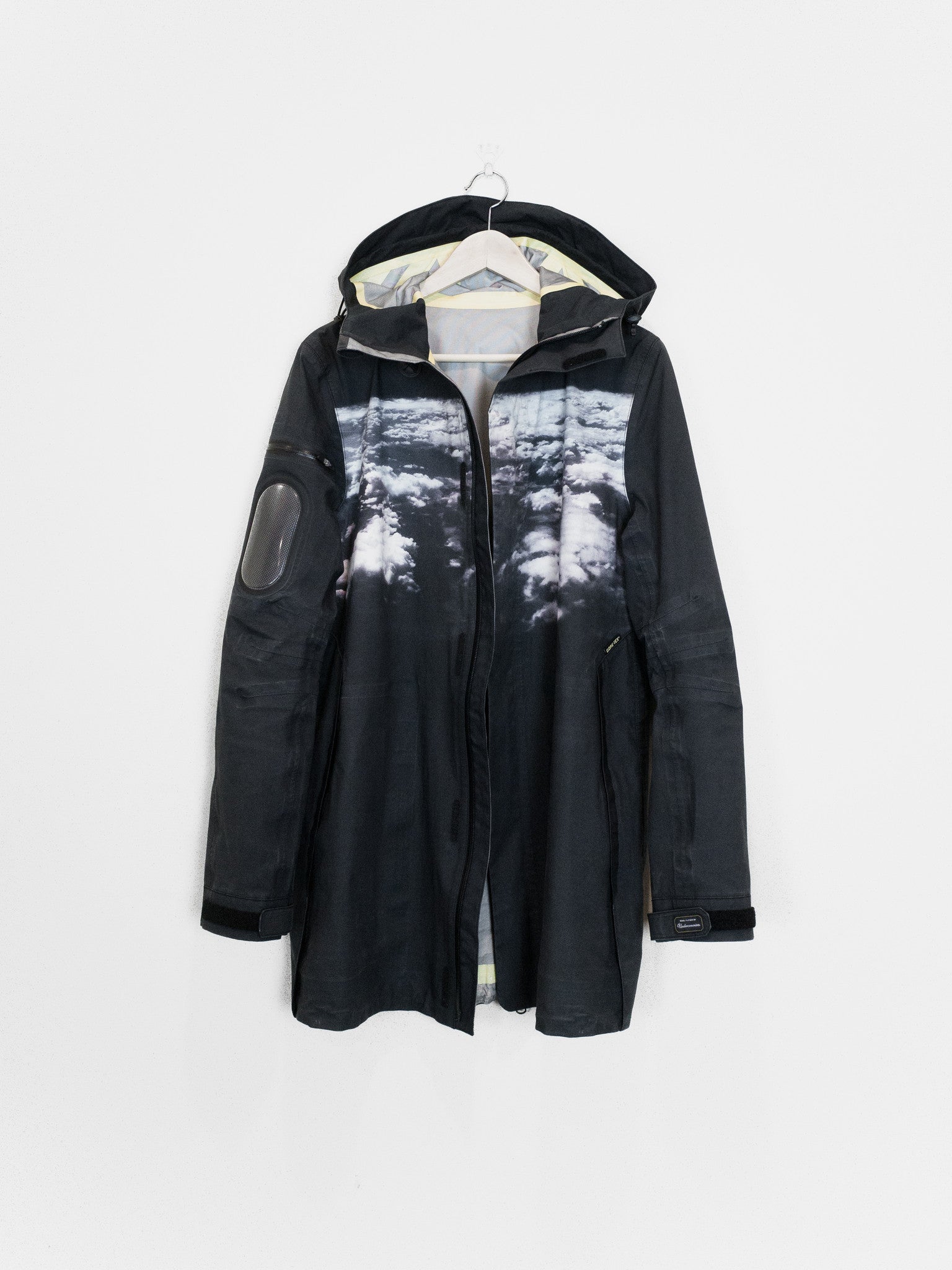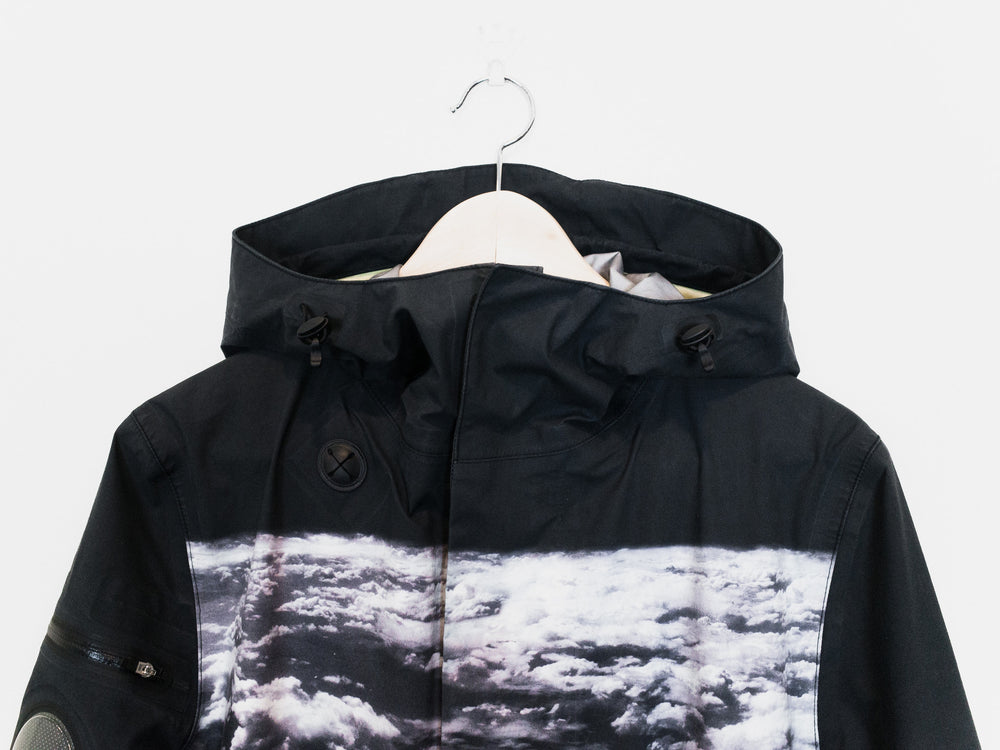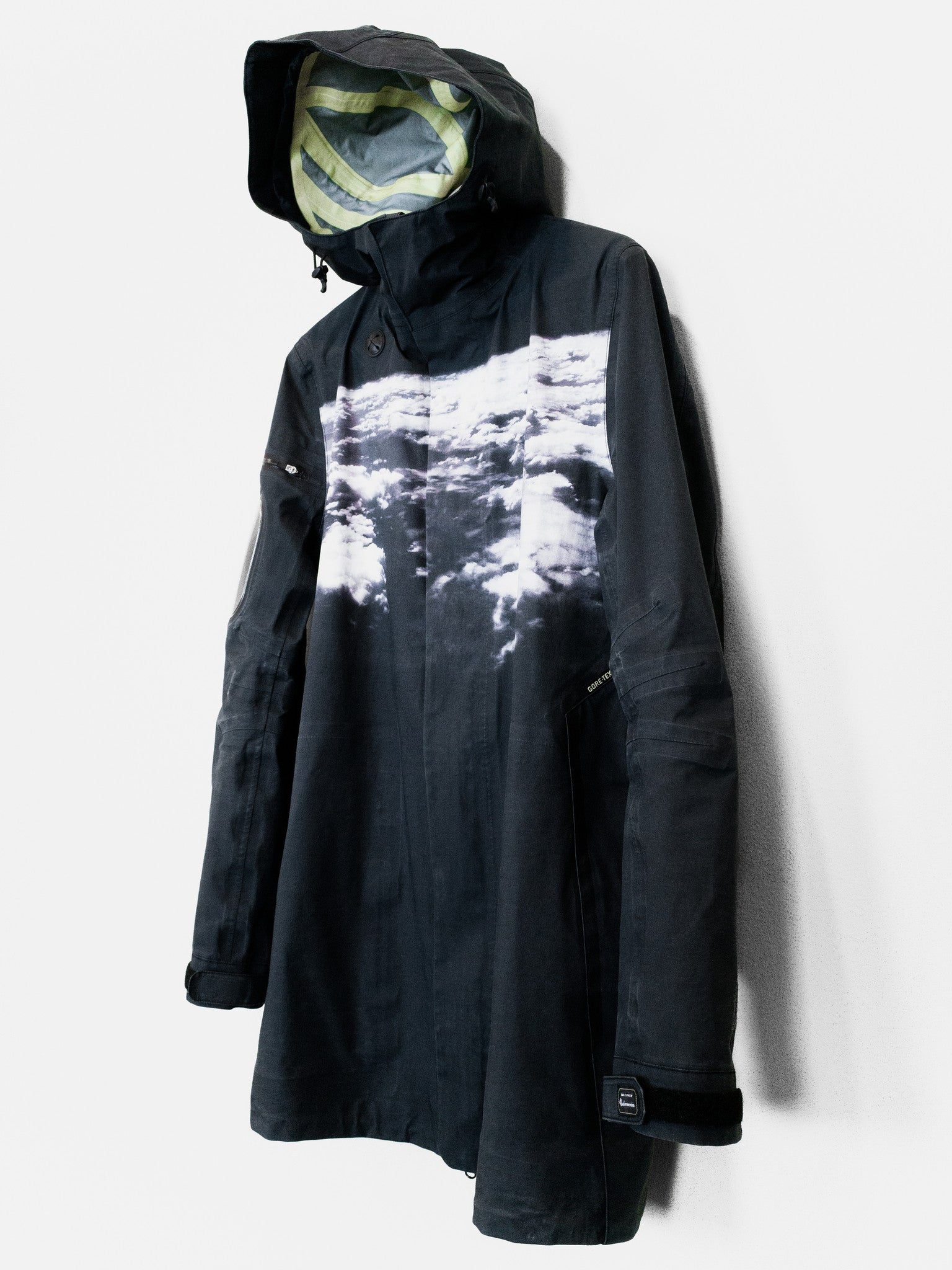 Takahashi’s Spring/Summer 2009 “Neoboy” collection highlights one of his first forays into the world of technical fashion. This iconic “Clouds” rain parka includes a black cotton outer shell, Gore-Tex membrane, and microgrid backer. Technical features include elastic/velcro cuff closures, seam tape, transparent phone window, and stormproof reverse-coil front zip and pockets.