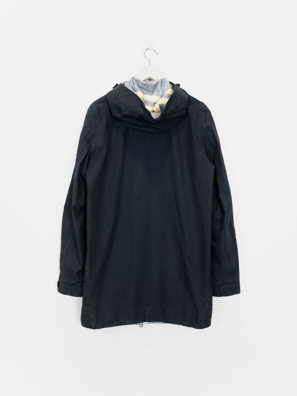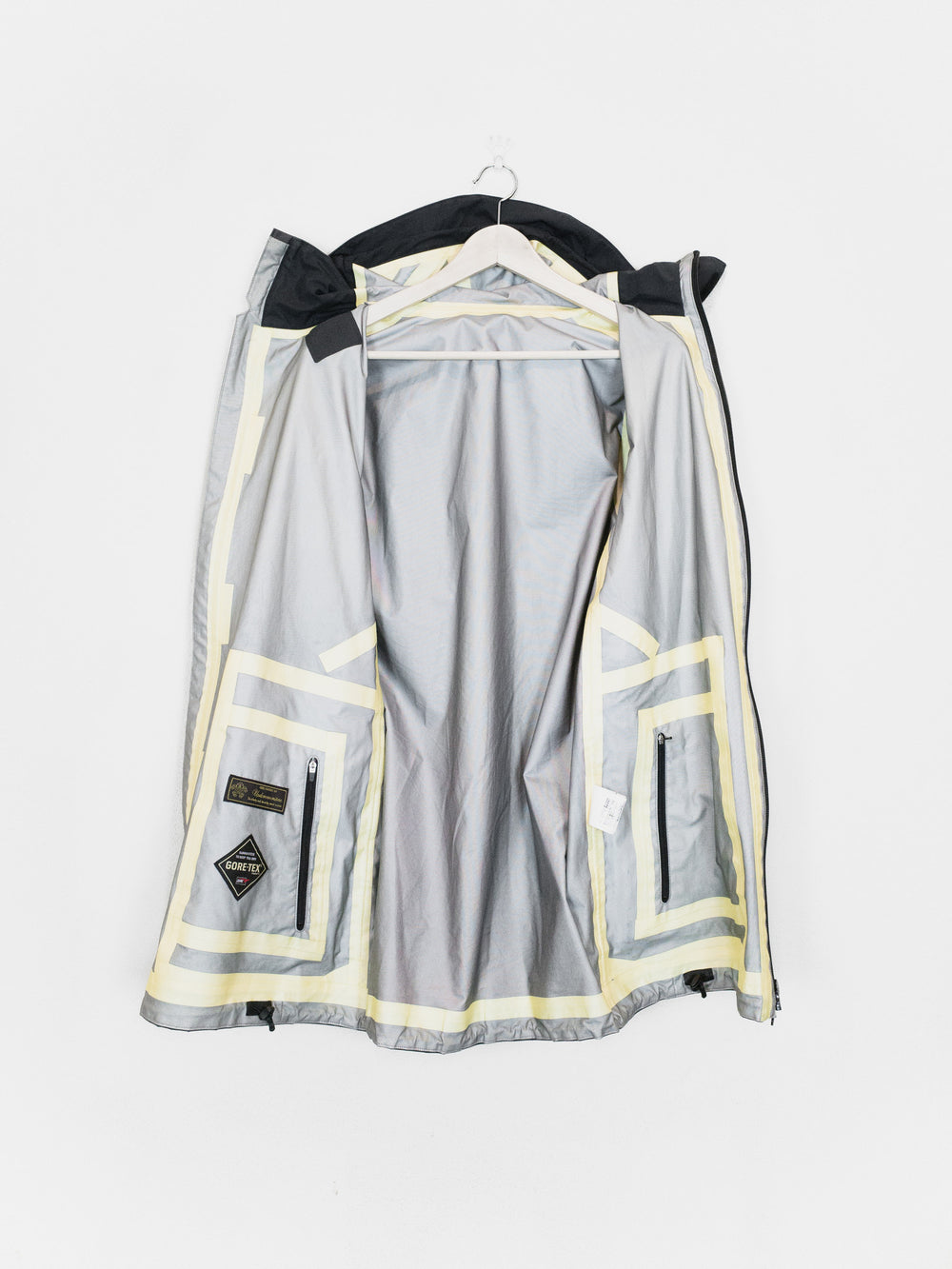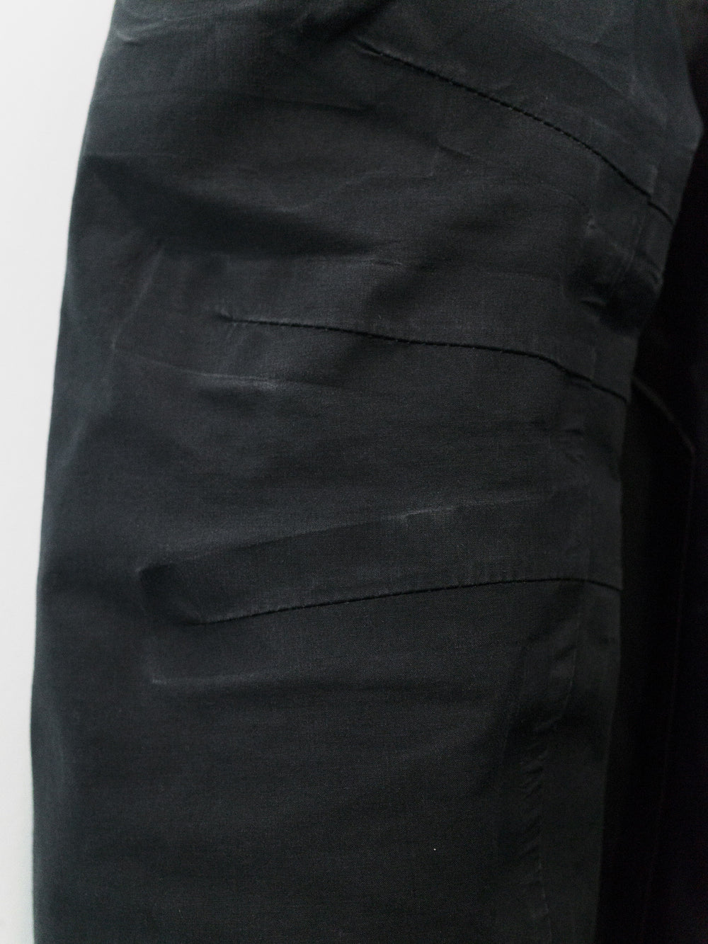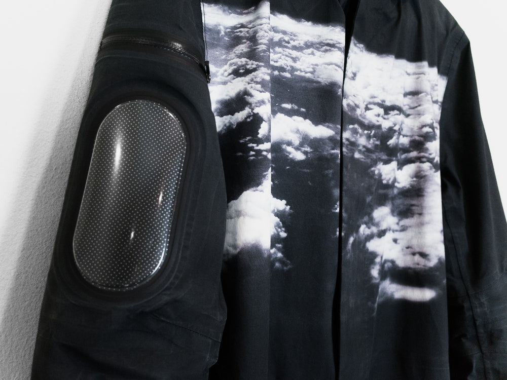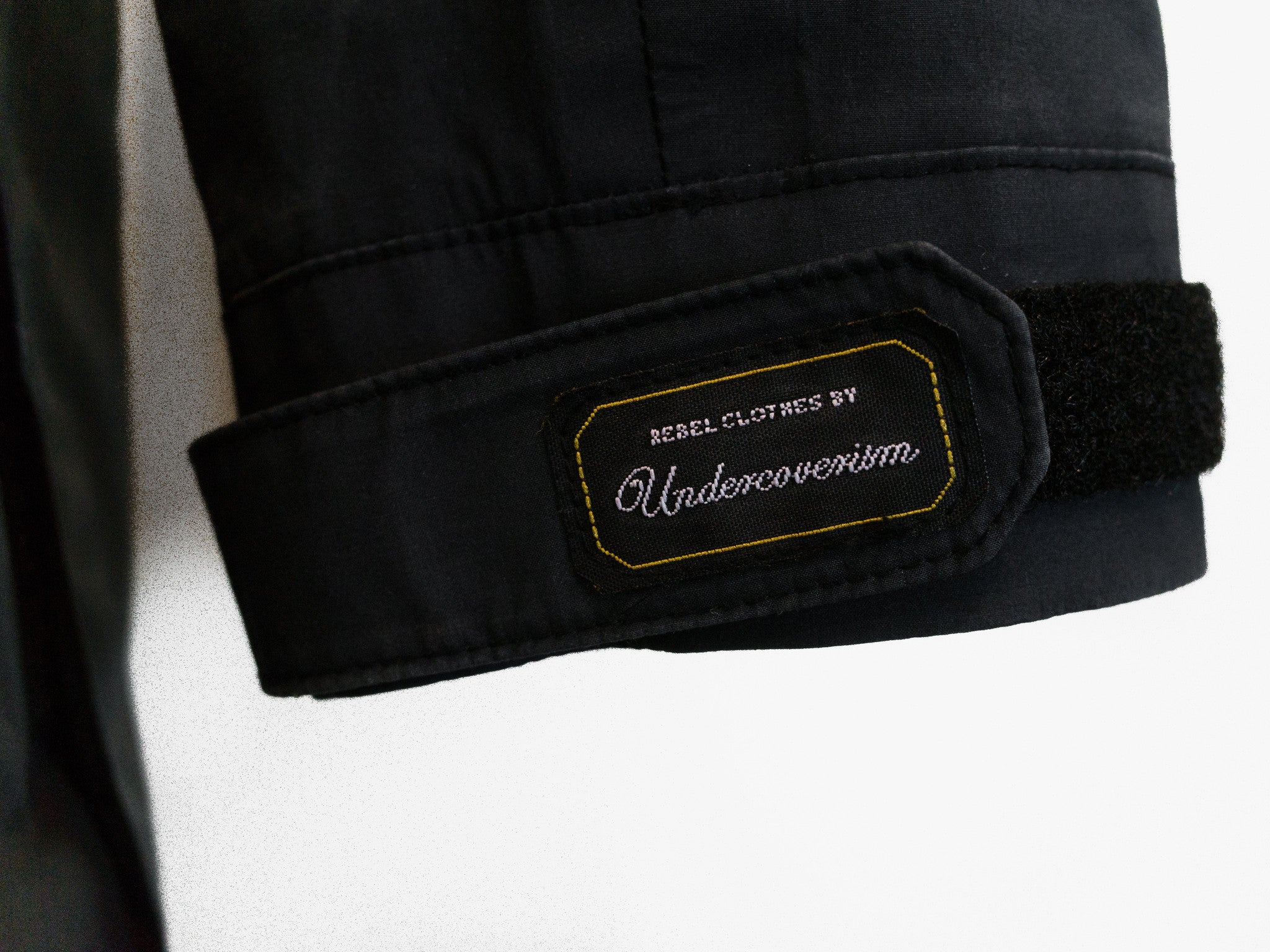 Takahashi’s Spring/Summer 2009 “Neoboy” collection highlights one of his first forays into the world of technical fashion. This iconic “Clouds” rain parka includes a black cotton outer shell, Gore-Tex membrane, and microgrid backer. Technical features include elastic/velcro cuff closures, seam tape, transparent phone window, and stormproof reverse-coil front zip and pockets.