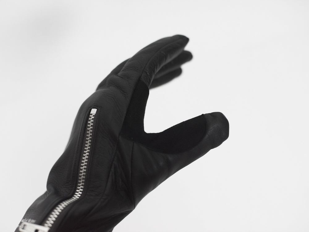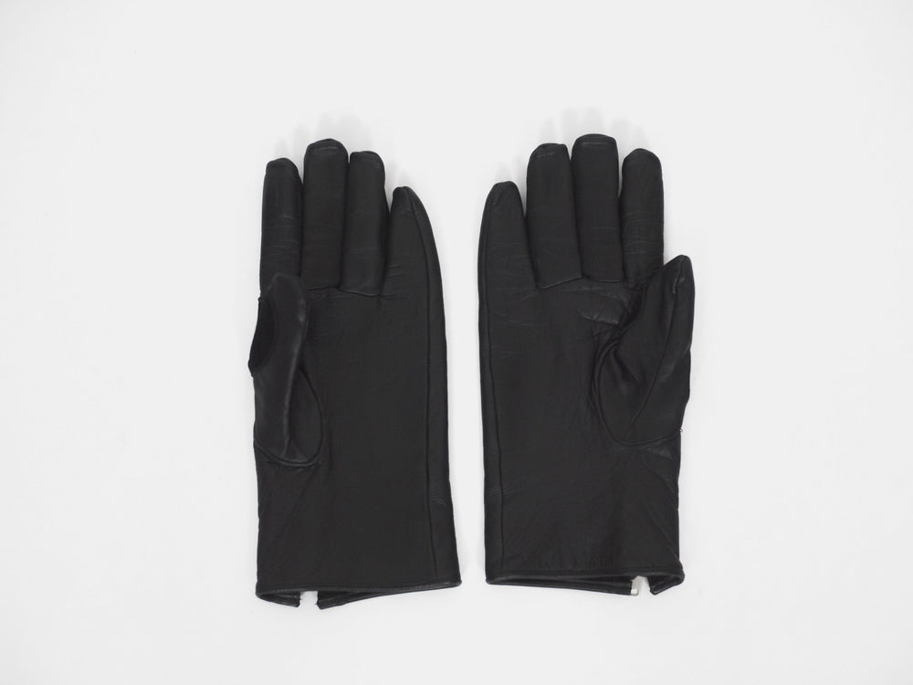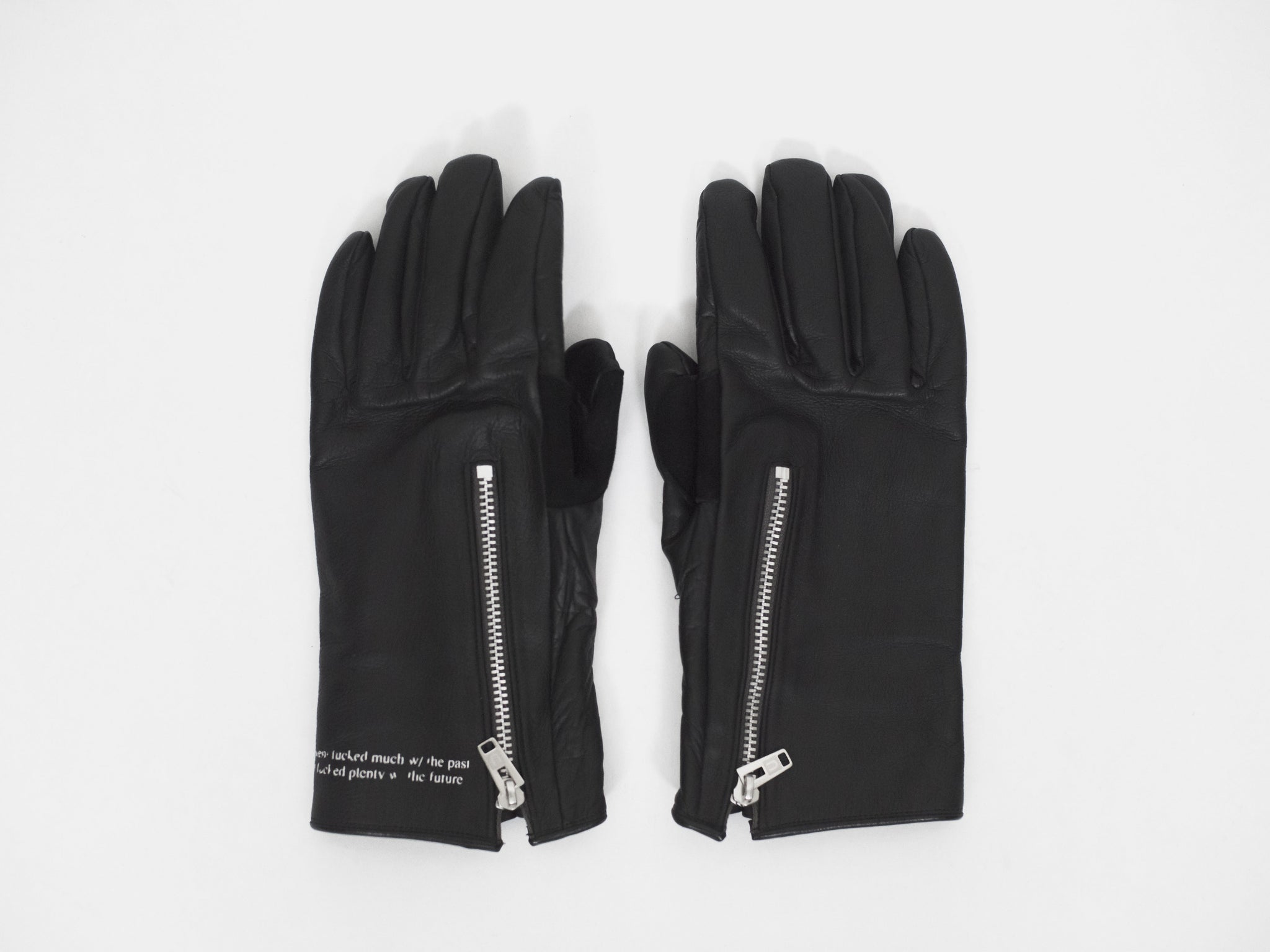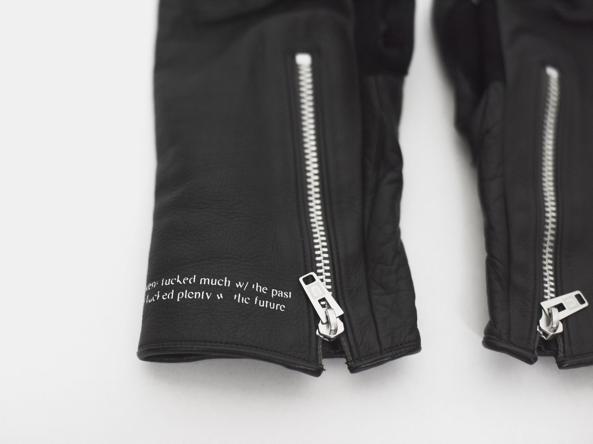 Rare calfskin gloves featuring a widely used quote from Patti Smith's Babelogue. Additional details include suede grips and Undercover embossed zippers.