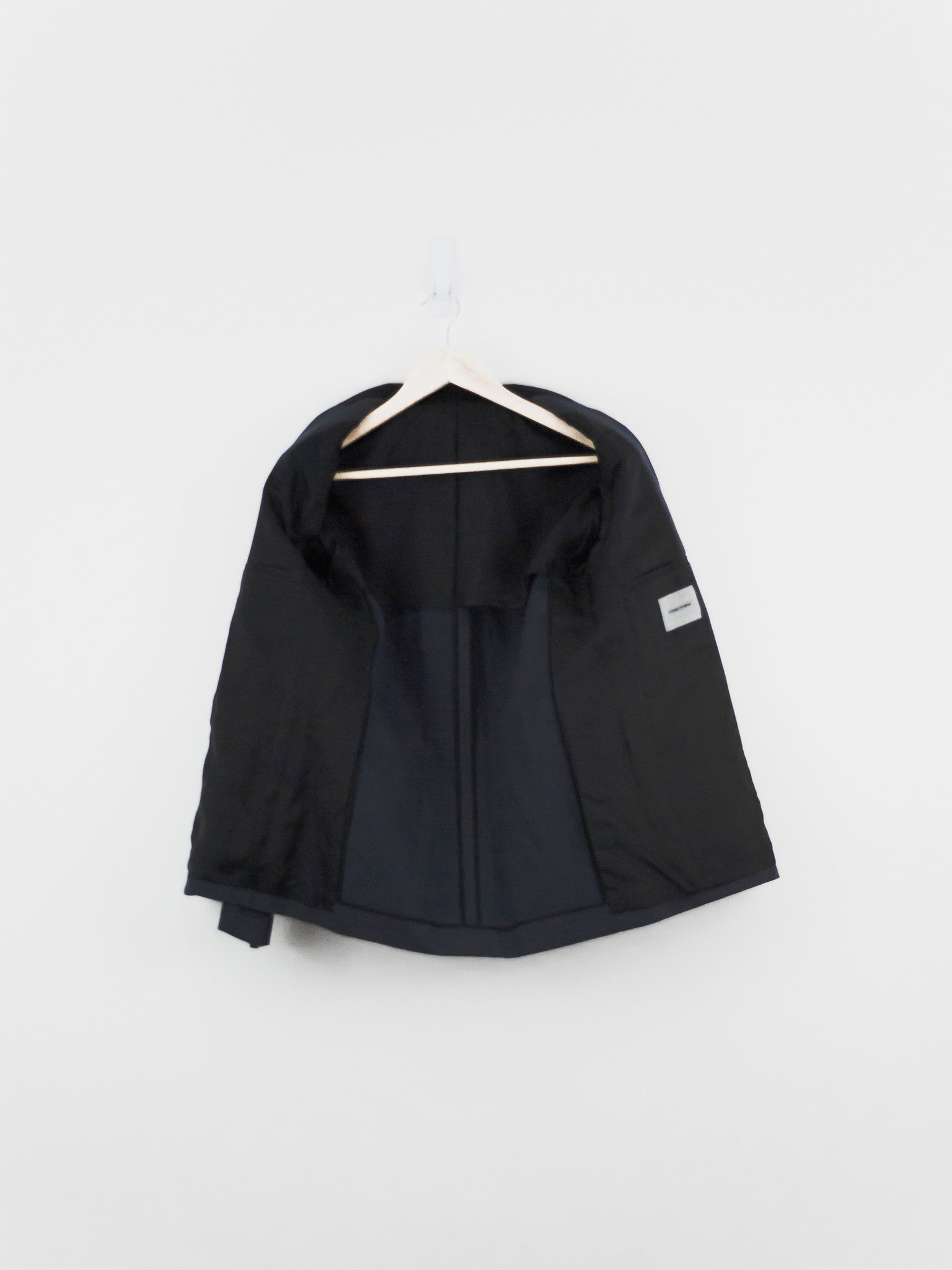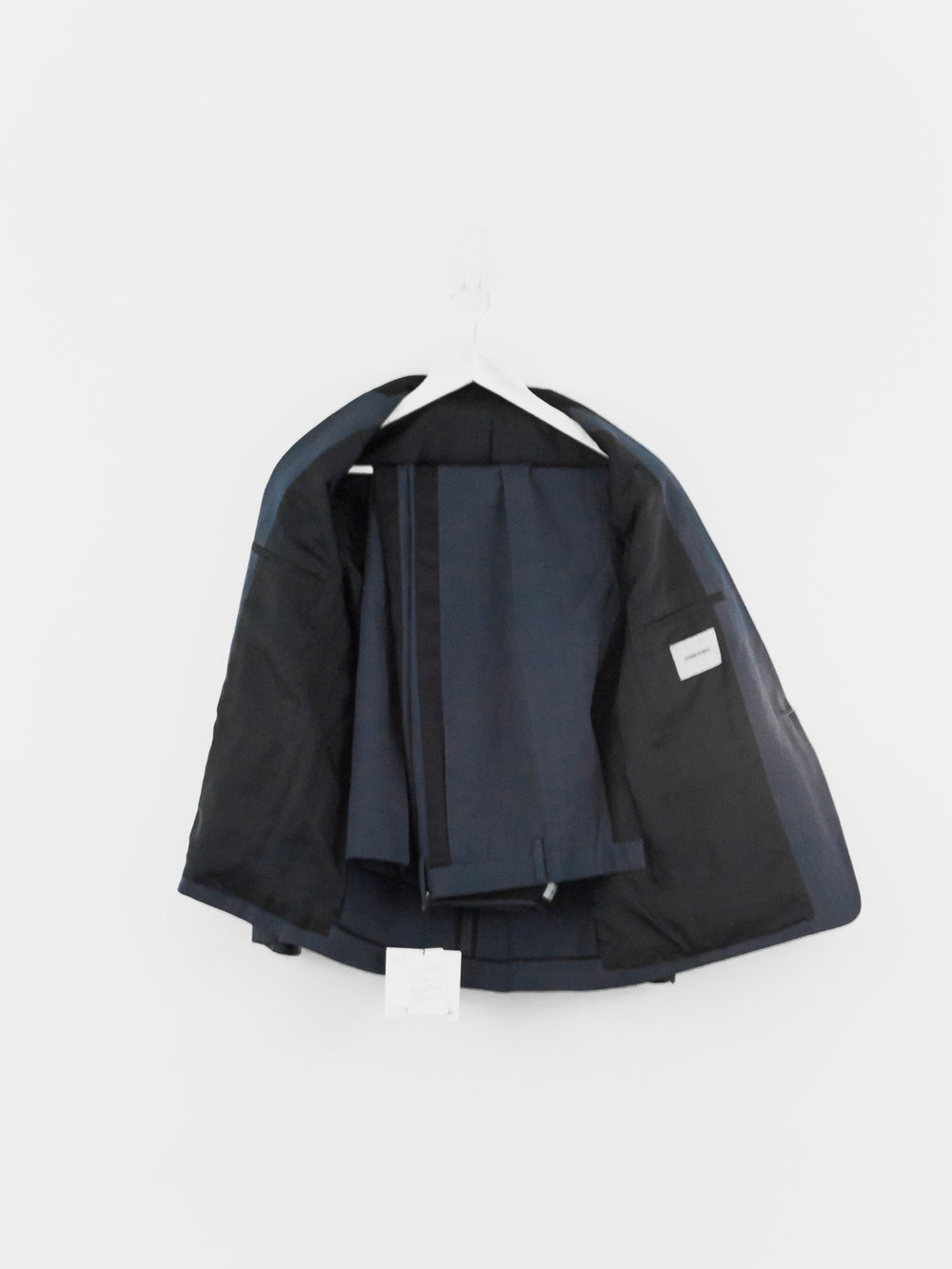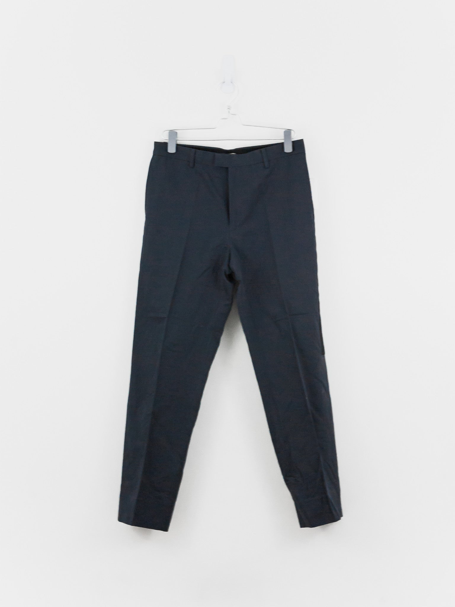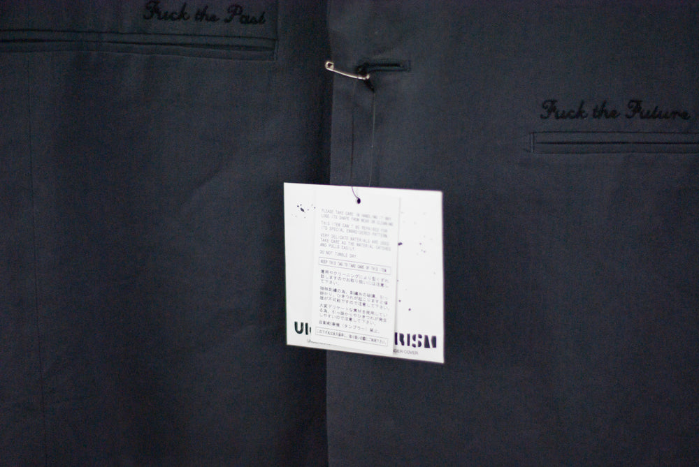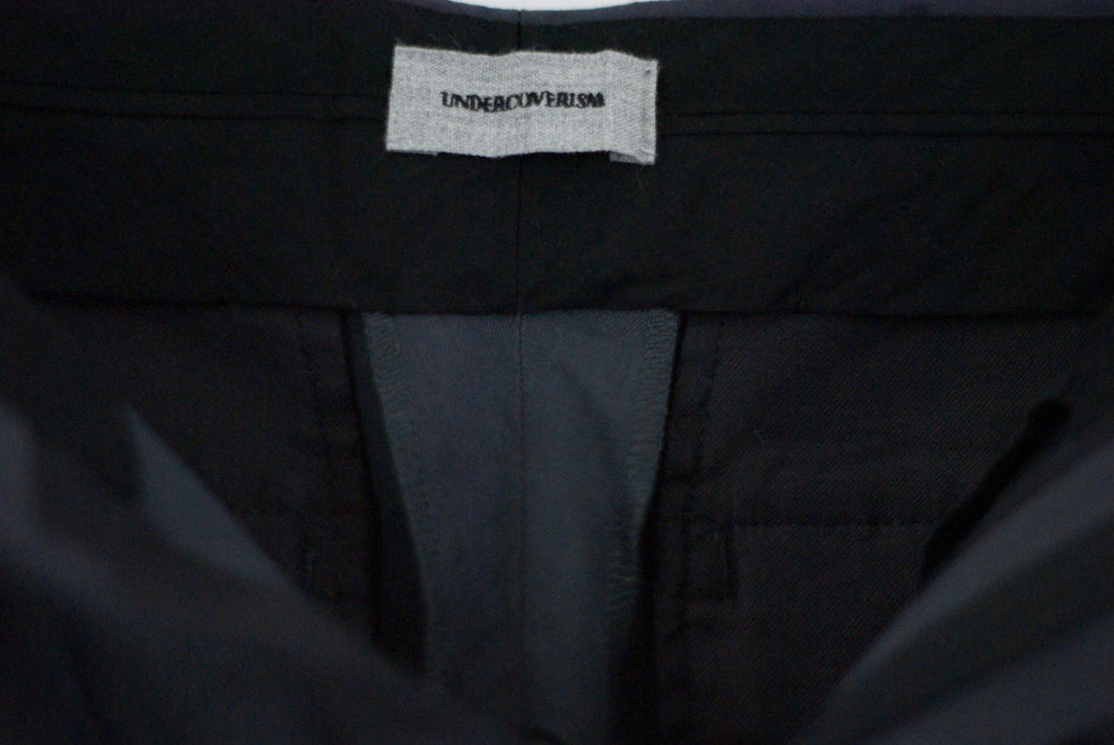 Cotton 1-Button Blazer & Trousers by Jun Takahashi's Undercover brand new with tags. Low set single button stance and signature cursive embroidery above the discreet slash waist pockets, this is guaranteed to garner attention at any event. A refreshing take on punk ideas, SS12 saw Jun re-appropriating punk slogans into more formal attire like Oxford Shoes, suits and button-ups - mostly with thick embroidery and cursive font. I find this is quite a hilarious juxtaposition, posing elegant silhouettes and traditionally upper-class clothing/techniques with to-the-point vulgarity. This is stuff you could wear to a wedding, and have the bride's mother despise you for the rest of the evening.
