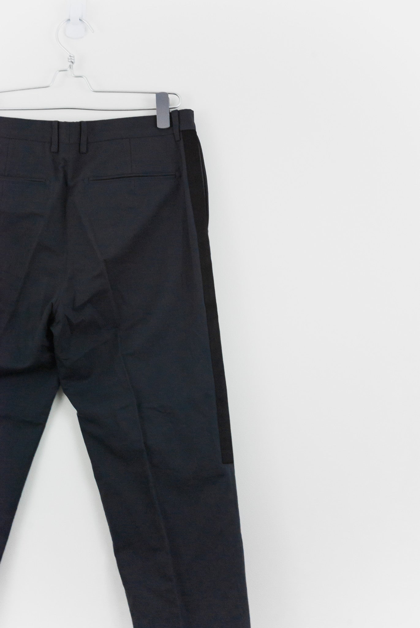 Further reasons to buy this suit are the brilliant details and lining, the blazer is an extremely peculiar paper/cotton blend with silk notched upper lapels and cupro lining. The underside of the care label warns to be careful because of the delicate materials used. The trousers follow with silk stripes reaching the knee and the same paper/cotton blend.
