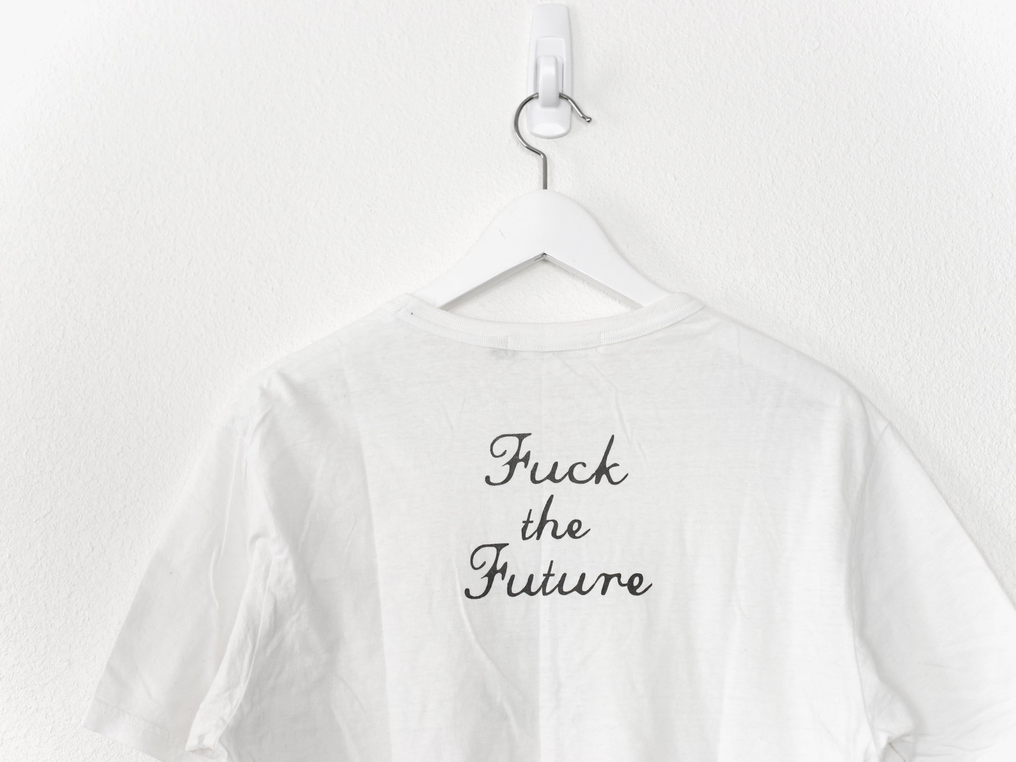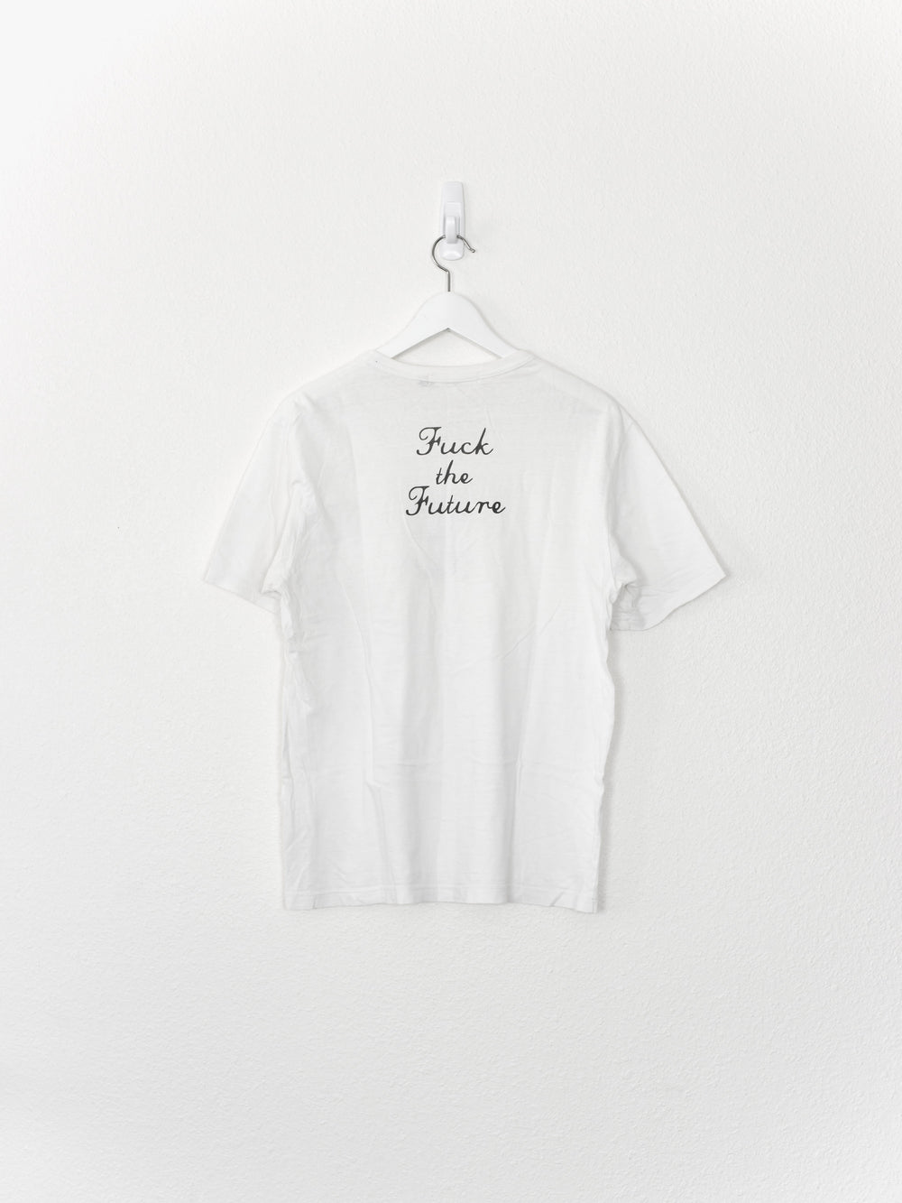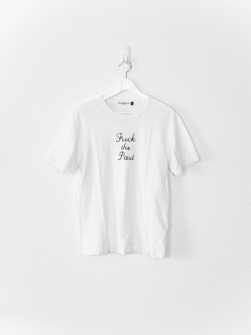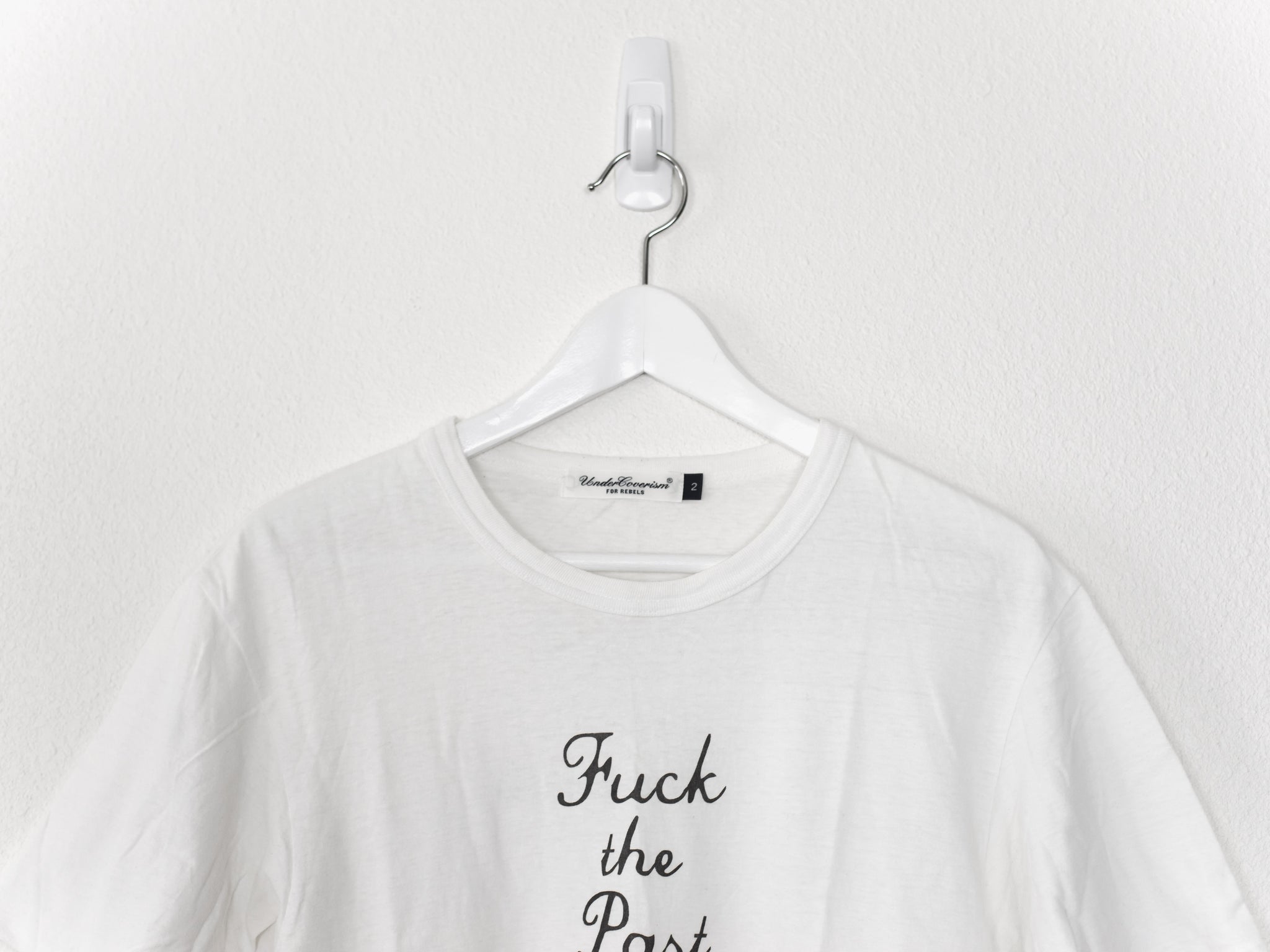 Rare tee with one of Undercover's famous motifs, "Fuck the Past" on the front and "Fuck the Future" on the back.