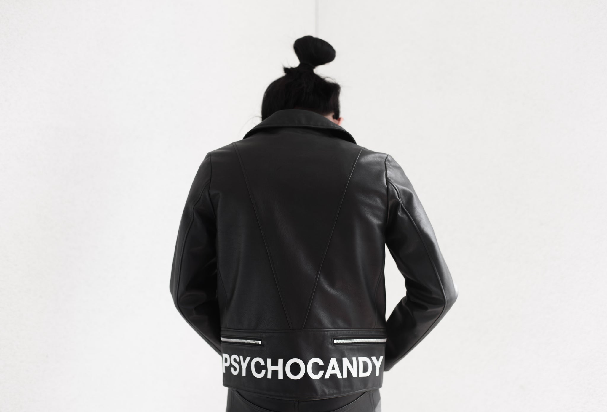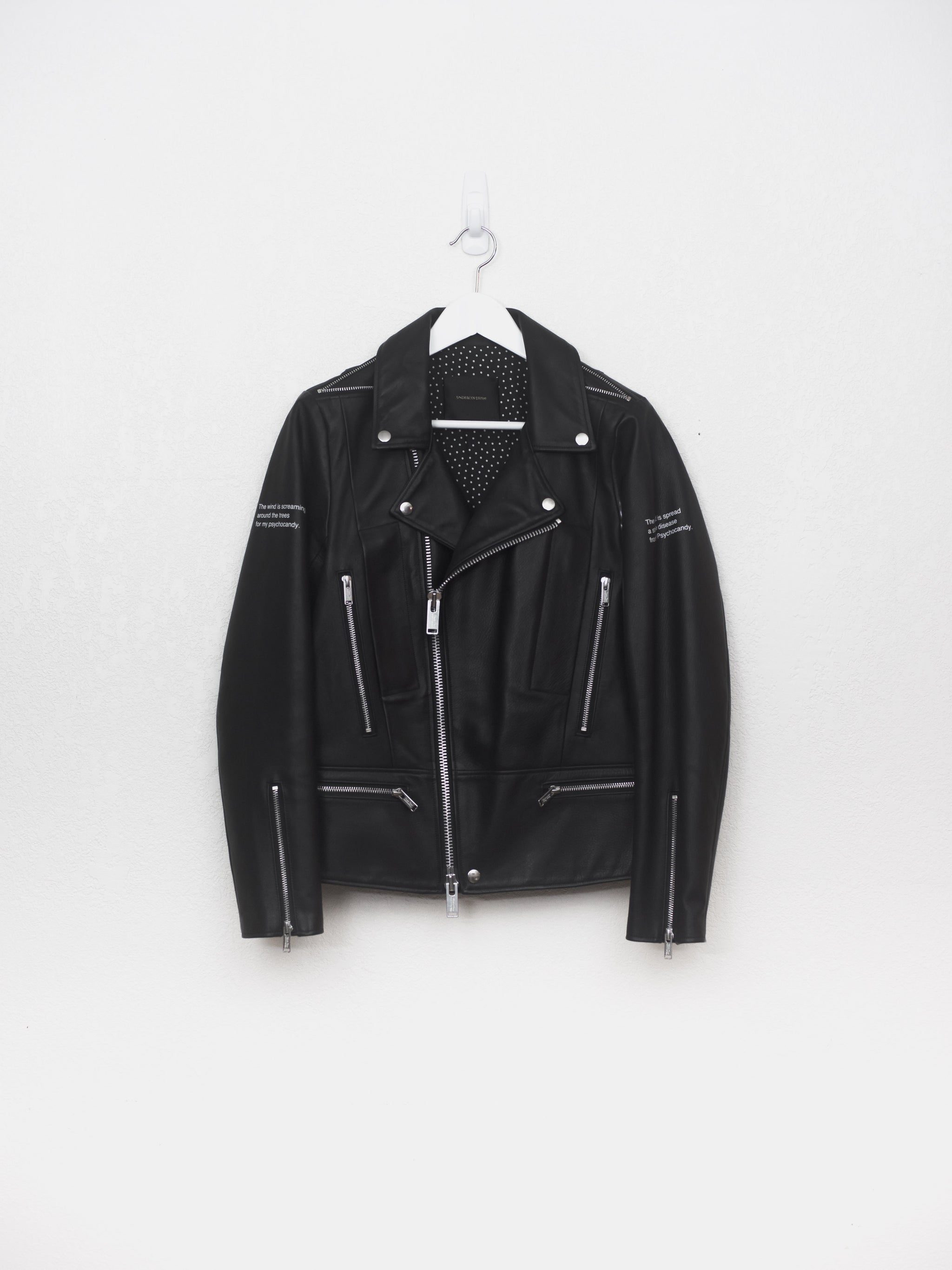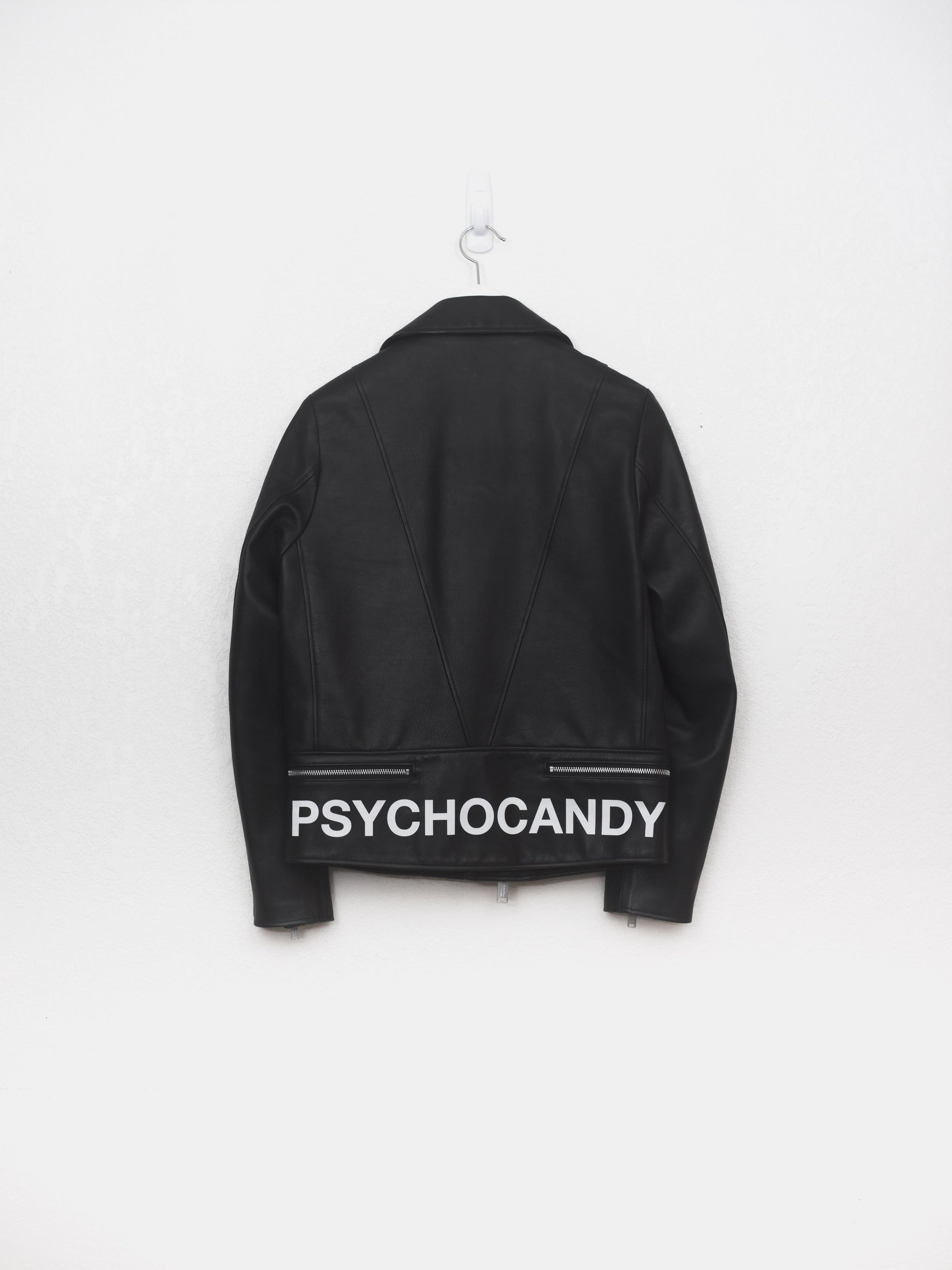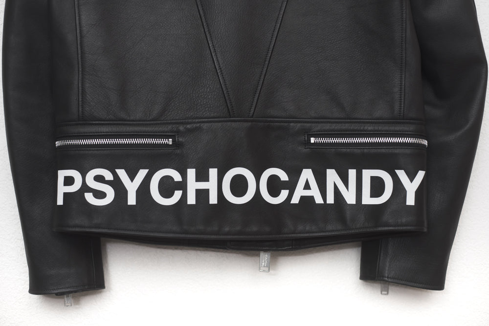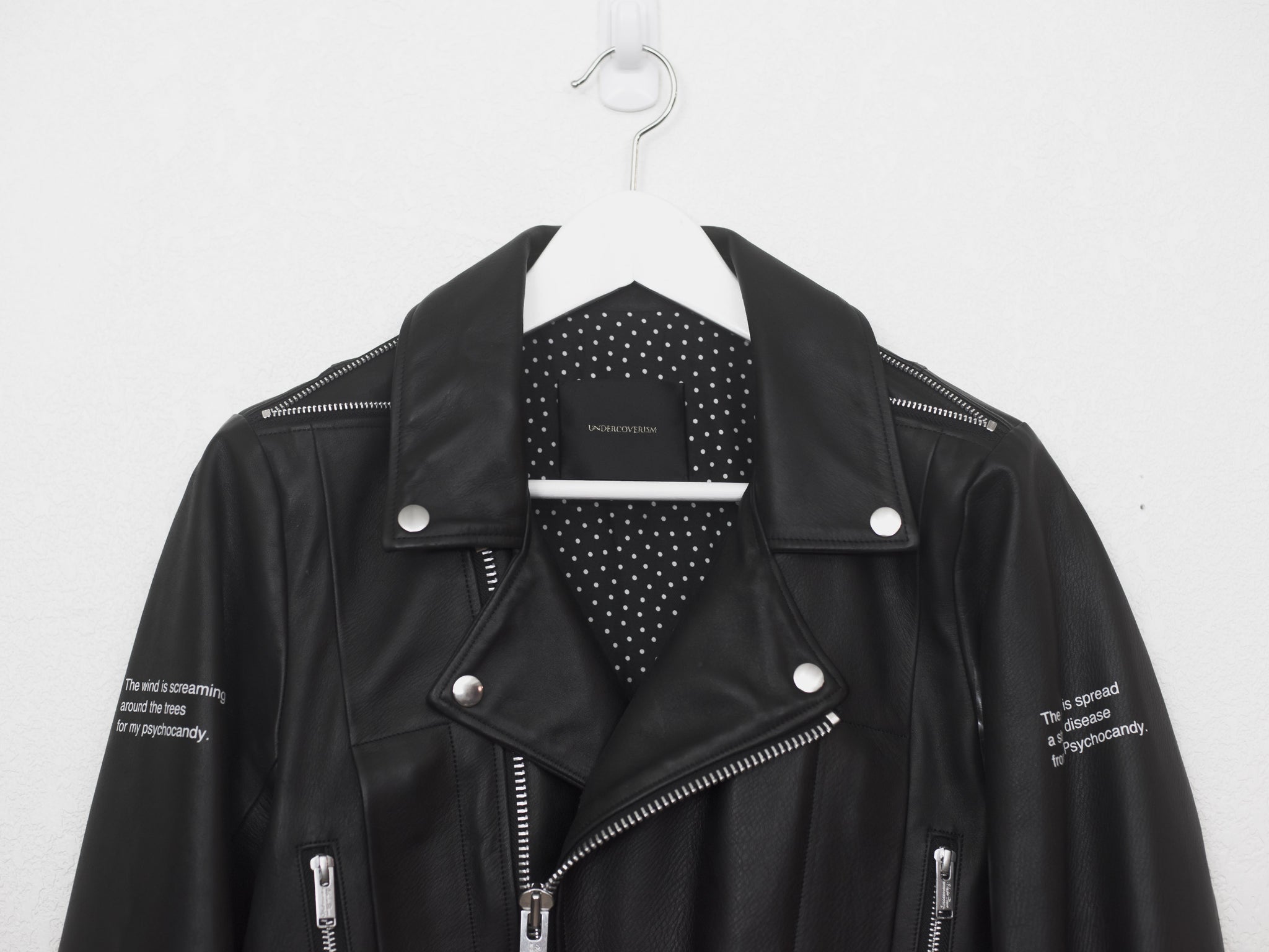 SS14 Psychocandy reflected Jun's well refined habit of adapting his interests into his clothing. Featured here is an incredible example in extremely supple horse leather featuring lyrics from Jesus and Mary Chain's Psychocandy on the sleeves, as well as the Psychocandy text on the back hem on a very unique biker jacket. The parallel offset zips and hidden panels serve as functional hand pockets while maintaining a sleek surface, and additionally visually balanced with two additional waist pockets and shoulder zip details for a total of six functional front pockets. Other details include chunky Undercoverism embossed YKK double zips, silky dotted black liner, and collar & waist snaps.