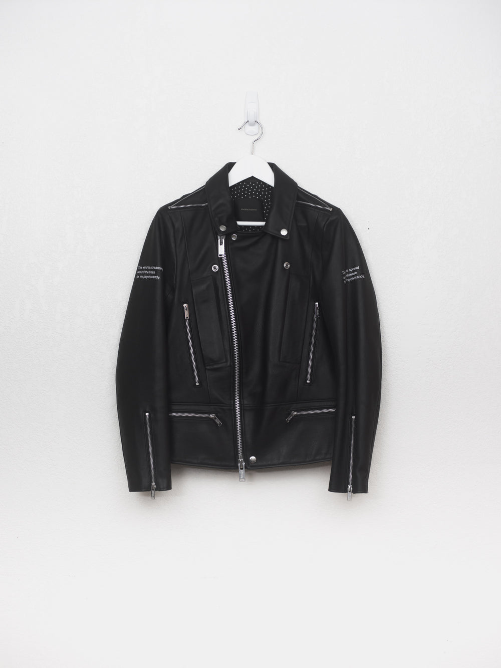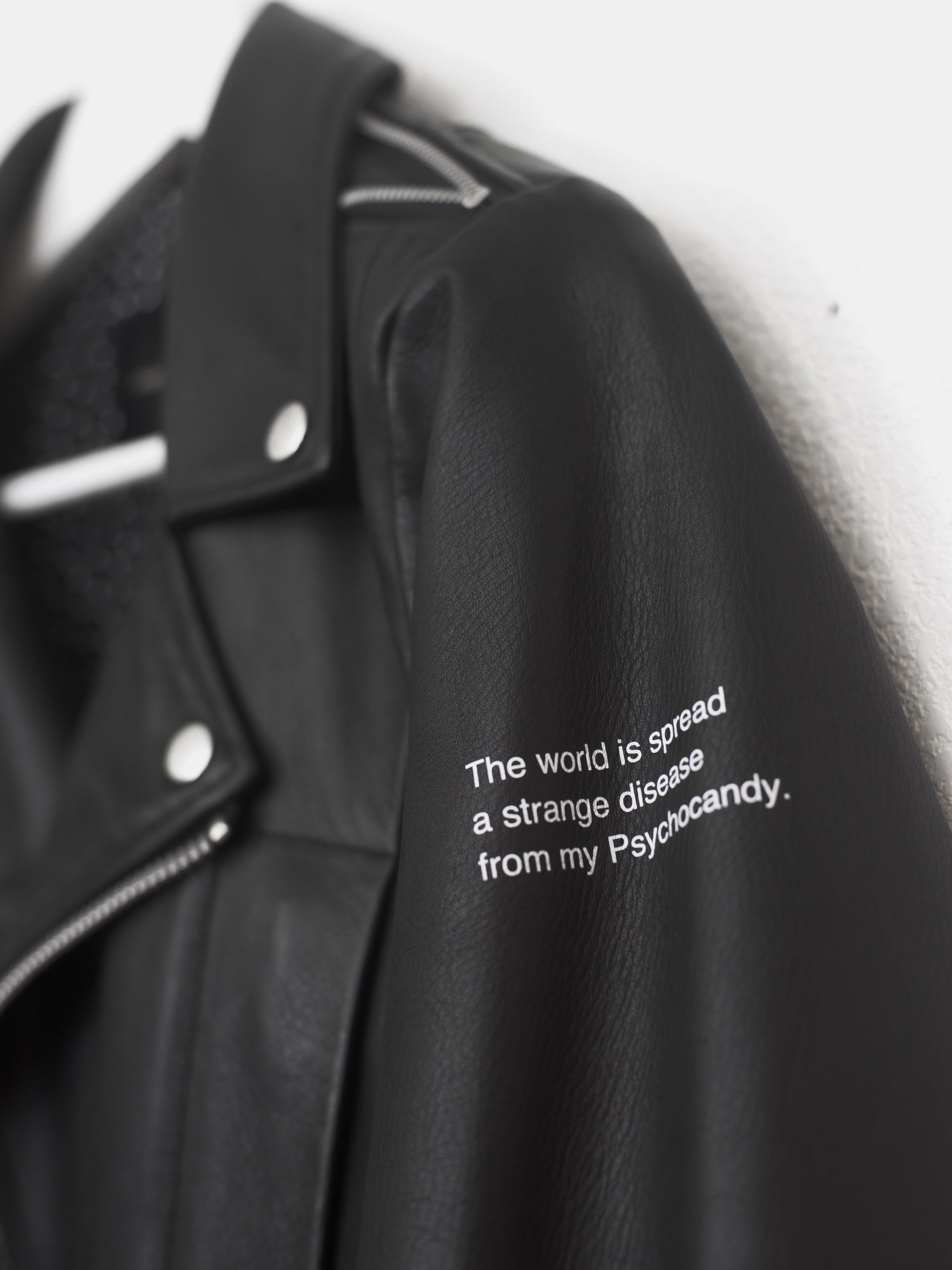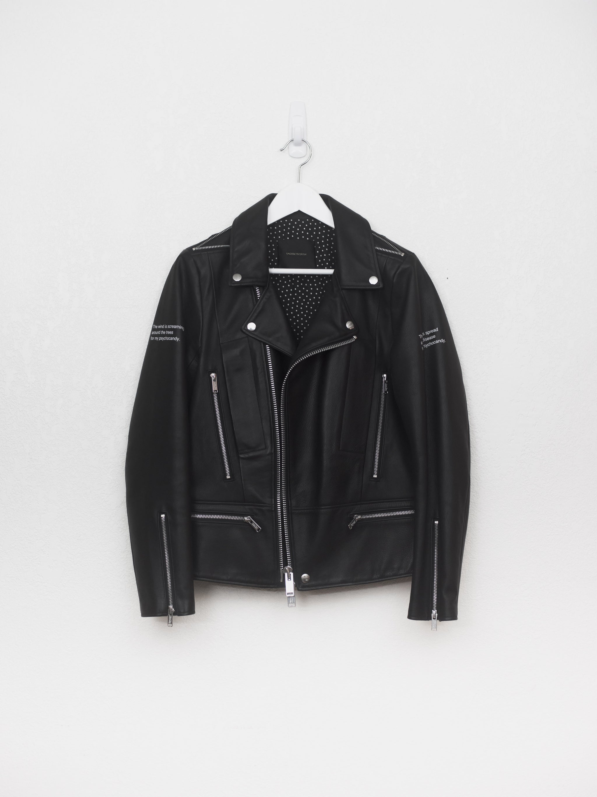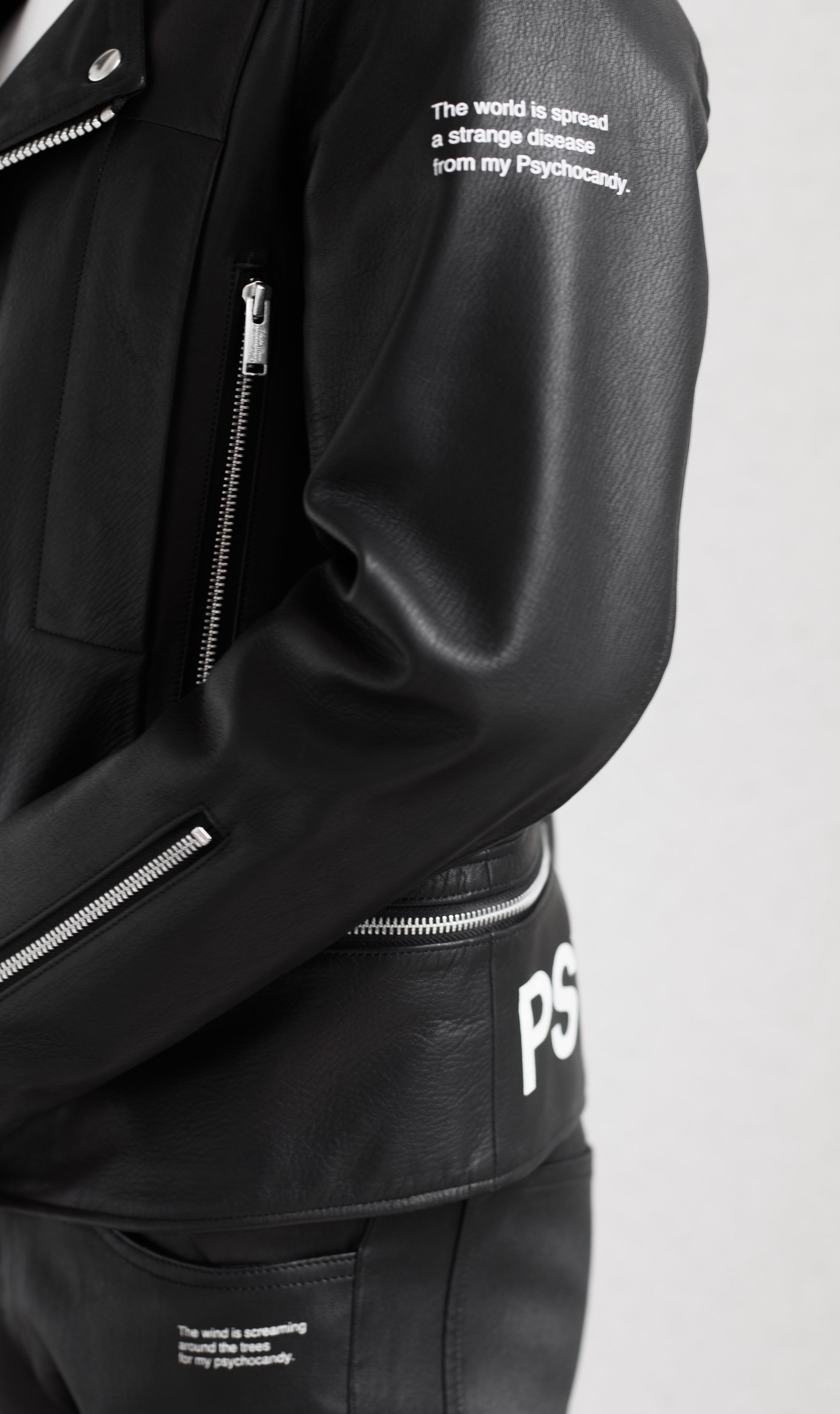 SS14 Psychocandy reflected Jun's well refined habit of adapting his interests into his clothing. Featured here is an incredible example in extremely supple horse leather featuring lyrics from Jesus and Mary Chain's Psychocandy on the sleeves, as well as the Psychocandy text on the back hem on a very unique biker jacket. The parallel offset zips and hidden panels serve as functional hand pockets while maintaining a sleek surface, and additionally visually balanced with two additional waist pockets and shoulder zip details for a total of six functional front pockets. Other details include chunky Undercoverism embossed YKK double zips, silky dotted black liner, and collar & waist snaps.