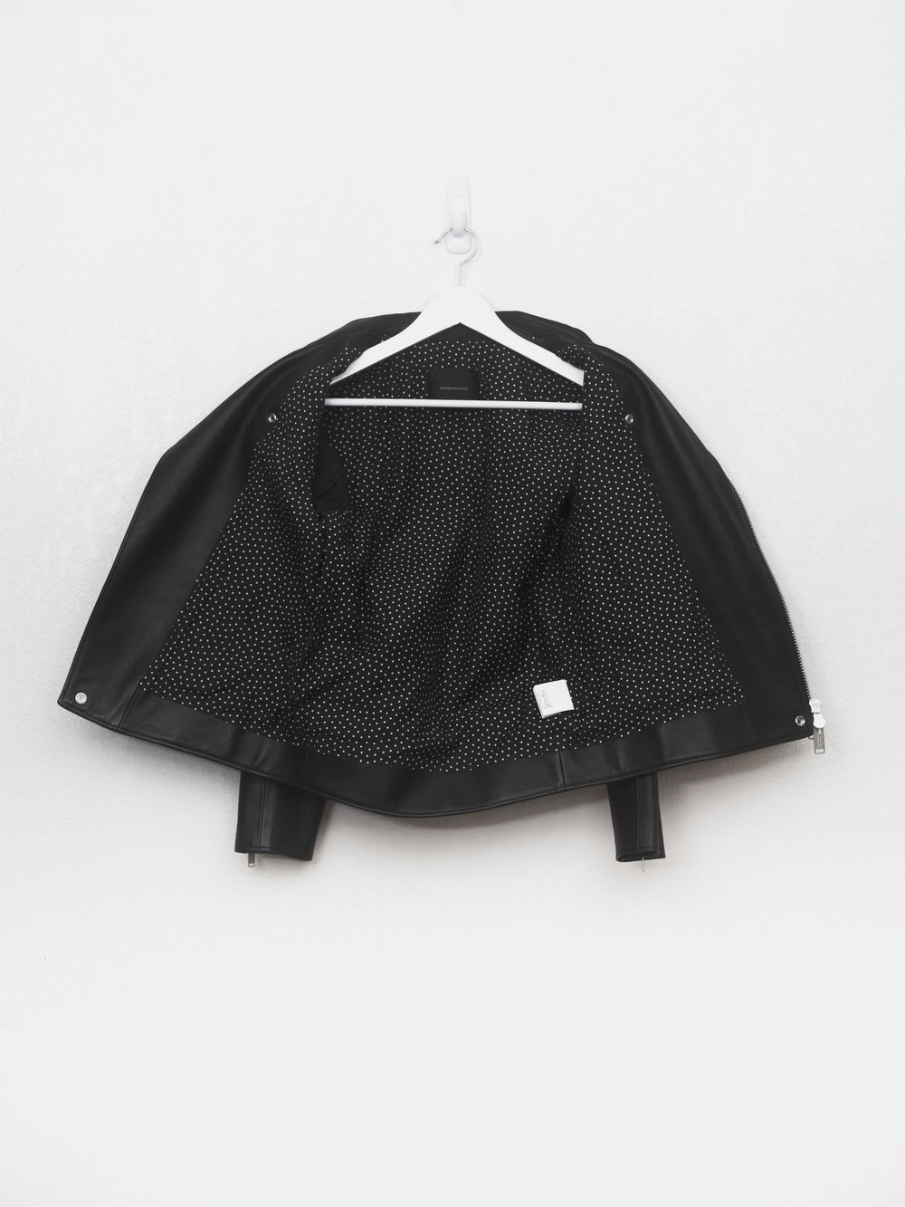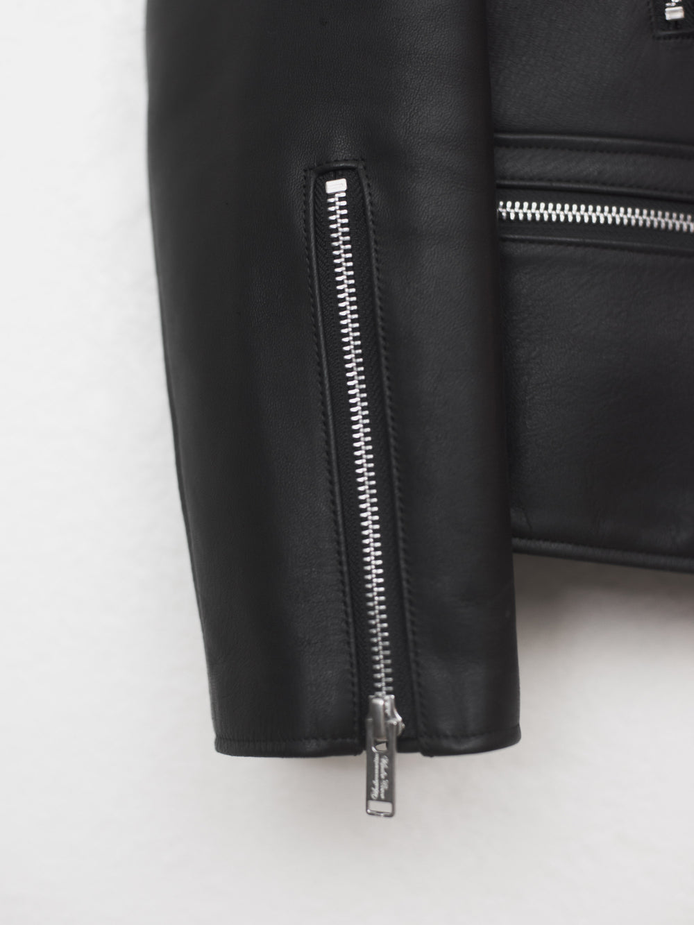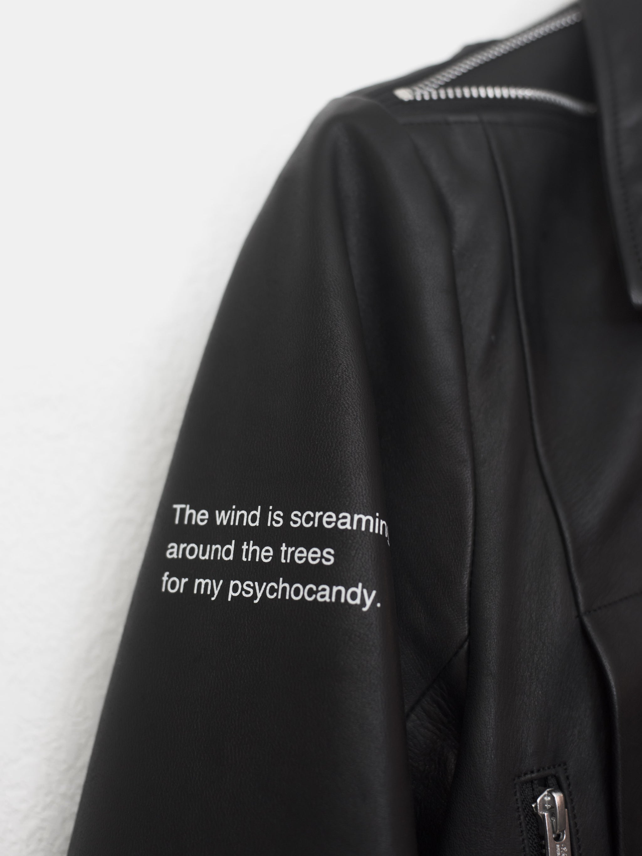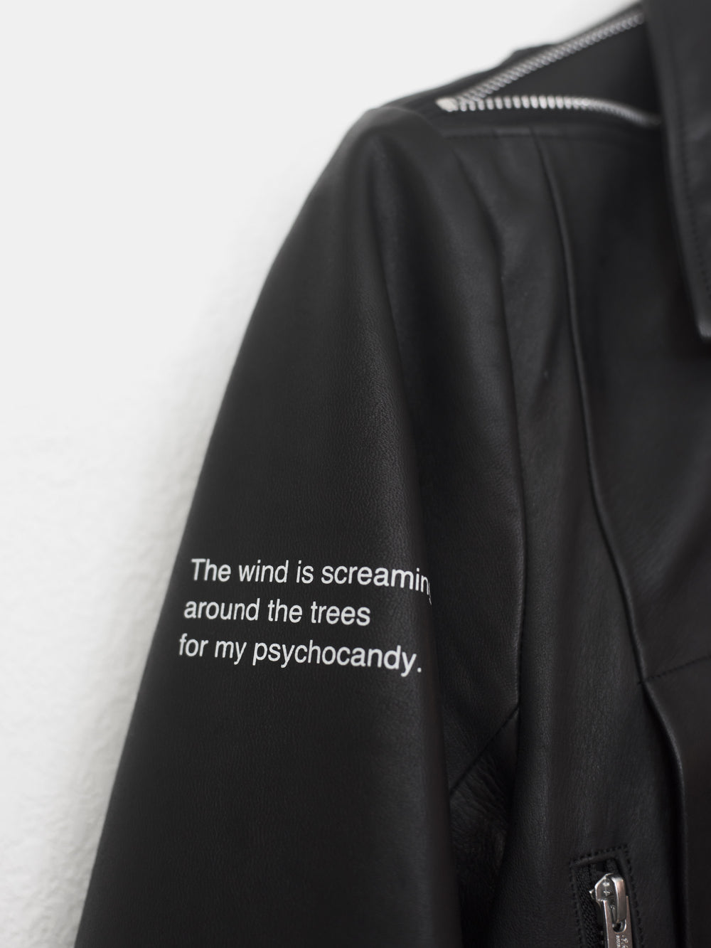 SS14 Psychocandy reflected Jun's well refined habit of adapting his interests into his clothing. Featured here is an incredible example in extremely supple horse leather featuring lyrics from Jesus and Mary Chain's Psychocandy on the sleeves, as well as the Psychocandy text on the back hem on a very unique biker jacket. The parallel offset zips and hidden panels serve as functional hand pockets while maintaining a sleek surface, and additionally visually balanced with two additional waist pockets and shoulder zip details for a total of six functional front pockets. Other details include chunky Undercoverism embossed YKK double zips, silky dotted black liner, and collar & waist snaps.