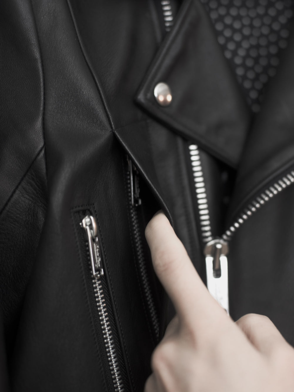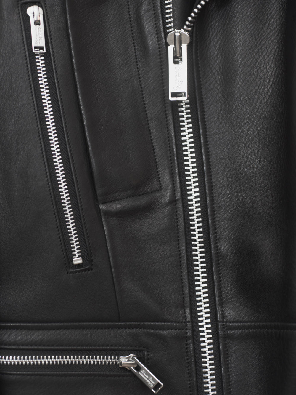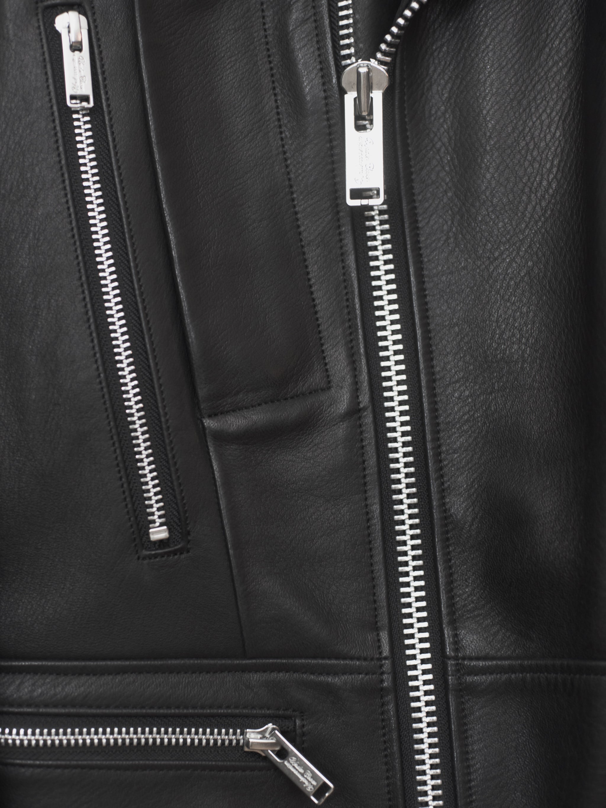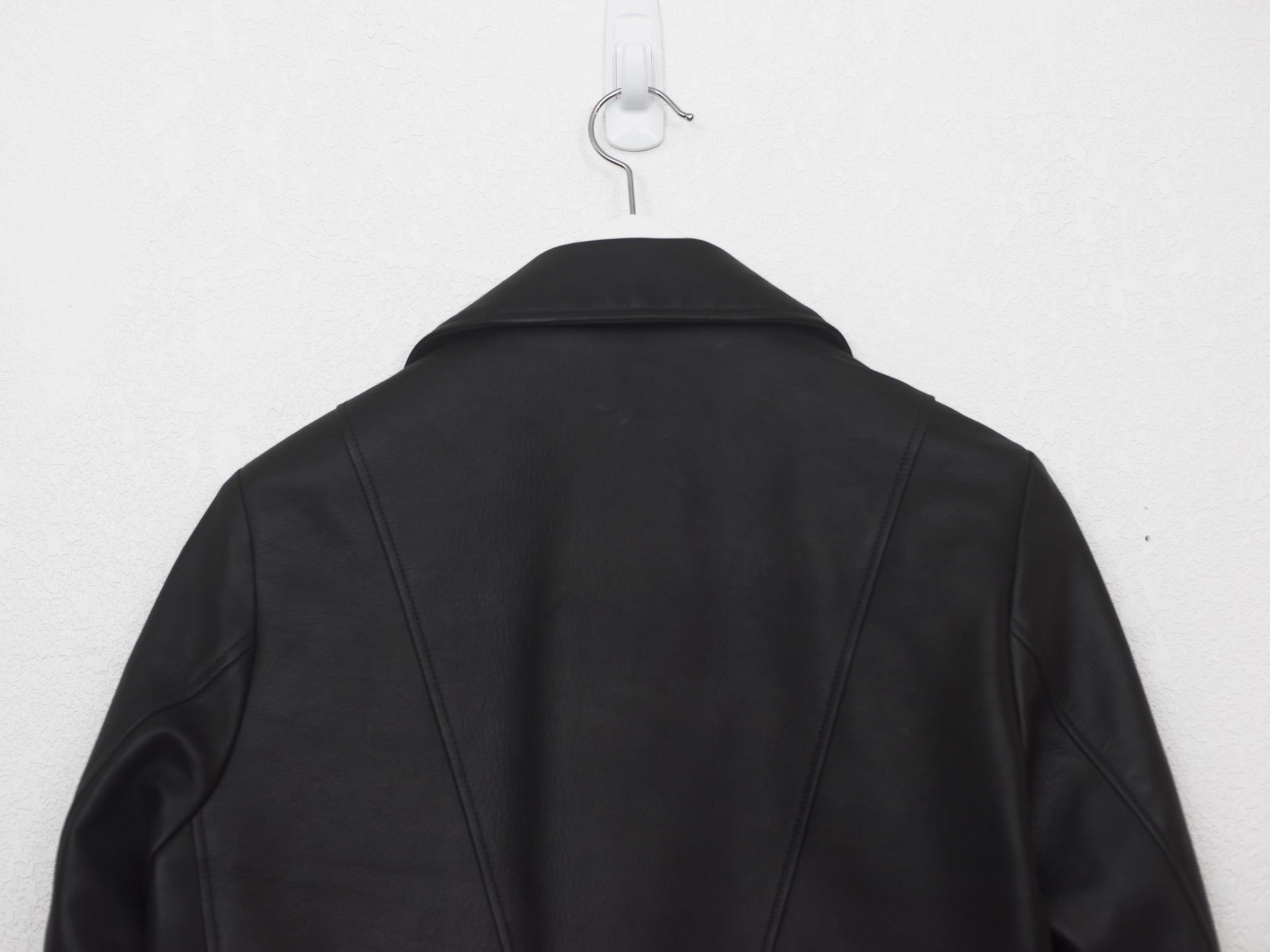 SS14 Psychocandy reflected Jun's well refined habit of adapting his interests into his clothing. Featured here is an incredible example in extremely supple horse leather featuring lyrics from Jesus and Mary Chain's Psychocandy on the sleeves, as well as the Psychocandy text on the back hem on a very unique biker jacket. The parallel offset zips and hidden panels serve as functional hand pockets while maintaining a sleek surface, and additionally visually balanced with two additional waist pockets and shoulder zip details for a total of six functional front pockets. Other details include chunky Undercoverism embossed YKK double zips, silky dotted black liner, and collar & waist snaps.